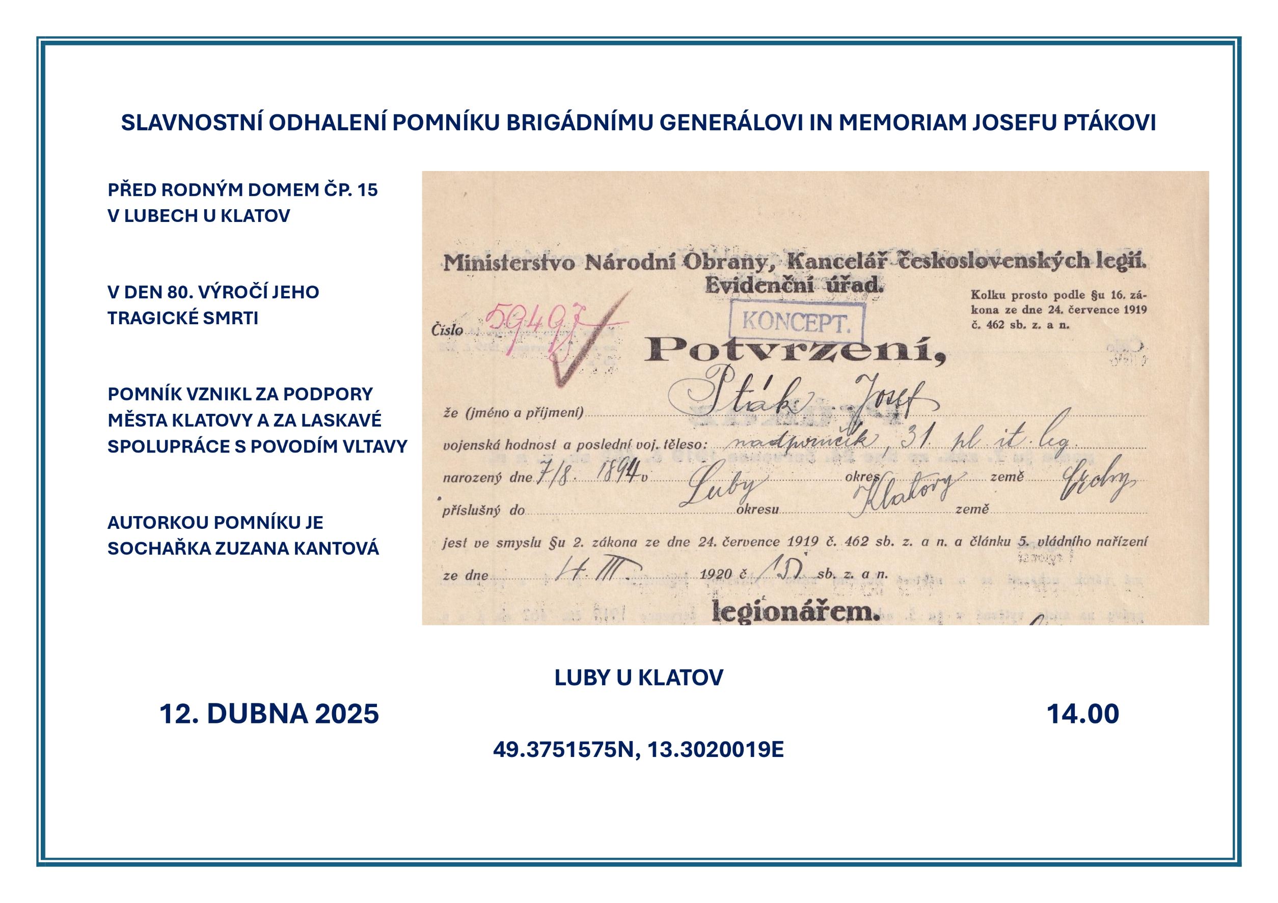 Slavnostní odhalení pomníku Josefu Ptákovi