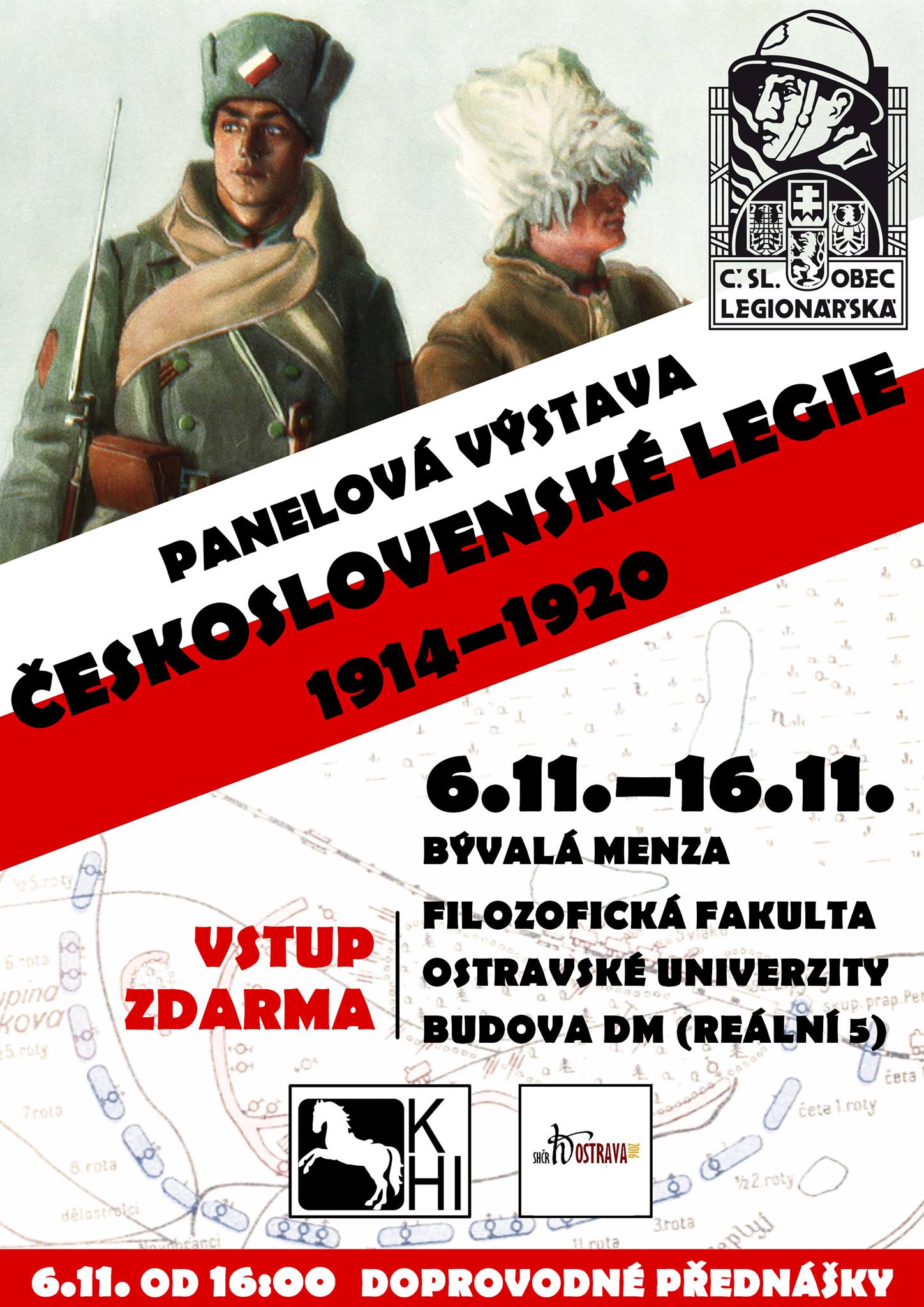 Ve dnech 6. 11. až 16. 11. bude v prostorách bývalé menzy Ostravské univerzity (budova DM Filozofické fakulty, Reální 5) k vidění panelová výstava věnovaná československým legiím v letech 1914-1920.