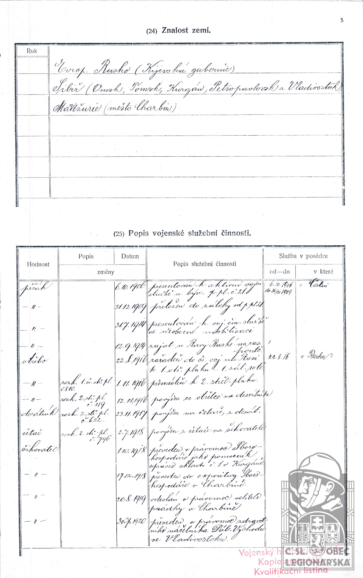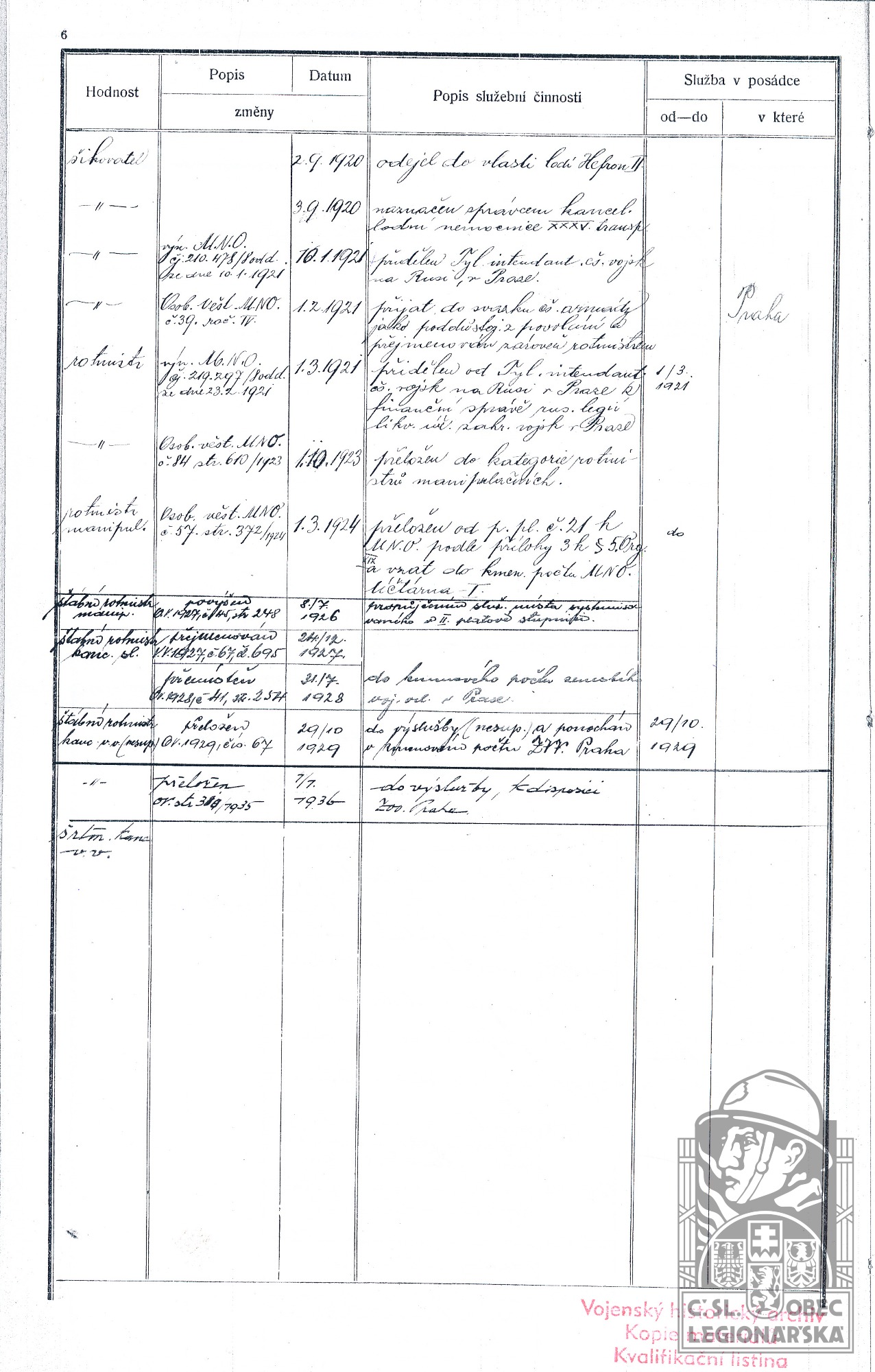 Zdroj informací: legionářský poslužný spis osobní karta legionáře