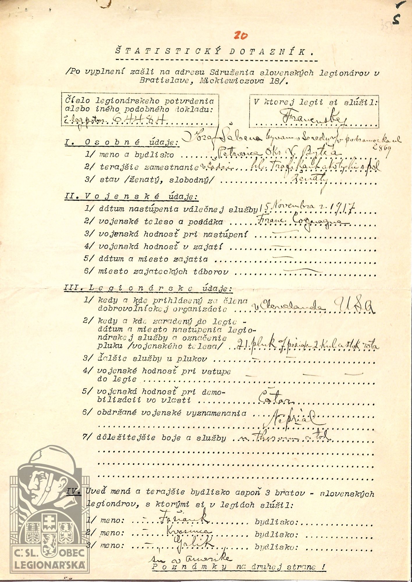 Zdroj informací: legionářský poslužný spis osobní karta legionáře