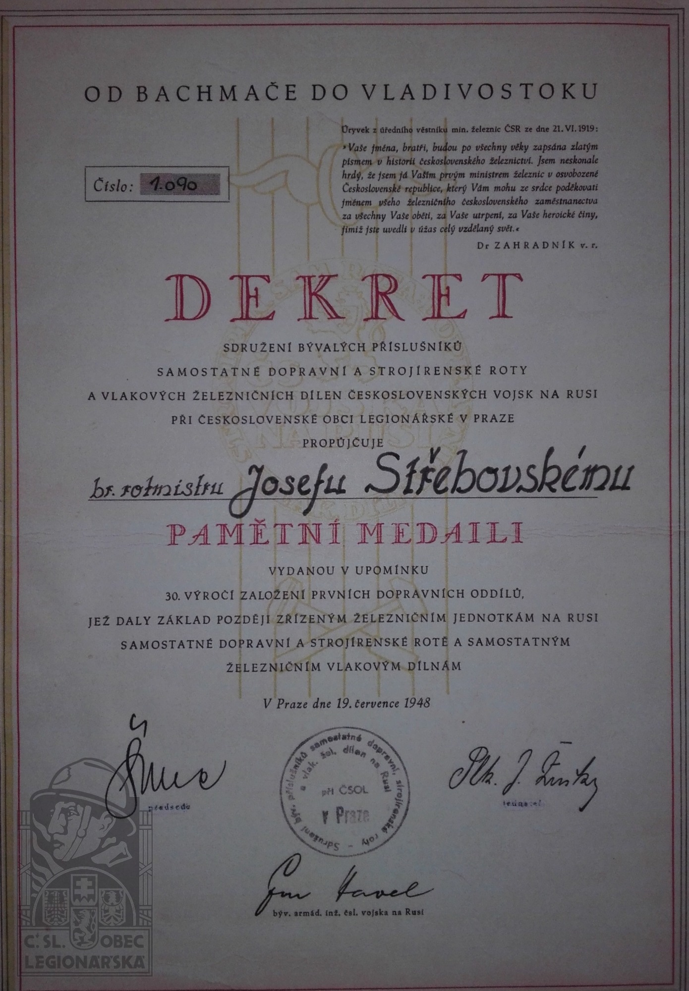 Status legionáře mu byl odebrán zákonem 462/1919 Sb., podle kterého jsou legionáři pouze vojáci, kteří vstoupili do československé armády před 28. říjnem 1918.