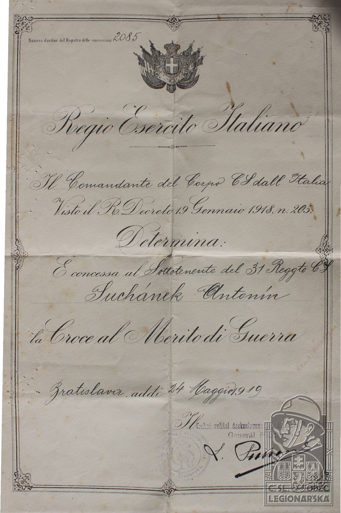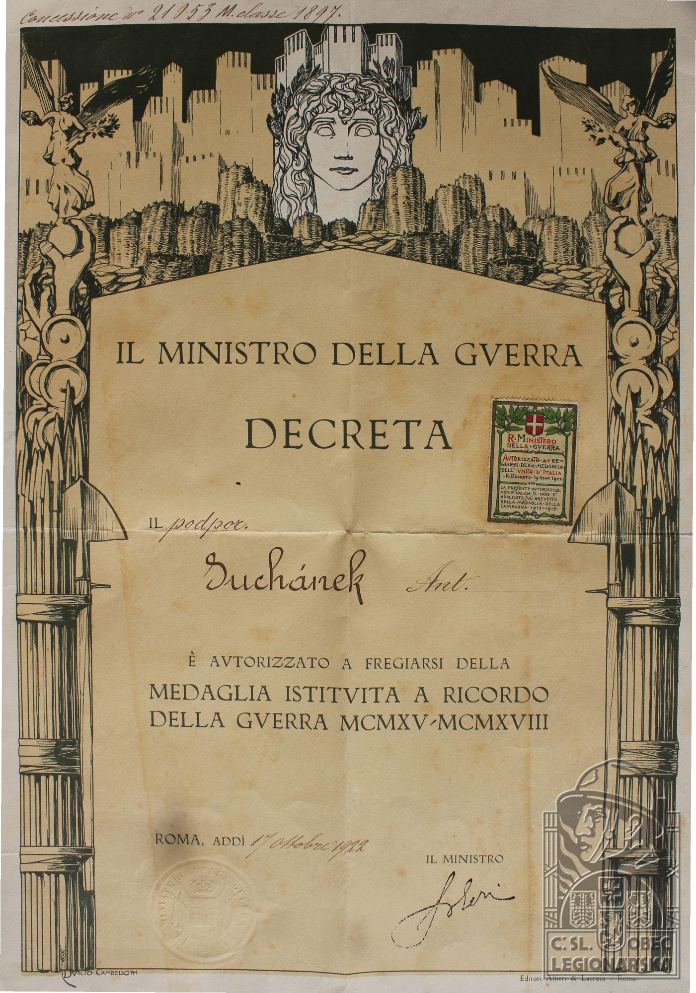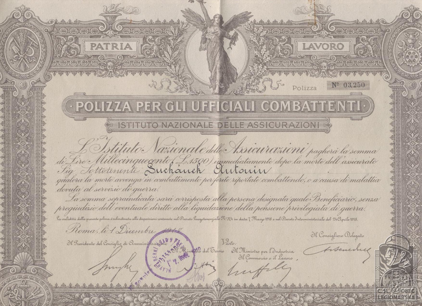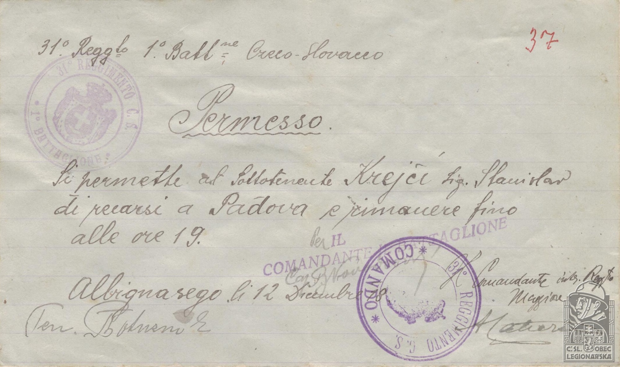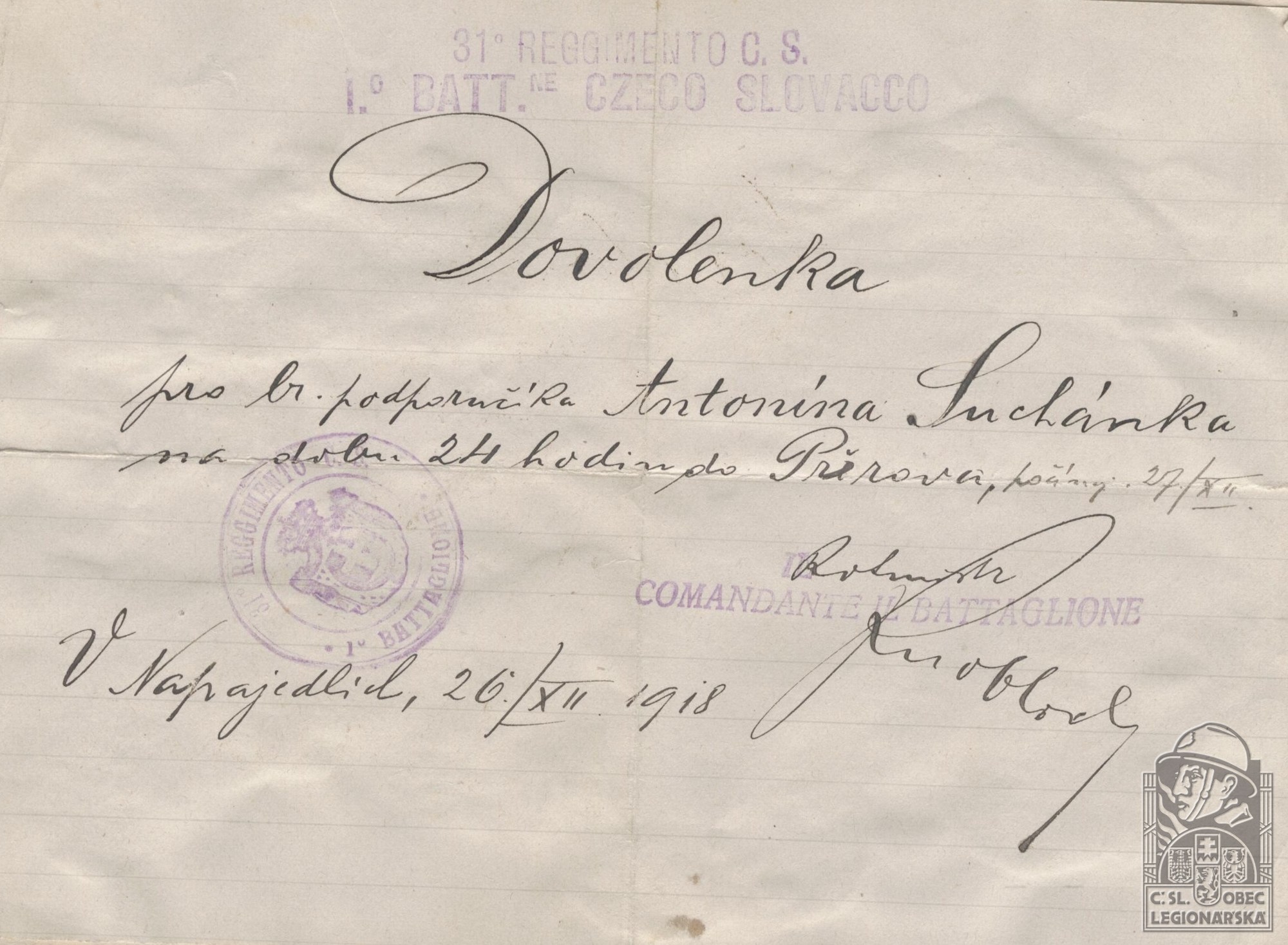 Jednotka v době zařazení:39.p.pl. ( Čs. legie v Itálii )