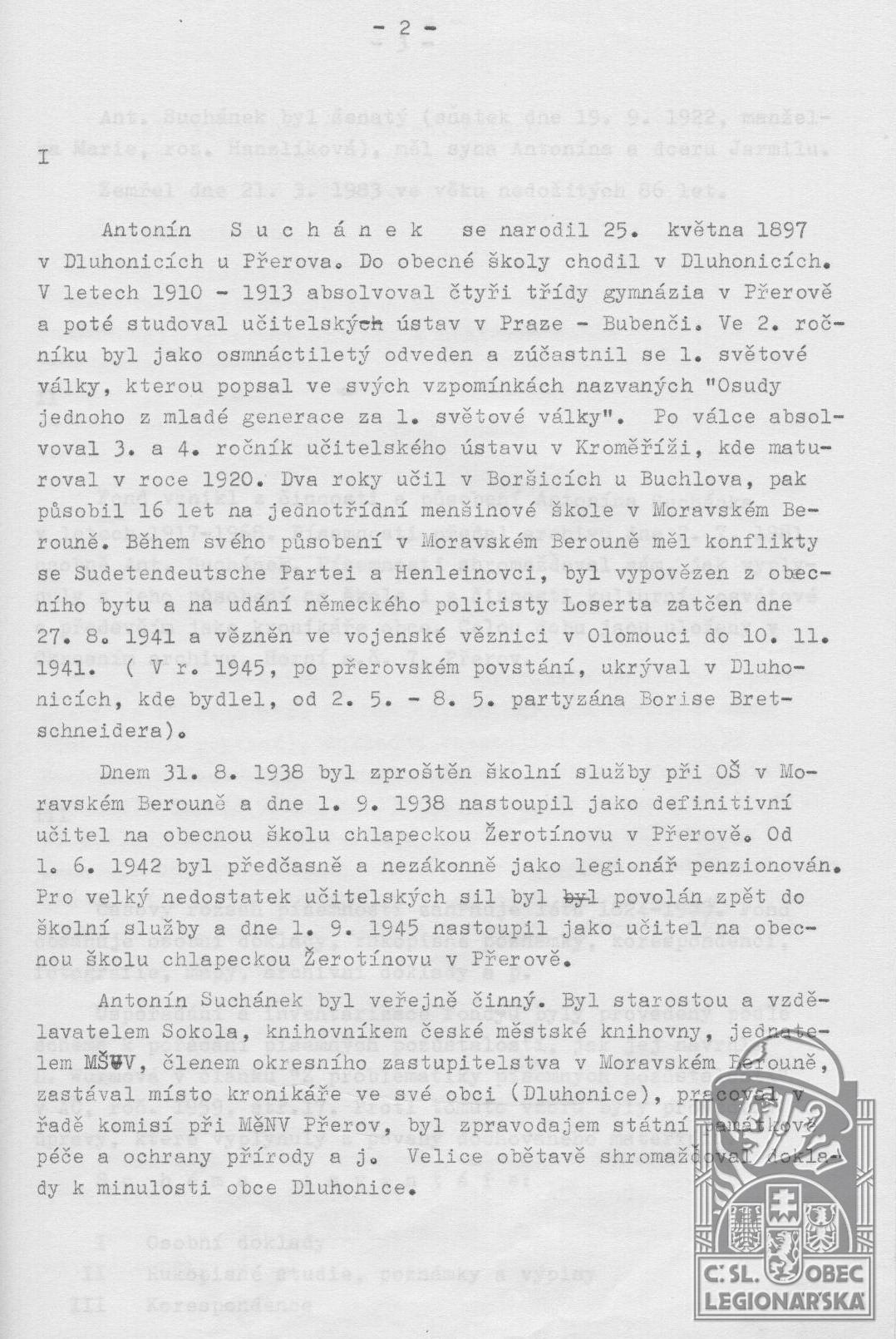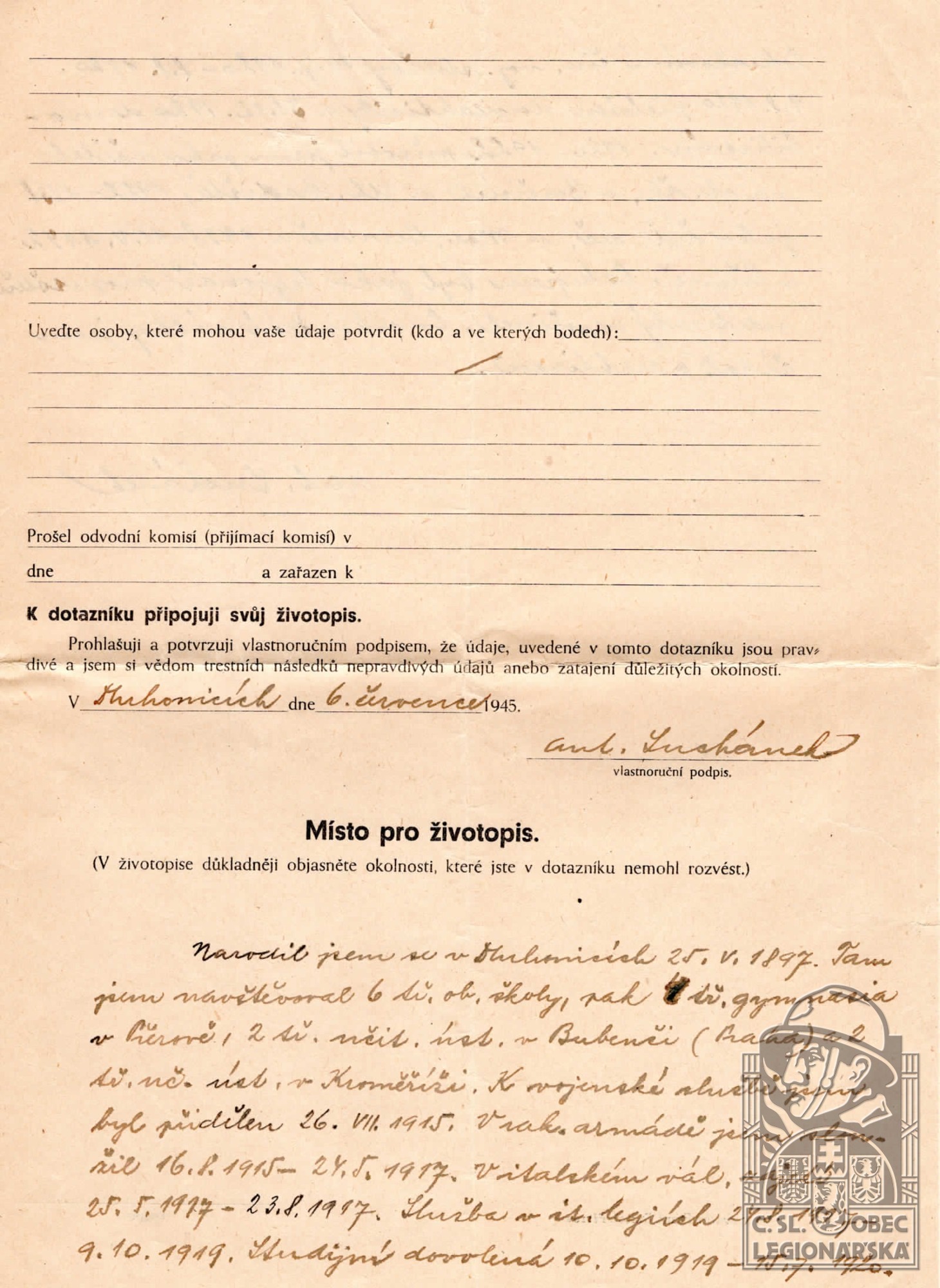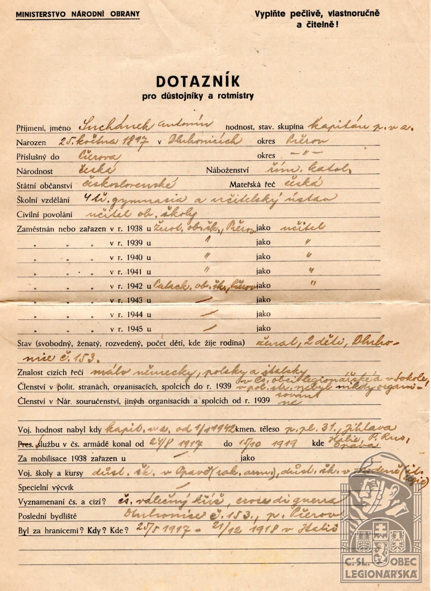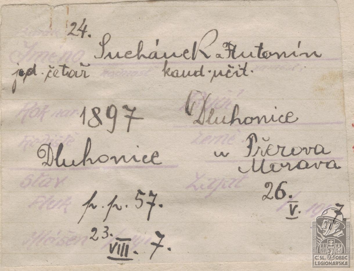 Zdroj informací: legionářský poslužný spis osobní karta legionáře