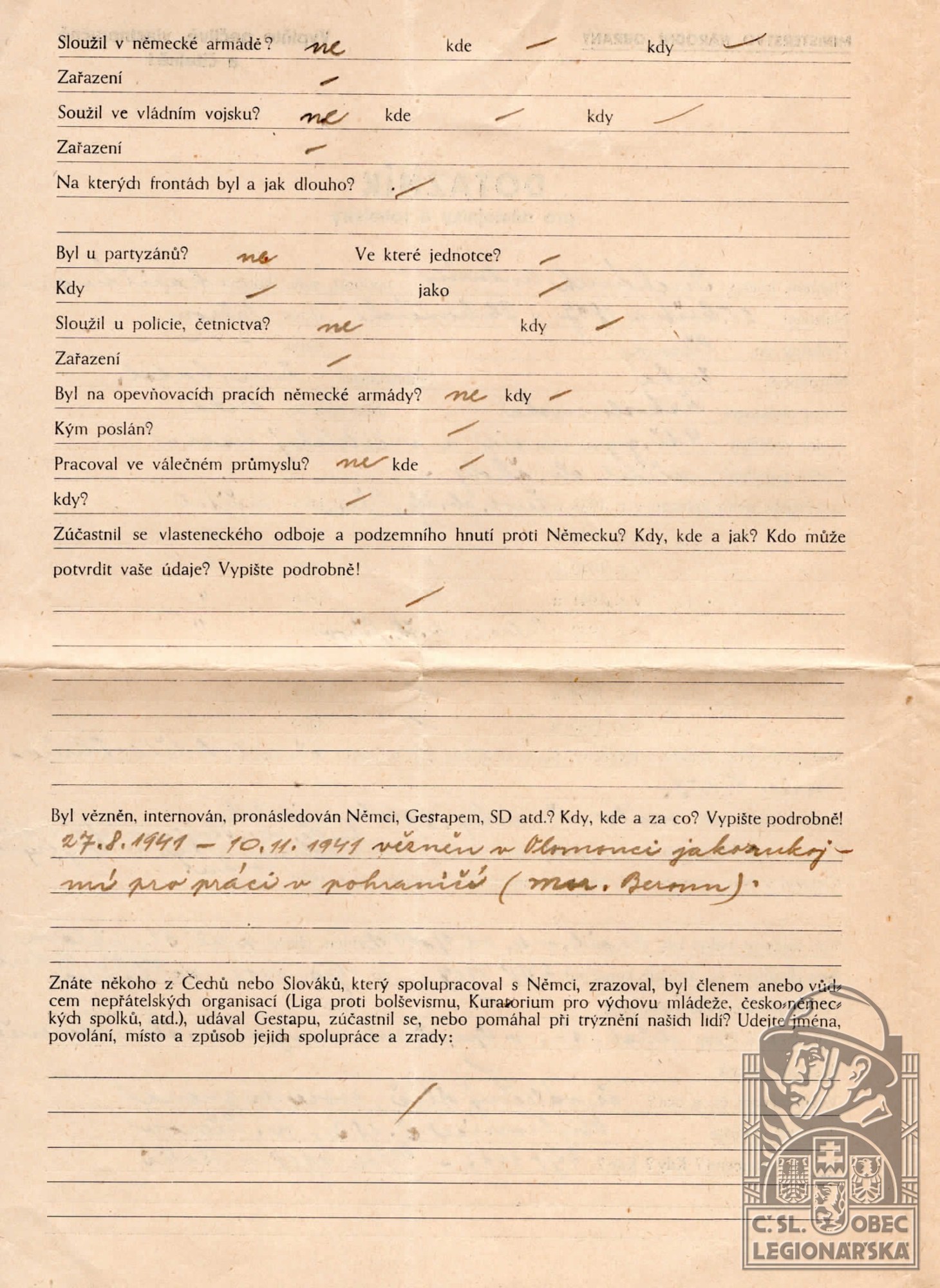 Vězněn za nacistické okupace:27.81941-10.11.1941 Olomouc