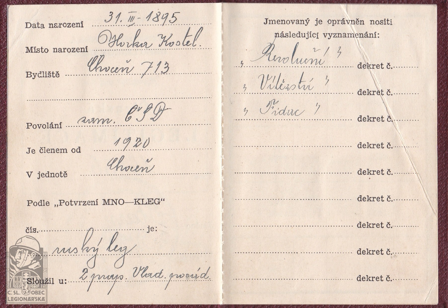 Zdroj informací: legionářský poslužný spis osobní karta legionáře