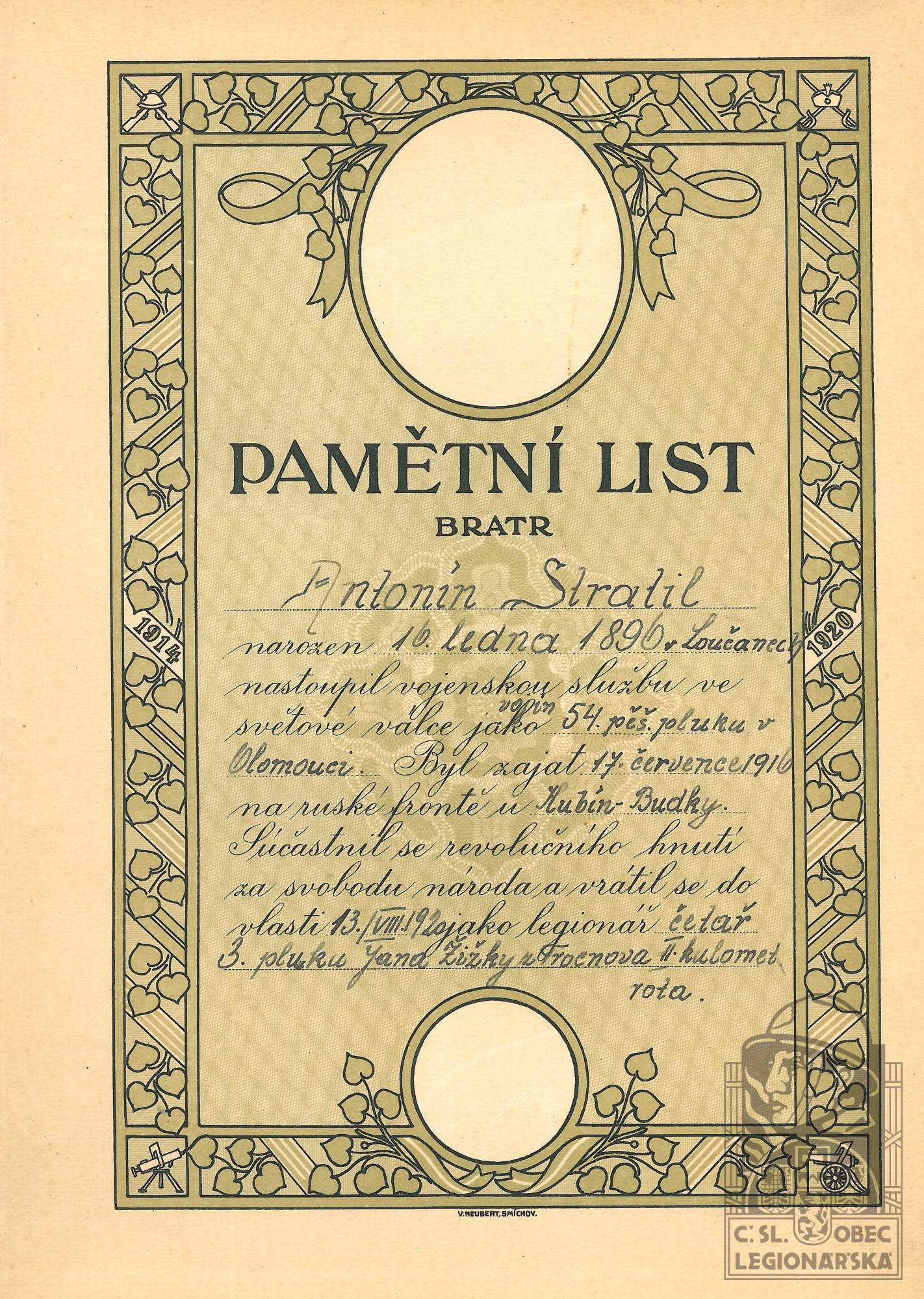 Zdroj informací: legionářský poslužný spis osobní karta legionáře