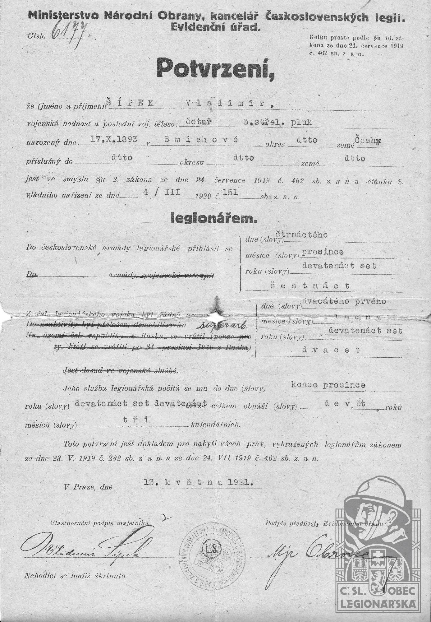 Do rakousko-uherské armády vstoupil v roce 1914 k 35. pěšímu pluku. Jeho bratr Jan Šípek rovněž narukoval a padl na začátku války v Haliči. Byl zajat v listopadu 1914 u Krakova a do legií se přihlásil v prosinci 1916. Účastnil se bitvy u Zborova, kde utrpěl zranění střepinou granátu do levé holeně. Následně strávil nějaký čas ve vojenském lazaretu odkud je jedna z přiložench fotografií. Dle vyprávění strávil Vladimír Šípek také nejméně 2 roky ve vyhnanství na Sibiři, kam se dostal jako zajatý legionář ještě s jedním bratrem. Pokus o útěk se jim nezdařil, protože utéci nebylo kam. Dobrovolně se vrátili zpět do vsi, protože okolo byla jen samá tajga. Dosal se odtud až když byli všichni legionáři stahováni k odsunu zpět domů (s generálem Vašátkem). Vracel se jižní cestou přes Charbin a USA. Vzpomínal rád na přivítání legionářů v San Diegu, odkud si přivezl místní noviny s pochodujícími legionáři na titulní straně.