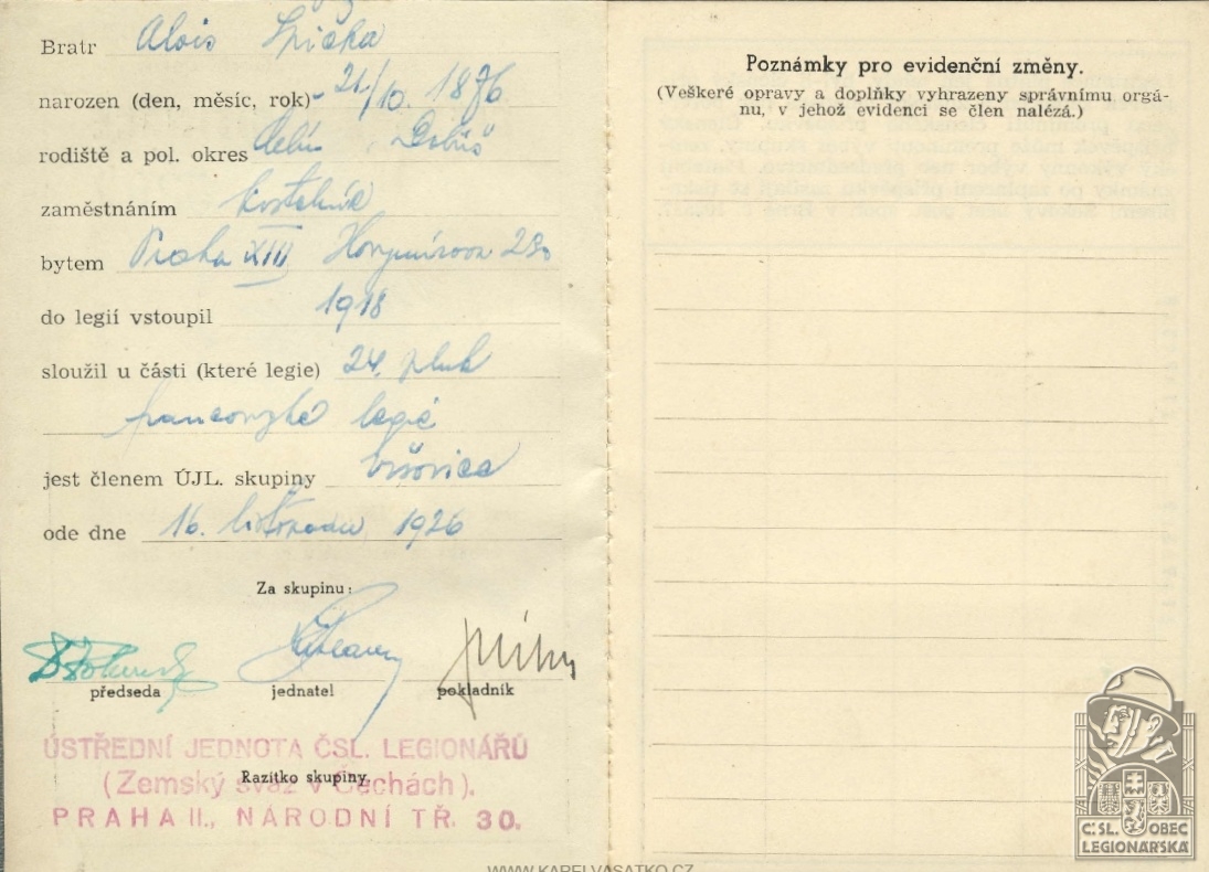 Zdroj informací: legionářský poslužný spis osobní karta legionáře