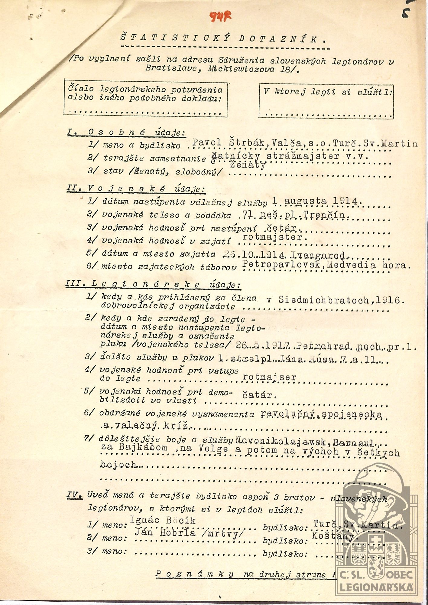Zdroj informací: legionářský poslužný spis osobní karta legionáře