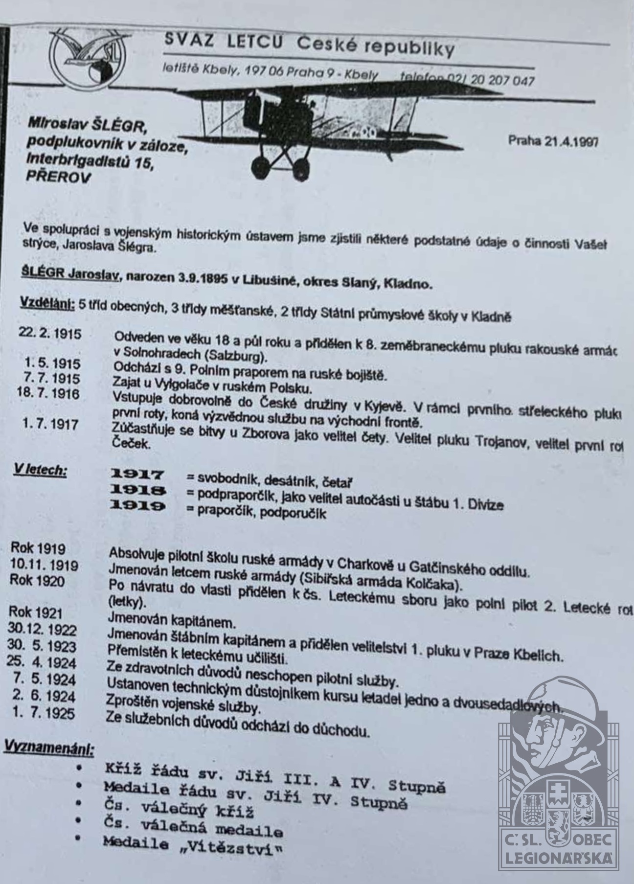 Zdroj informací: legionářský poslužný spis osobní karta legionáře