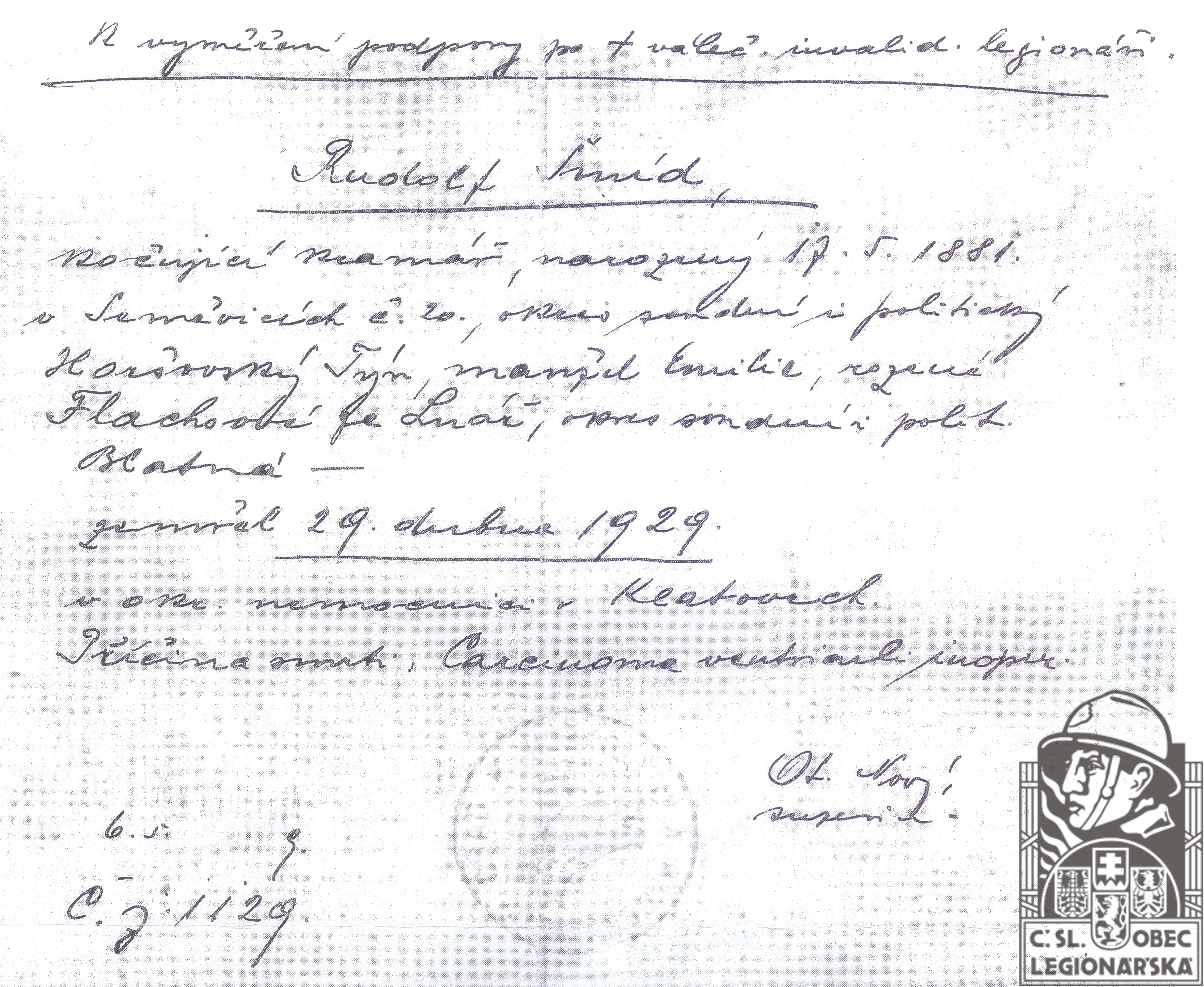 Životopis:Rudolf Šmíd pocházel z loutkářské rodiny, před vypuknutím 1. světové války se živil jako artista-gymnastik, atlet a provozoval kolotoč. Dne 9. ledna 1907 se oženil s Emilii Flachsovou z Lnářů, jejíž otec byl také loutkář. Měli spolu tři děti, přičemž Karolína a Emanuel se narodily před a Josef po válce. Do té Rudolf Šmíd vstoupil v řadách praporu polních myslivců č. 6 již po jejím vypuknutí, v listopadu 1914 padl u Jasla do ruského zajetí. Do čs. legií vstoupil v lednu 1919 a byl přidělen k 11. stř. pluku. Během bojů přišle o prst, když se mu při střelbě roztrhla puška. Po návratu do republiky se živil jako kočující kramář-stánkař. Zemřel na rakovinu žaludku v klatovské městské nemocnici.