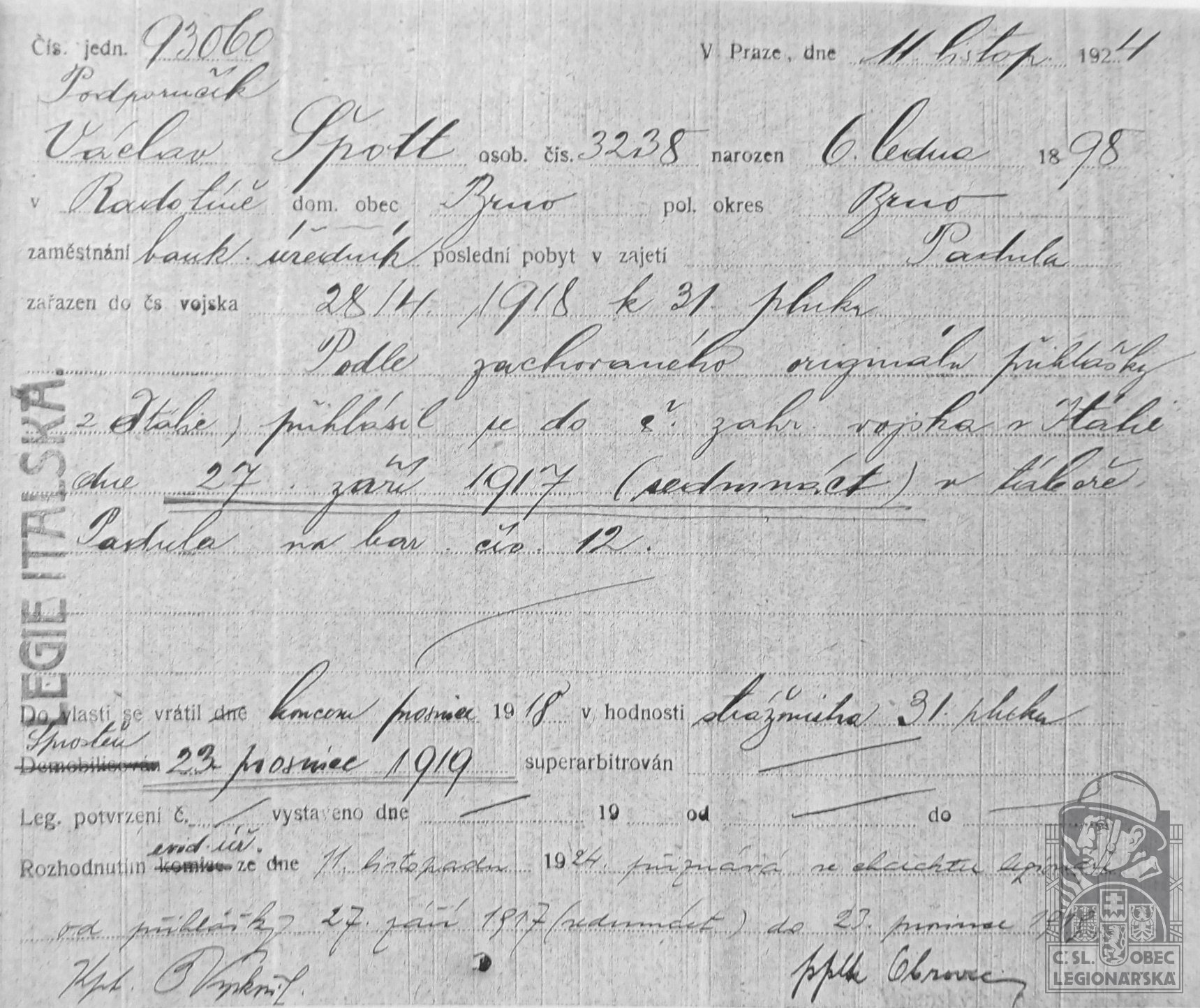 Jednotka v době zařazení:35.p.pl. ( Čs. legie v Itálii )