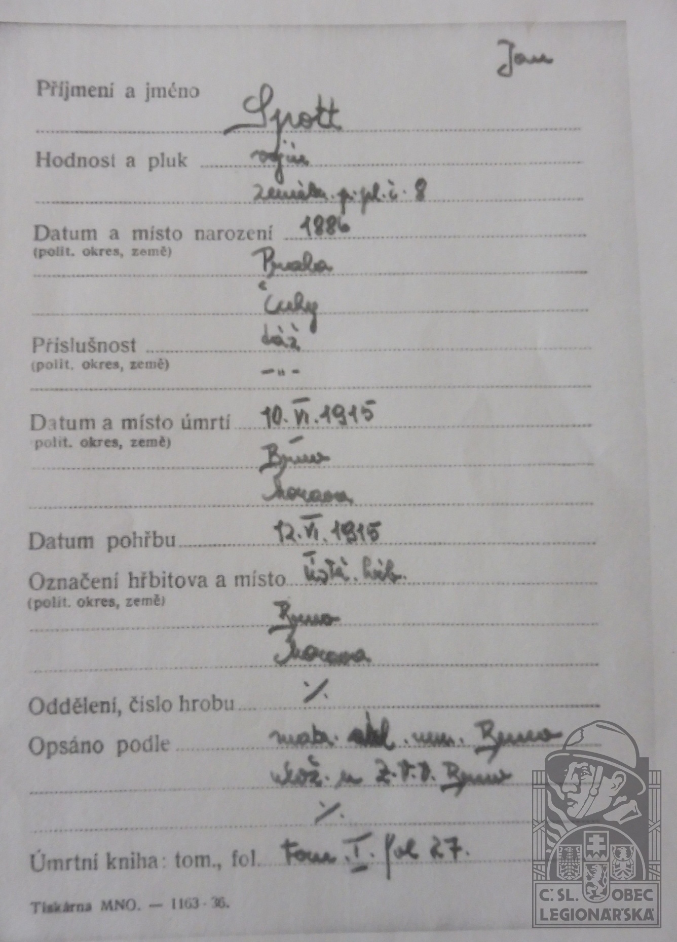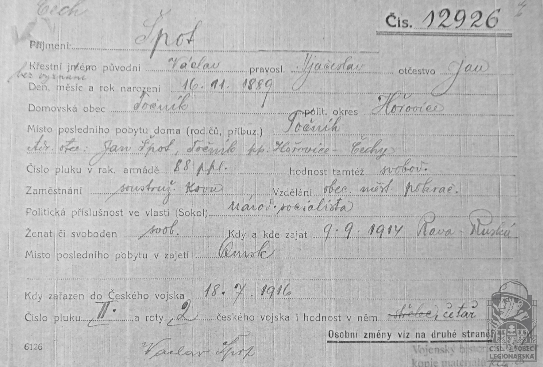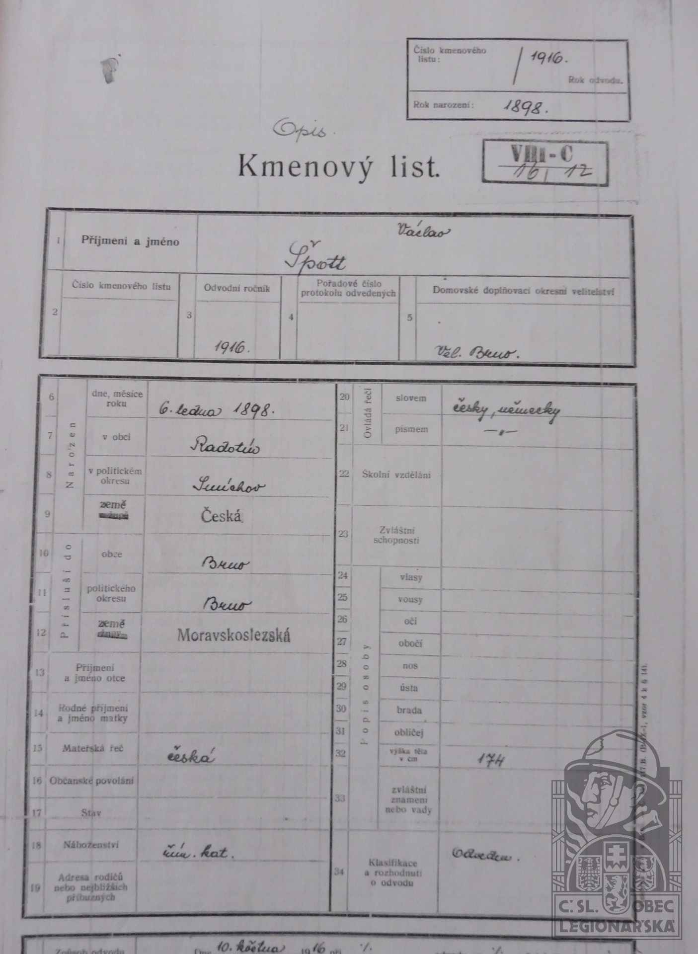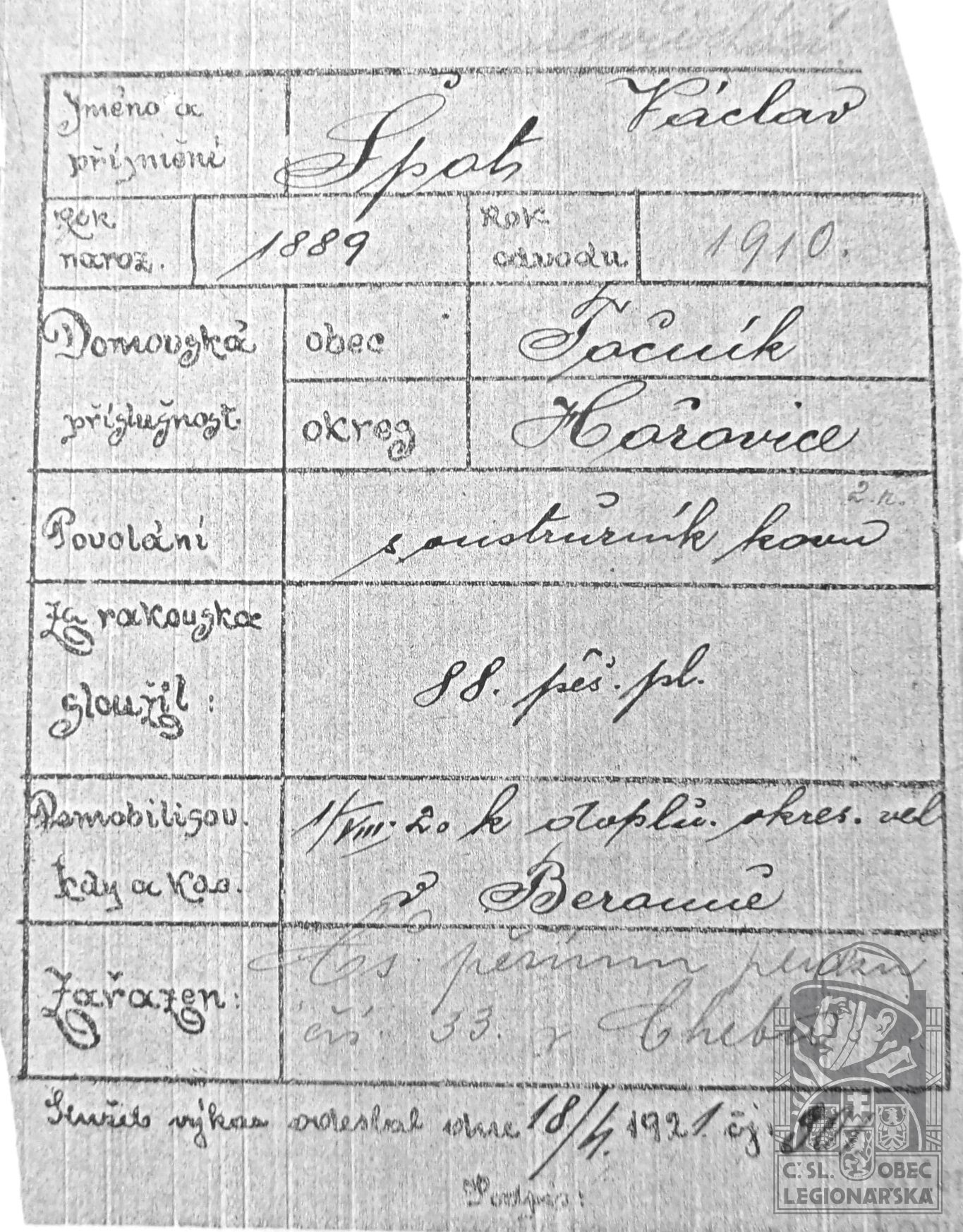 Zdroj informací: legionářský poslužný spis osobní karta legionáře