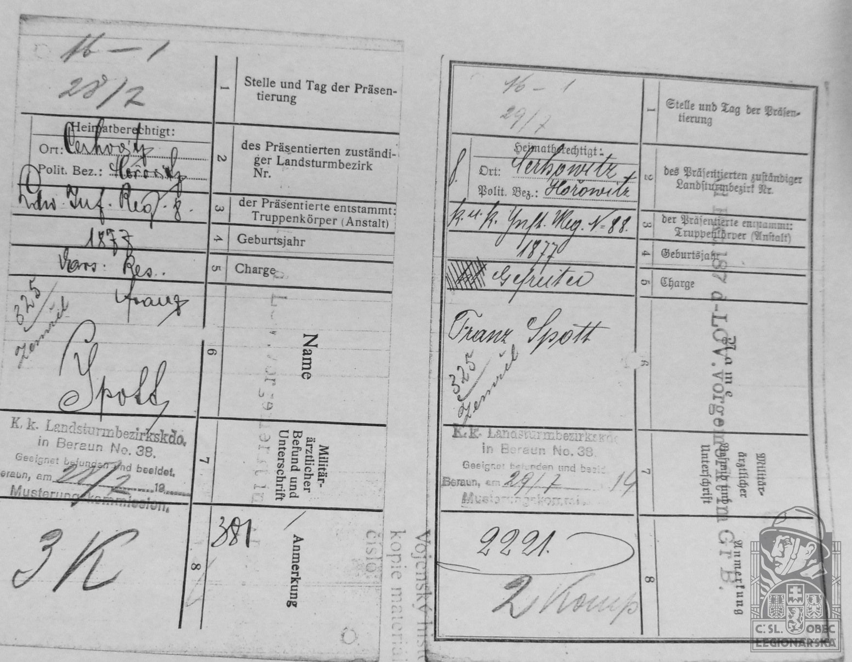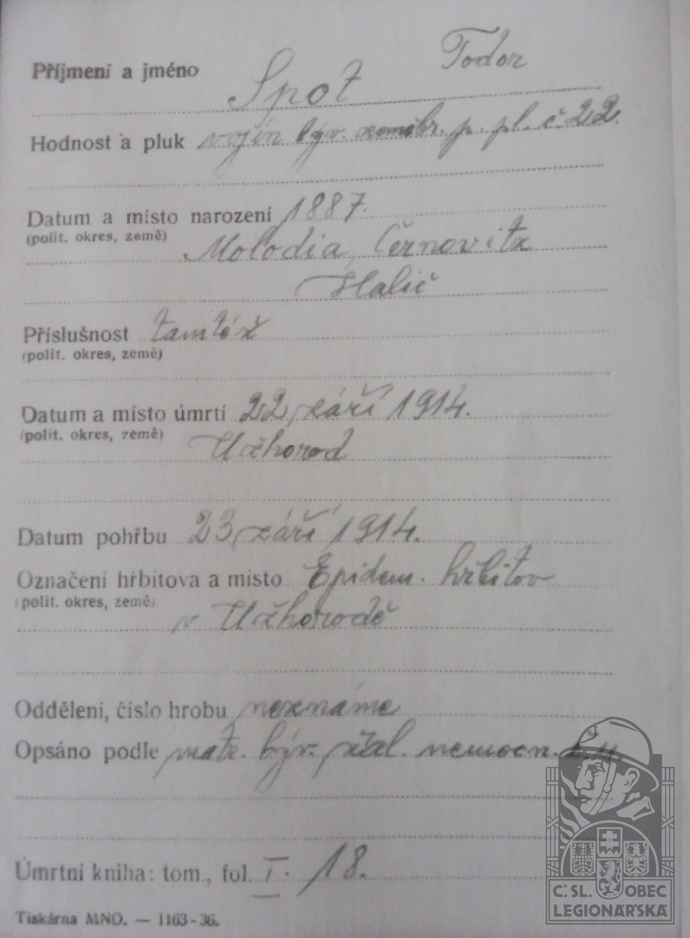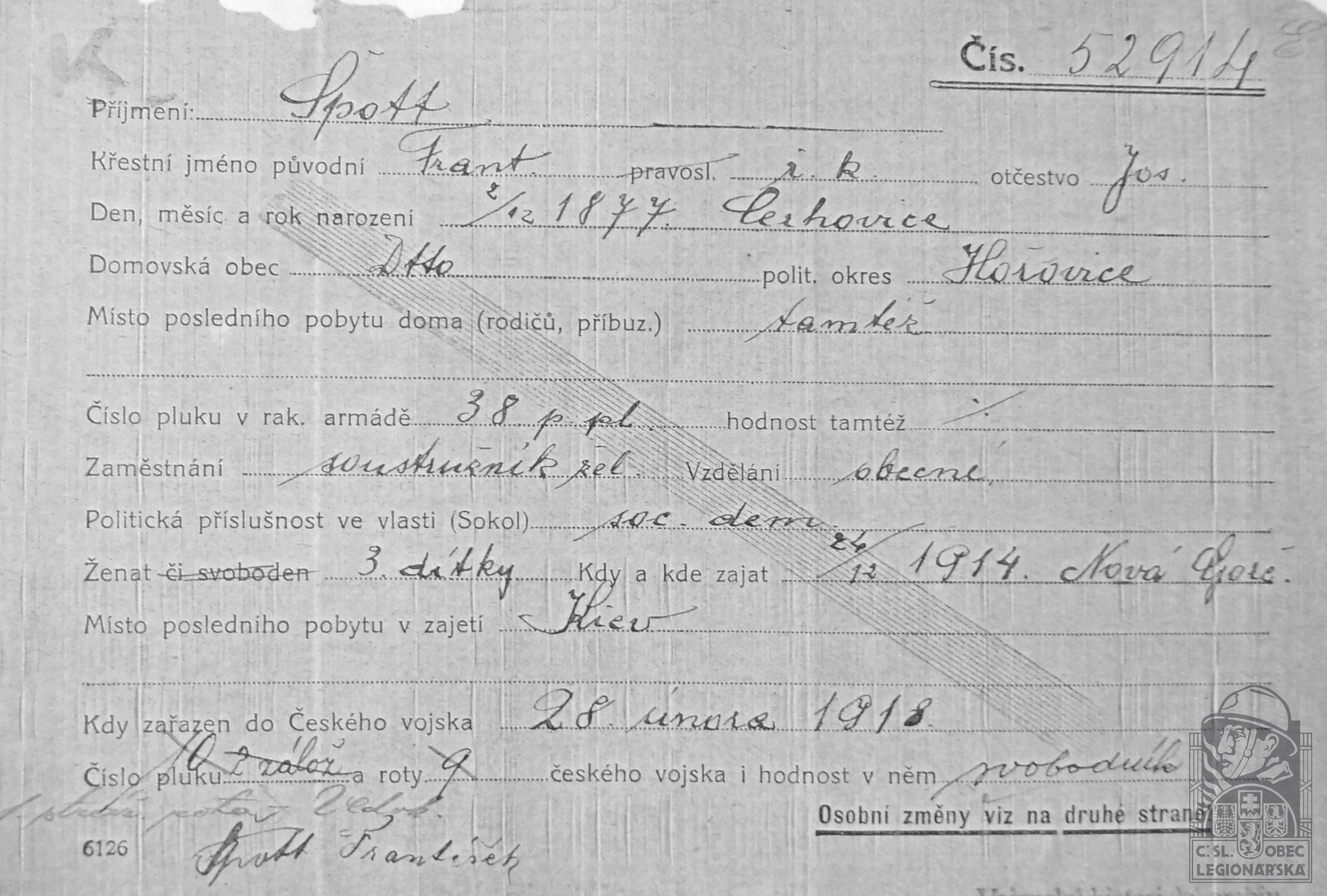 Zdroj informací: legionářský poslužný spis osobní karta legionáře