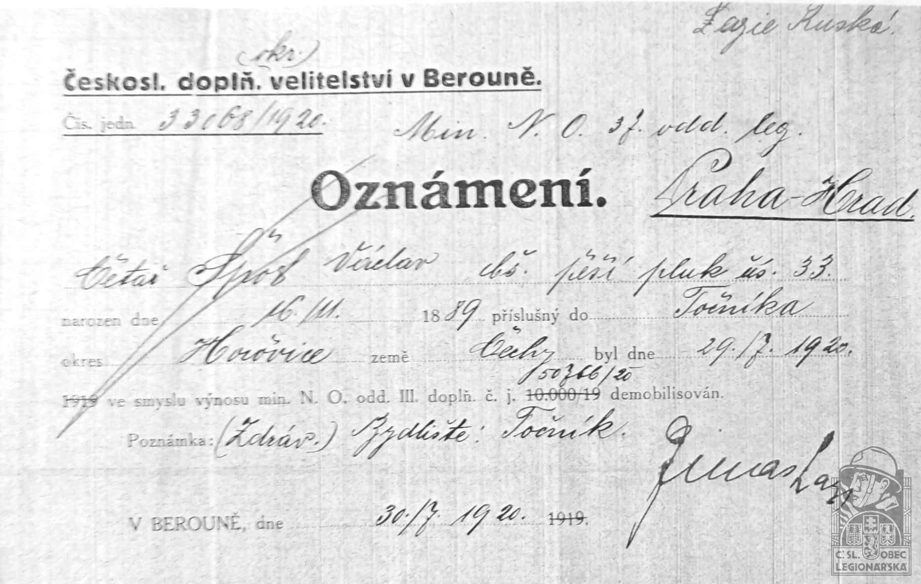 Poznámka:sproštěn služby do 31.10.1920, další údaje nejsou
