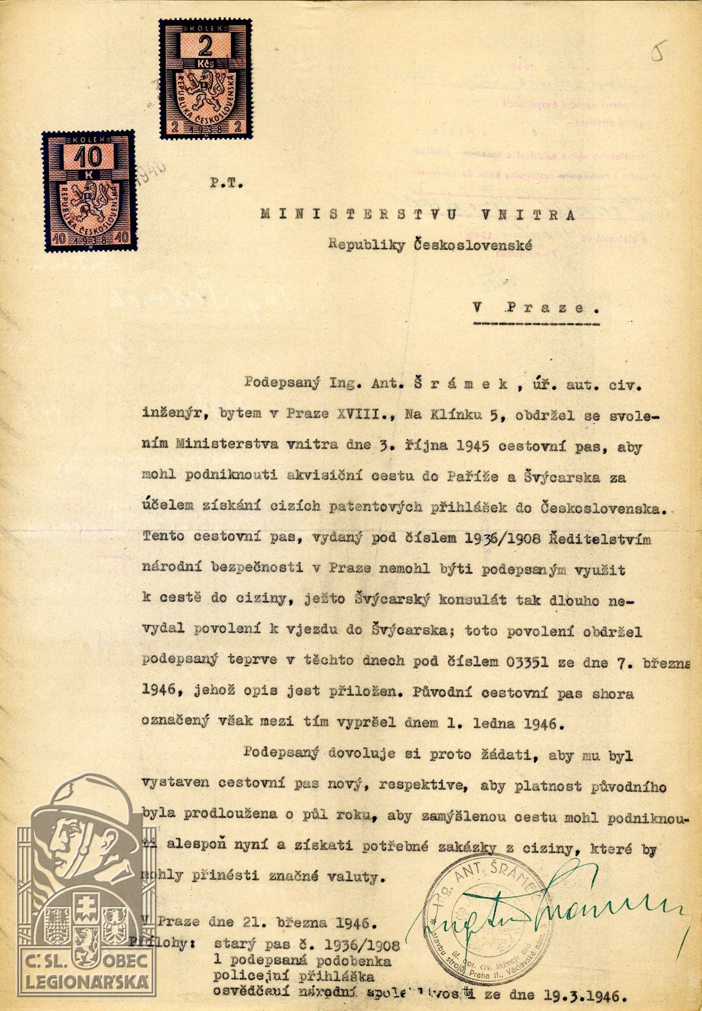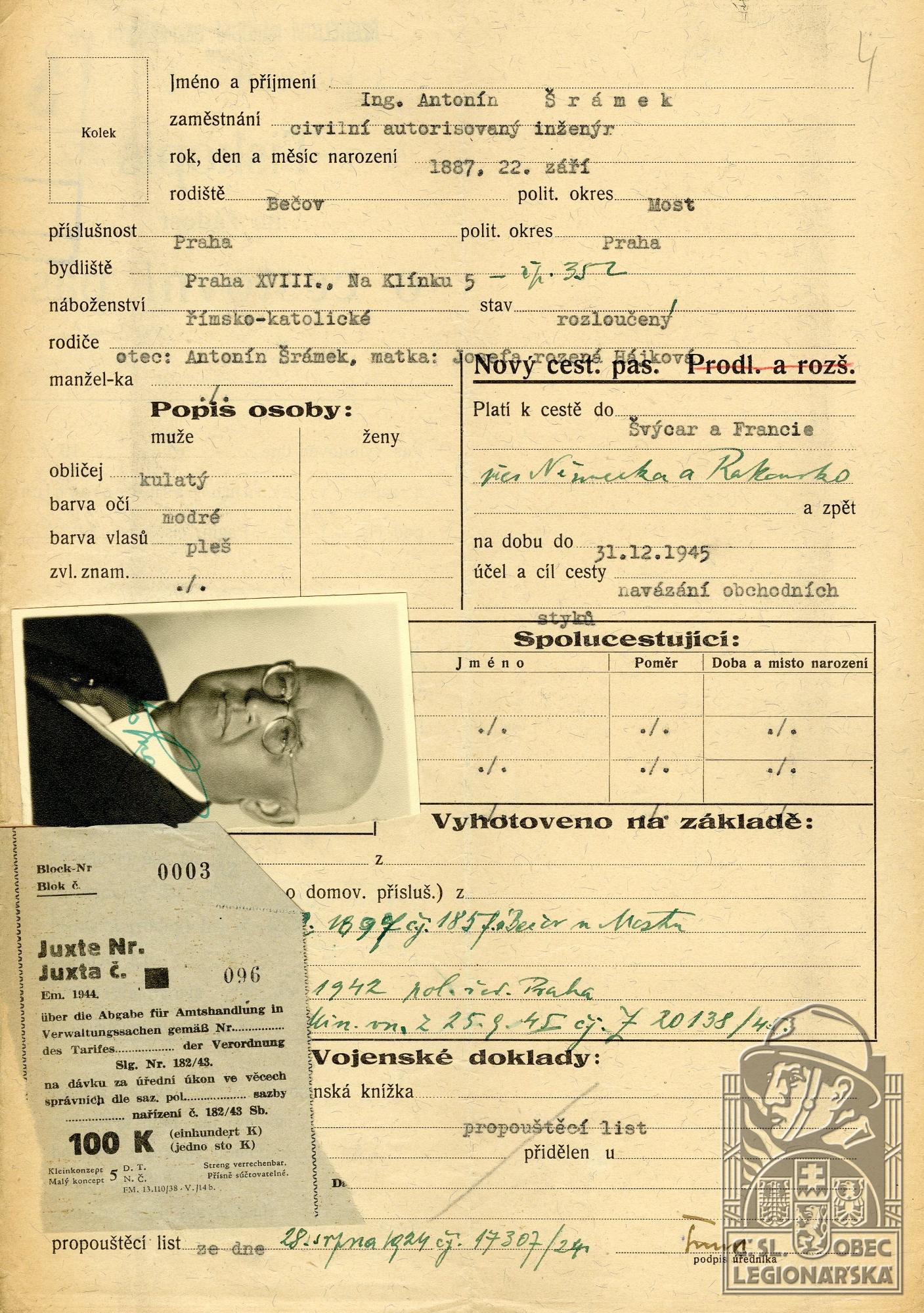 Životopis:Ing. Antonín Šrámek se narodil 22. září 1887 v Bečově u Mostu. Věnoval se překladům z angličtiny a němčiny a roku 1936 se stal vrchním radou Patentového úřadu. Šrámek publikoval pět dobrodružných románů pod pseudonymem Frank A. Boston a spolu s legionářem a zároveň kolegou z Patentového úřadu Karlem Schulzem (108304) vydávali práce z oboru patentování. Šrámkovy knihy bývají občas mylně připisovány lyrickému autorovi a básníkovi Antonínu Šrámkovi (1894–1972). Ačkoliv s manželkou JUDr. Bohuslavou Šrámkovou, která se během druhé světové války přihlásila k německému občanství, byl v roce 1945 již rozveden, přesto došlo ke konfiskaci jejich domu ve Střešovicích. Roku 1946 si Antonín Šrámek zažádal o nový cestovní pas a tím stopa o jeho dalším osudu končí.