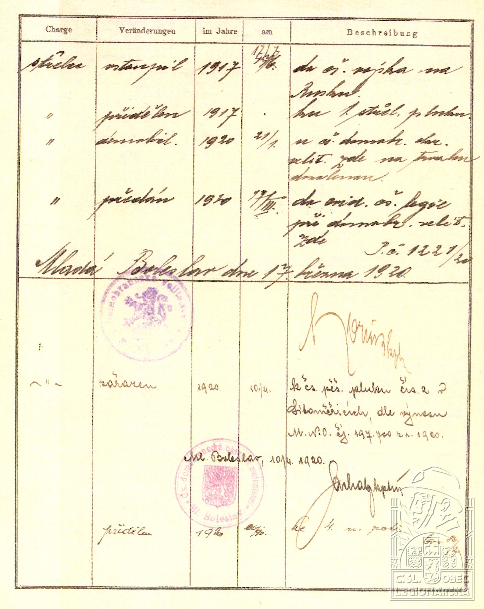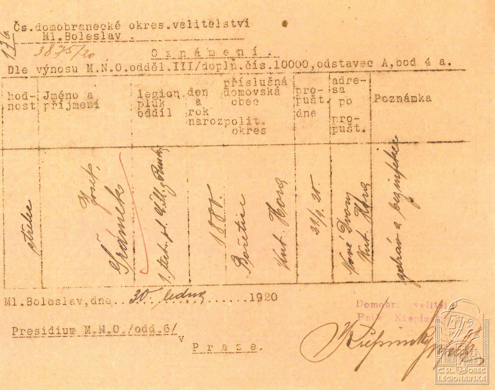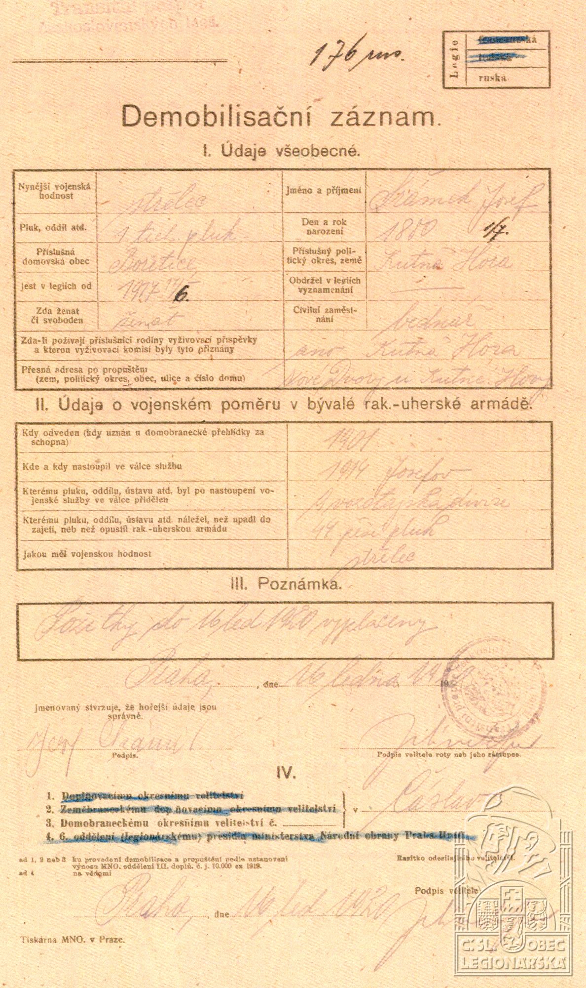 Konec v legiích:21.1.1920 ( Demobilizován )