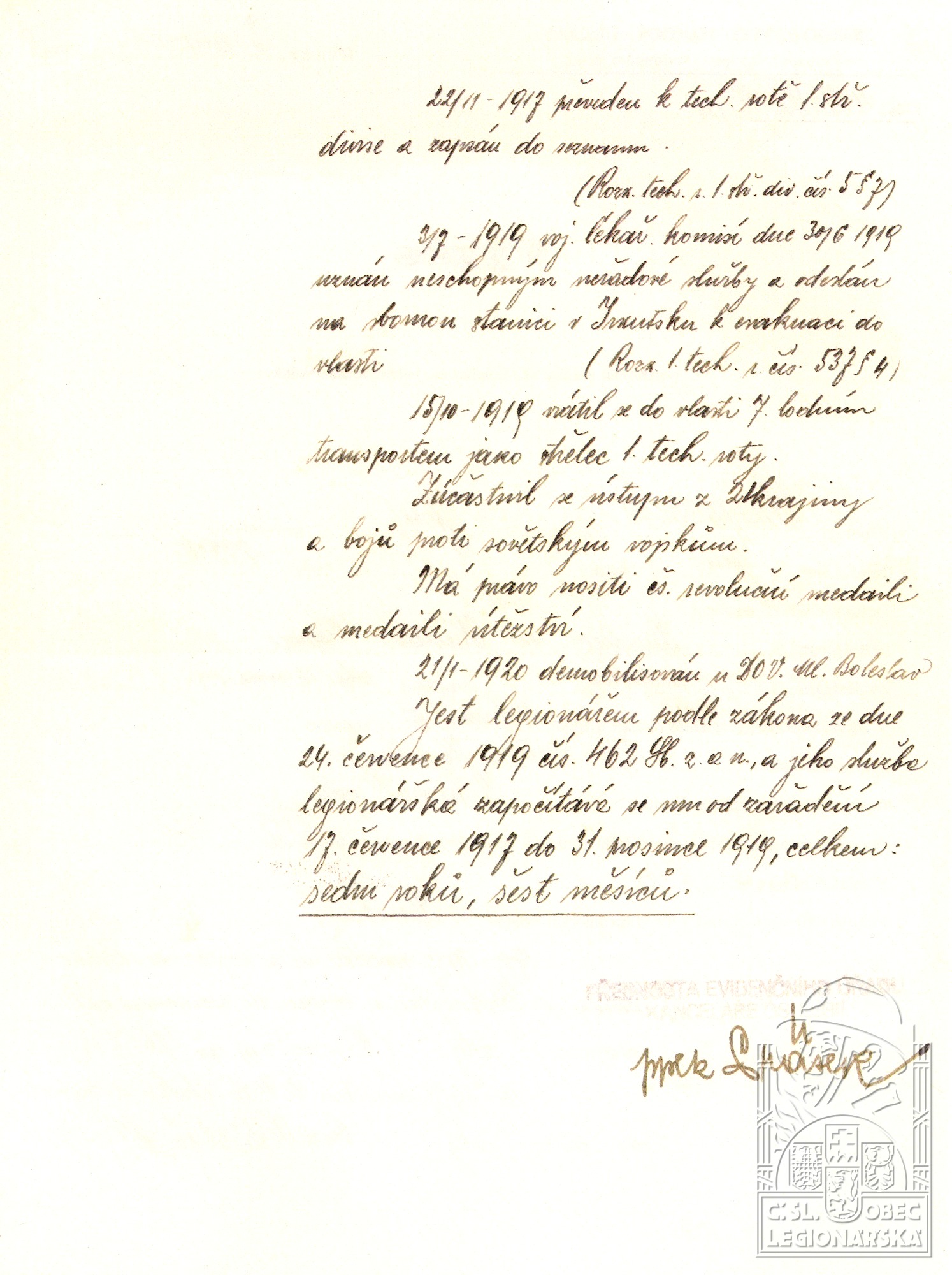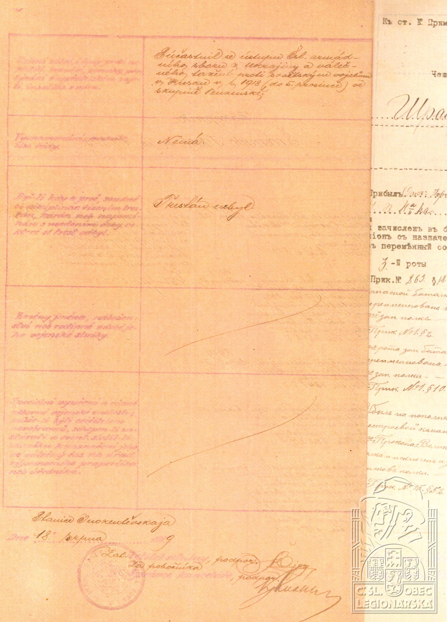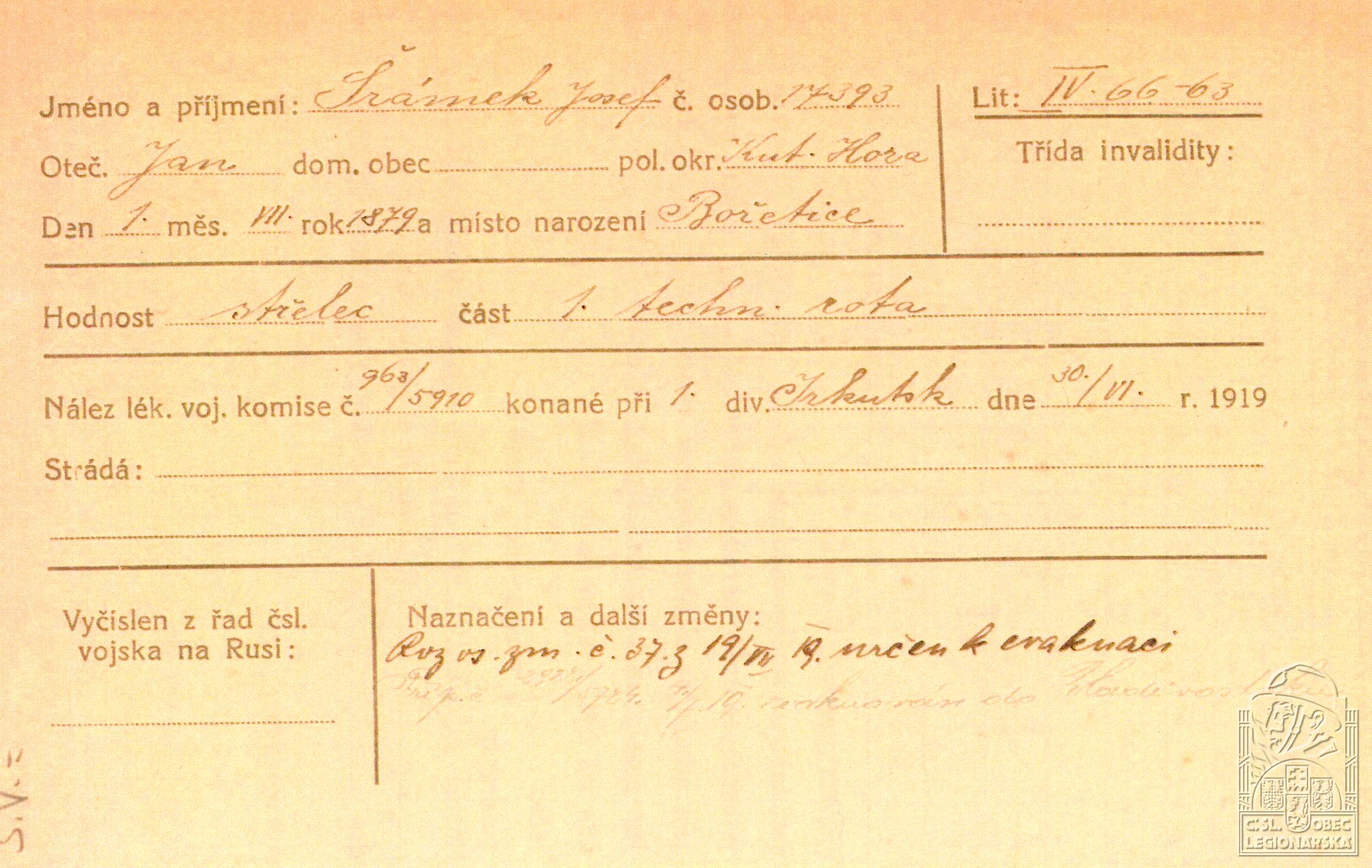 Jednotka v době zařazení:1.tech.rota ( Čs. legie v Rusku )