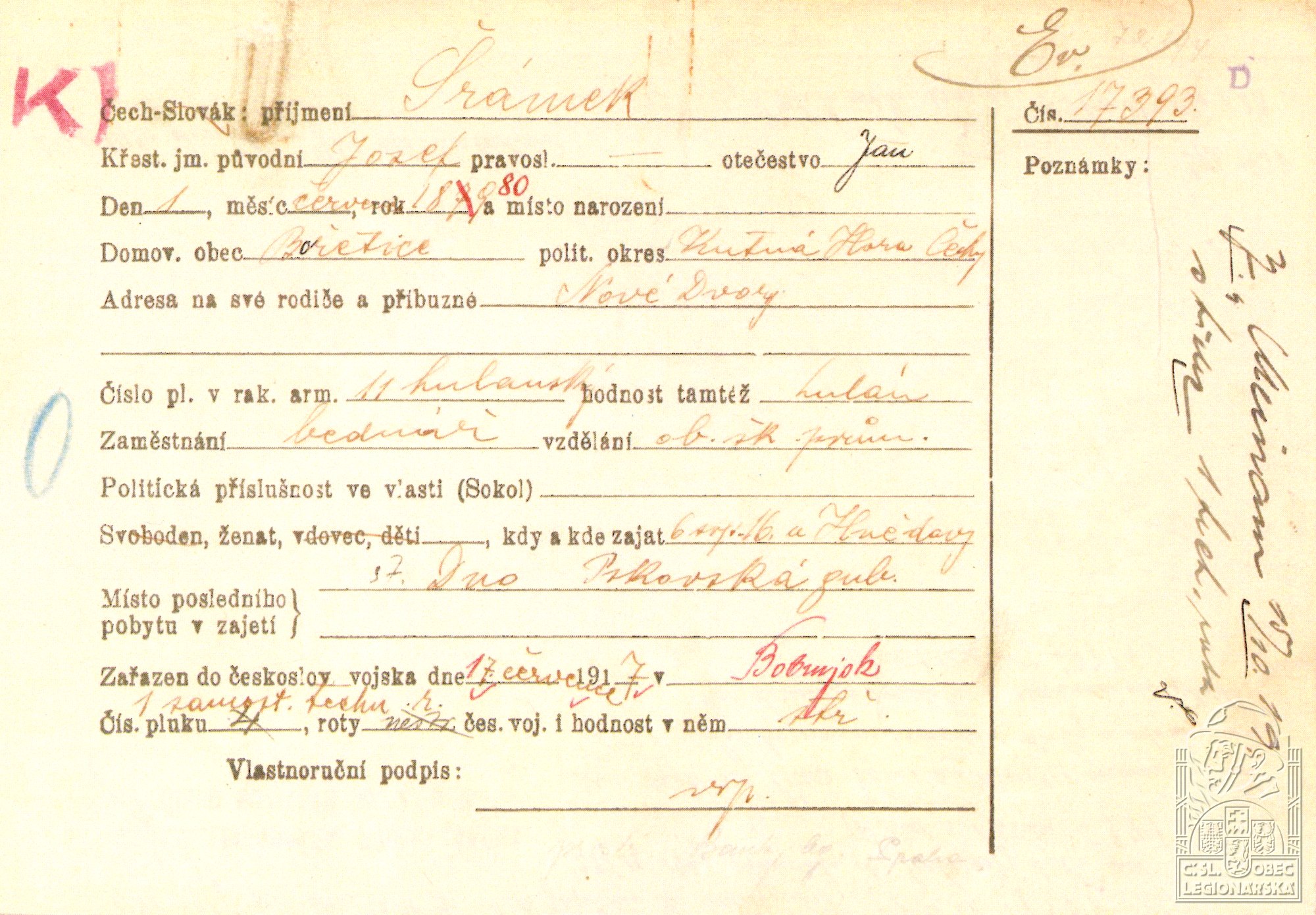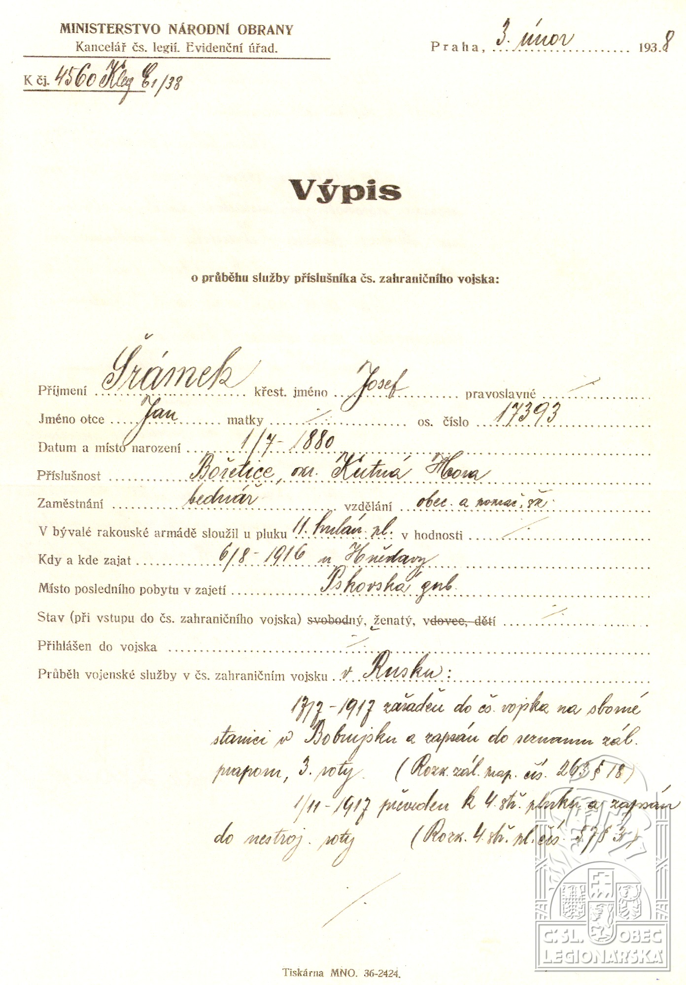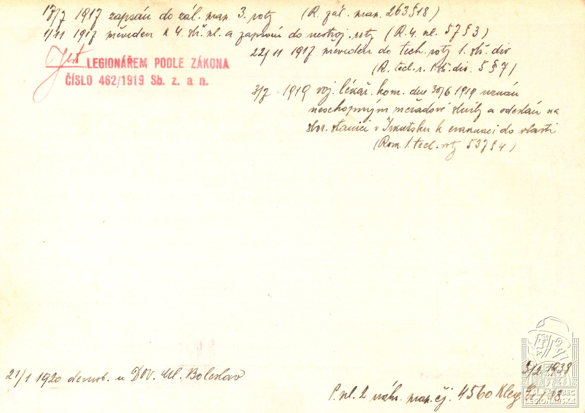 Datum podání přihlášky do legií:17.7.1917