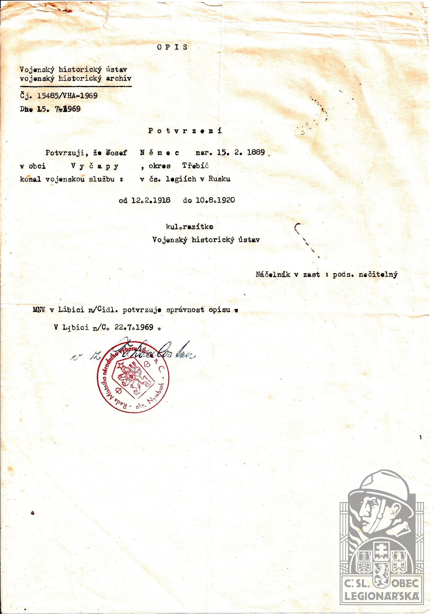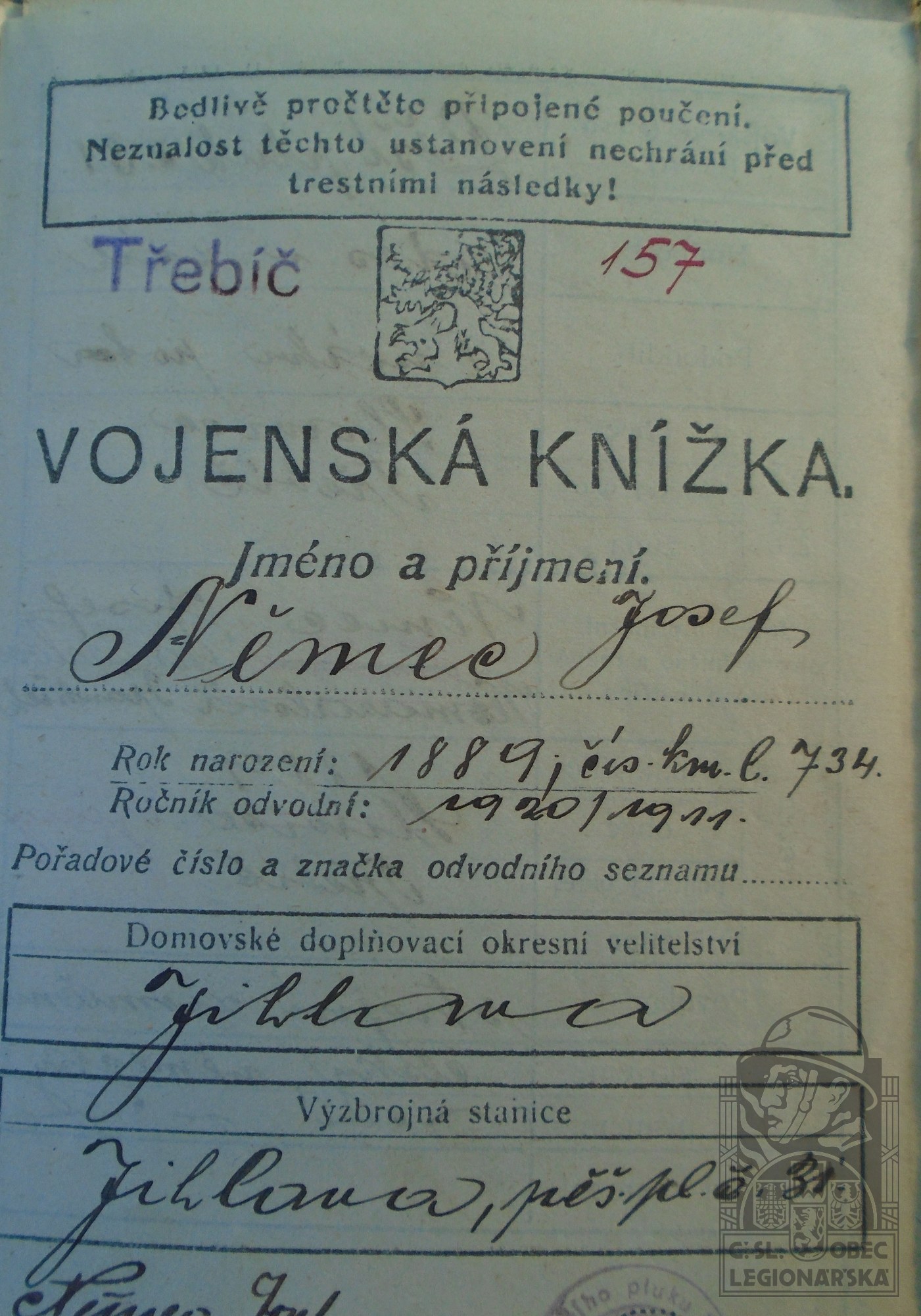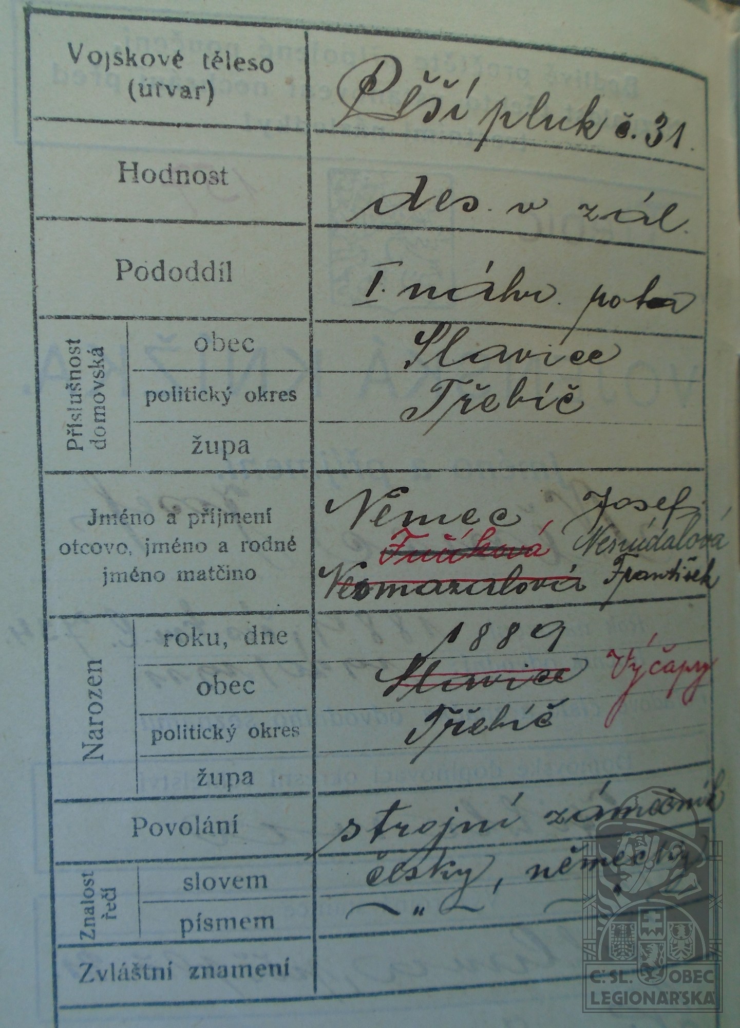 Zdroj informací: legionářský poslužný spis osobní karta legionáře