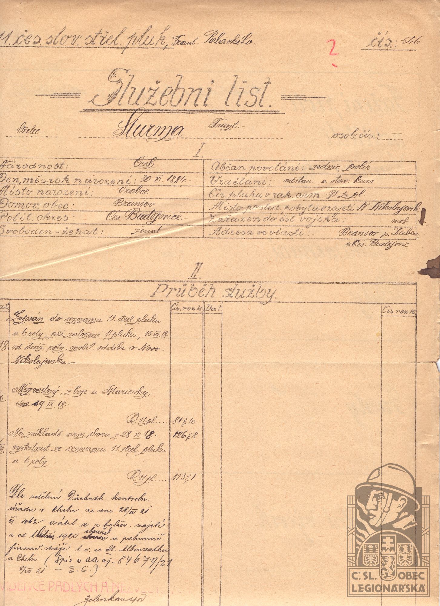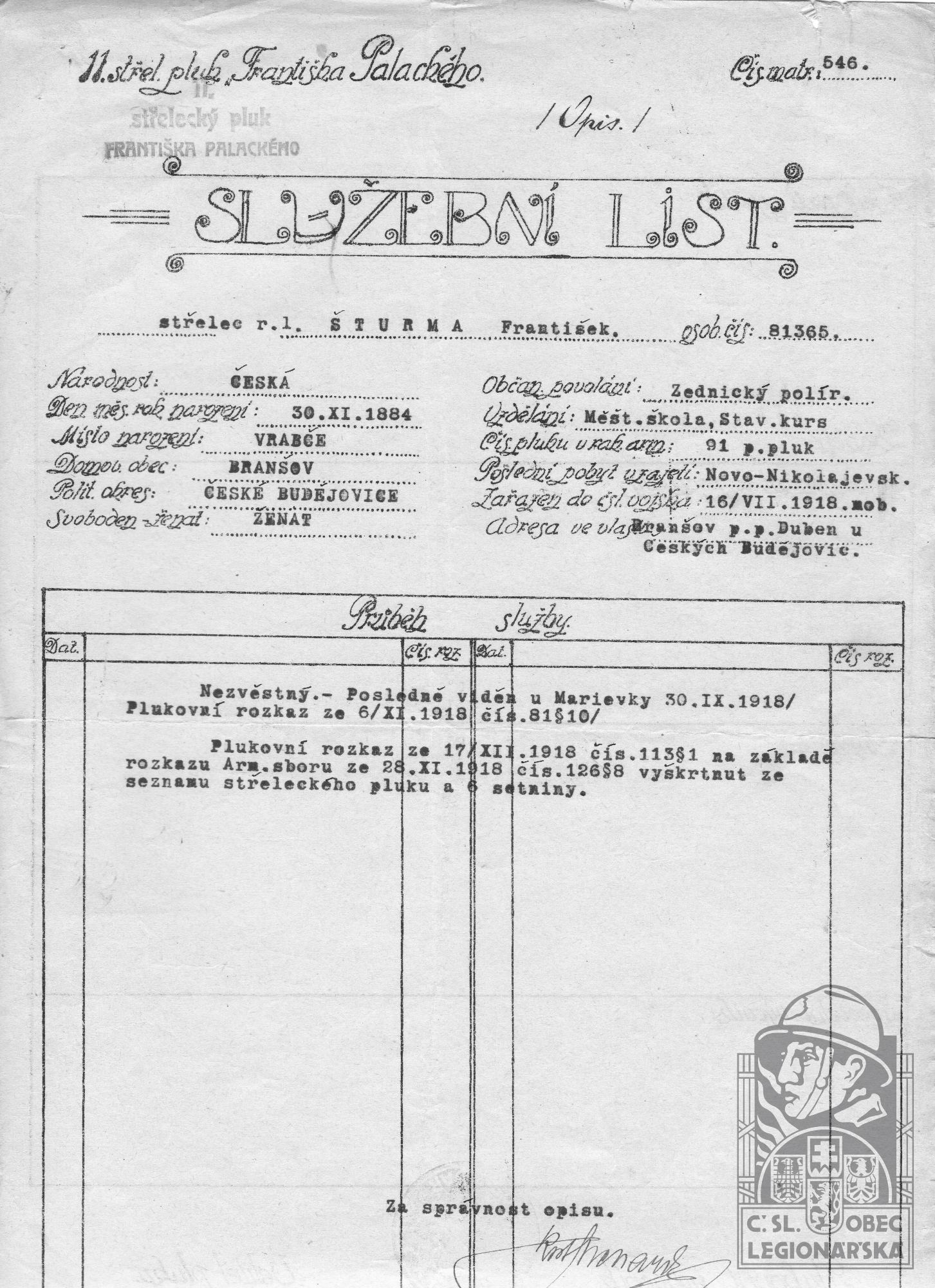 Zdroj informací: legionářský poslužný spis osobní karta legionáře