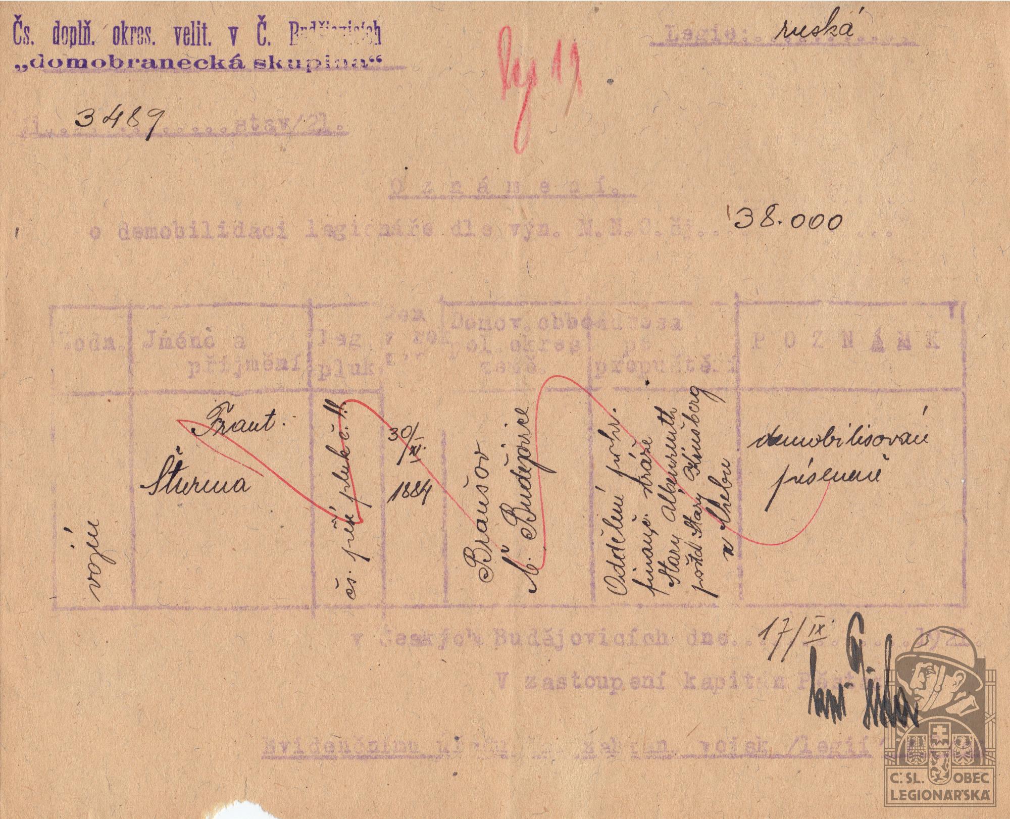 Konec v legiích:17.9.1921 ( Demobilizován )