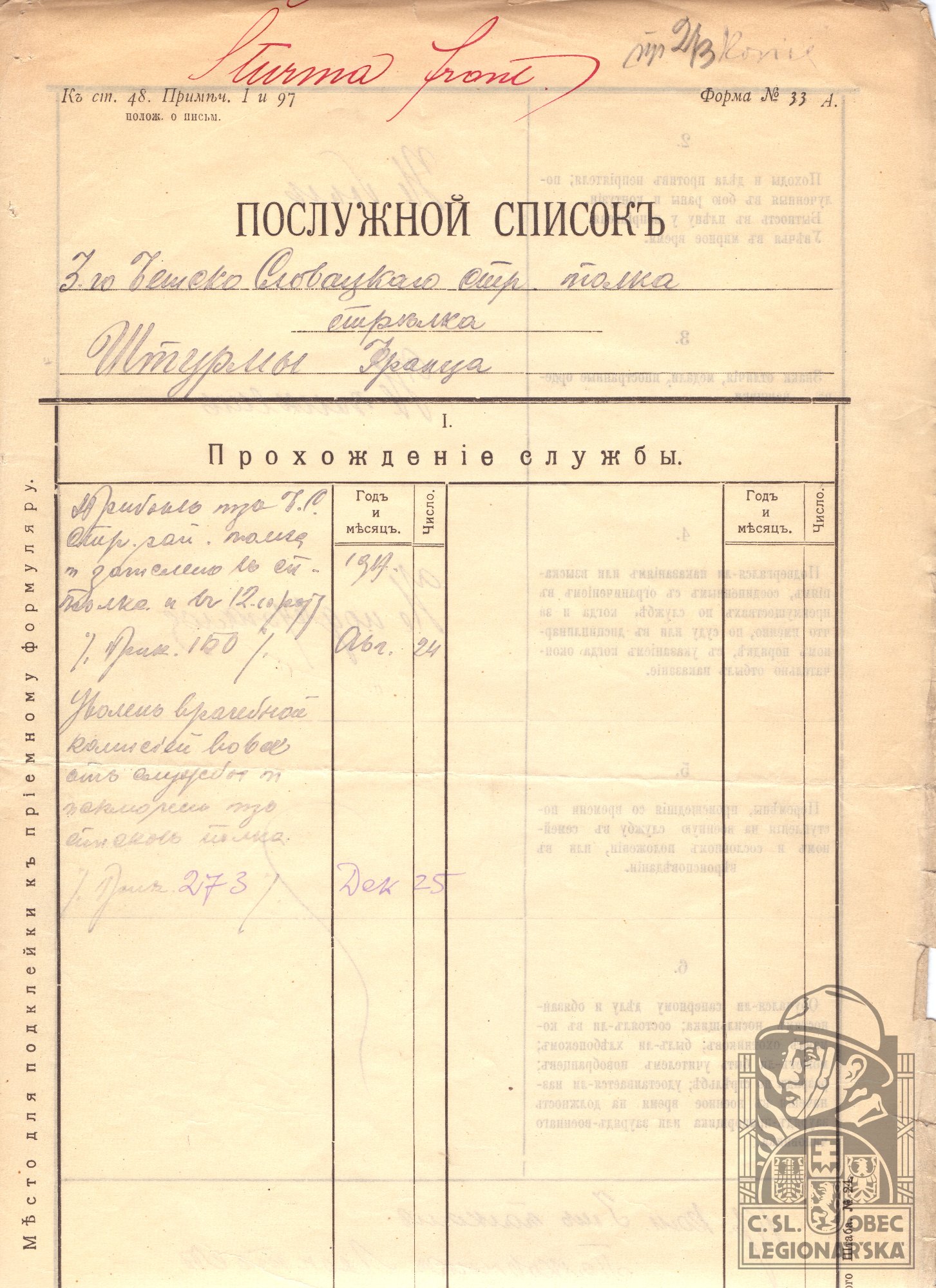 Jednotka v době zařazení:11.stř.pl. ( Čs. legie v Rusku )