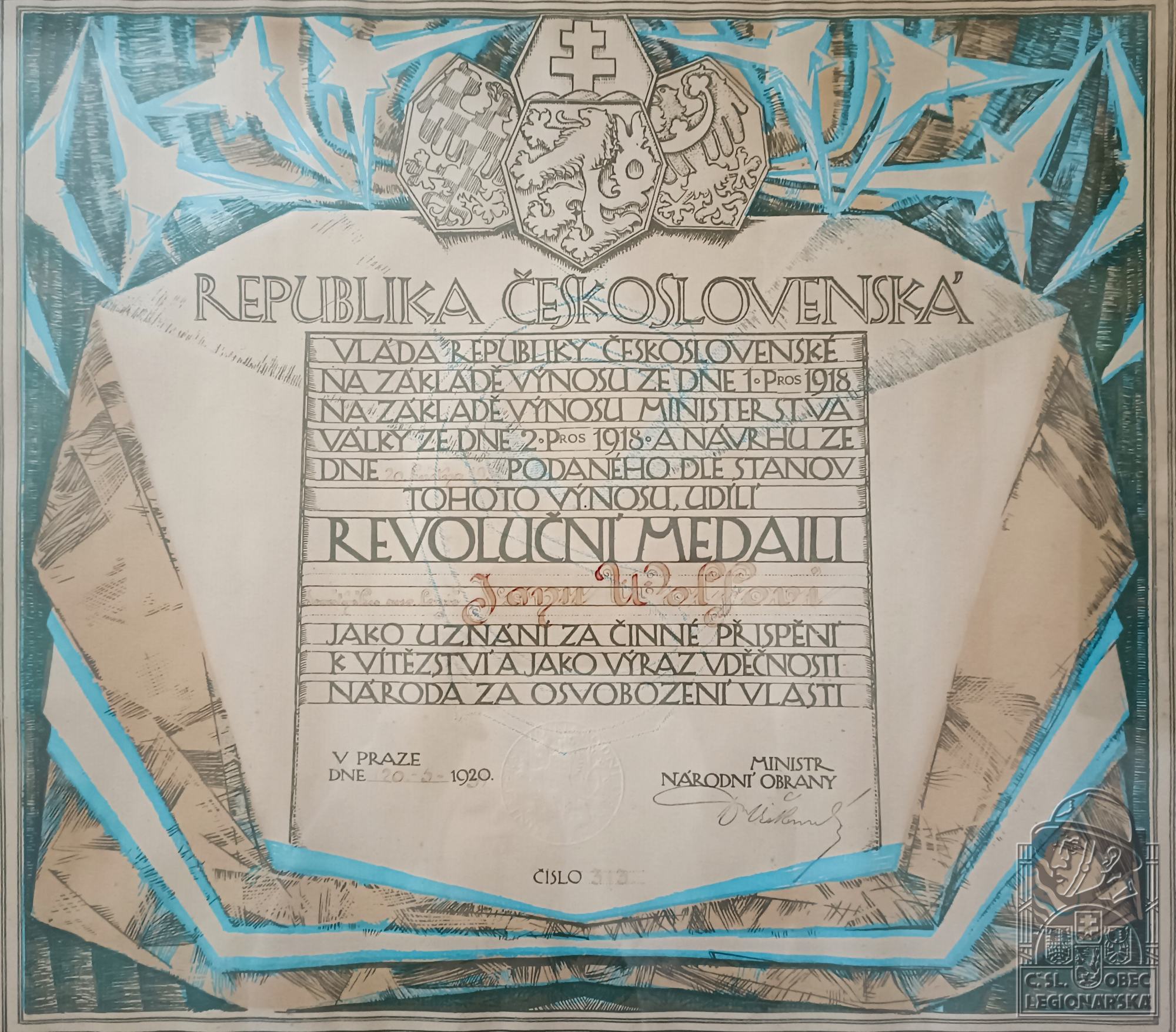 Životopis:Během zajetí v Rusku pracoval za nelehkých podmínek u statkáře. Ve Vladivostoku pak čekal na loď, přičemž na cestu si musel vydělat. Lodí pak plul přes Suezský průplav do Terstu a odtud se dostal na podzim 1920 vlakem do Českých Budějovic. Zde nocoval z důvodu nedostatku místa na půdě v kasárnách, které tou dobou už byly obsazeny čsl. armádou. Br. Jan Wolf měl celkem čtyři sourozence. Jeden z nich zemřel v dětství na spálu, nejstarší bratr Vojtěch padl v Srbsku v roce 1914, Václav na konci války rukoval do Chebu, avšak kvůli krátkozrakosti nešel ke zbrani. Nejmladší František byl námořníkem na bitevní lodi Viribus Unitis. Br. Jan Wolf po skončení války pracoval jako učitel ve Slavči, avšak po prodělaných válečných útrapách spáchal v roce 1921 sebevraždu.V roce 1931 byl in memoriam vyznamenán Československou revoluční medailí. (Sepsáno na základě emailu synovce Jana Wolfa.)