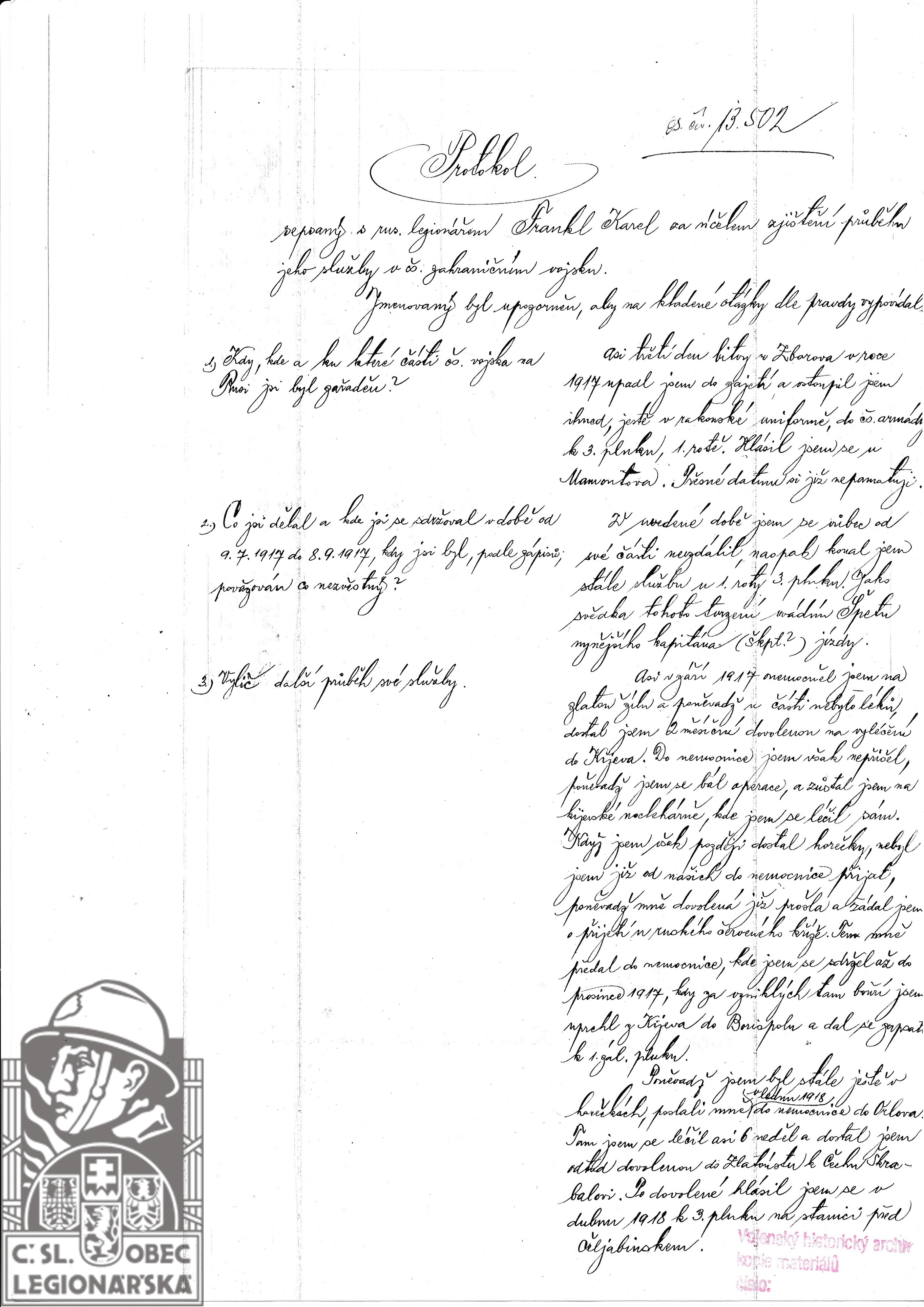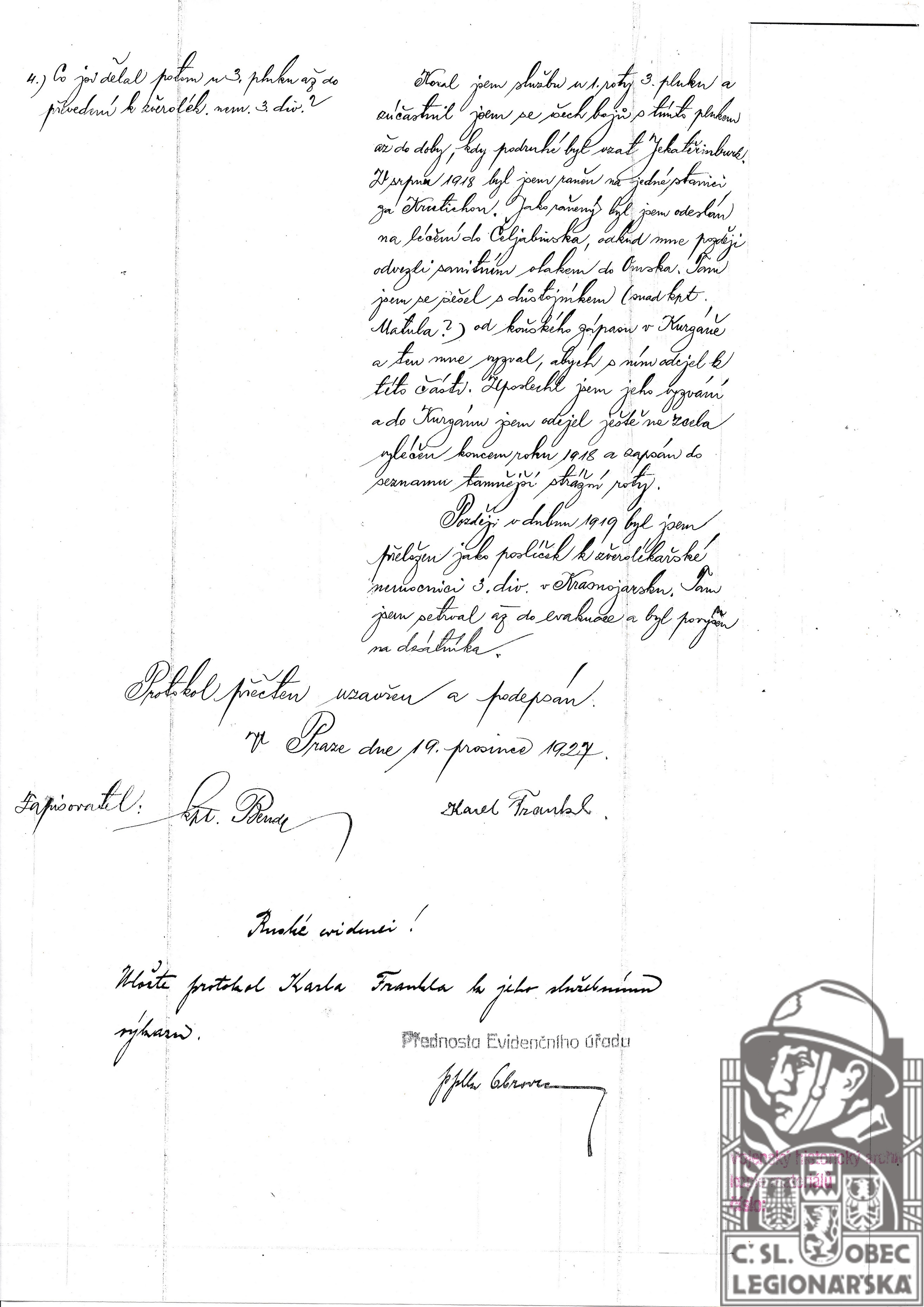 Jednotka v době zařazení:3.stř.pl. ( Čs. legie v Rusku )