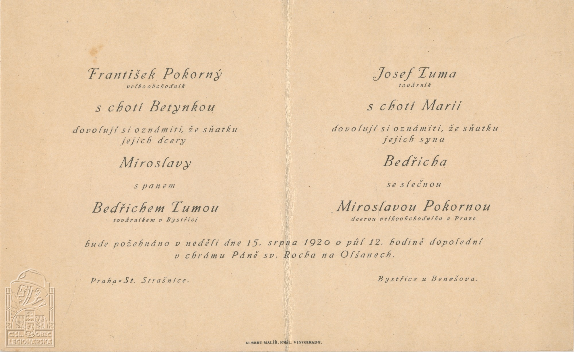 Poznámka:spoluvlastník firmy V. Richter a B. Tůma, továrny na dřevoobráběcí nástroje v Bystřici (po znárodnění Nářadí Praha či Narex Bystřice); dne 15.8.1920 se oženil s Miroslavou Pokornou; měl 2 děti; z důvodu omrzlin přišel o nohu pod kolenem