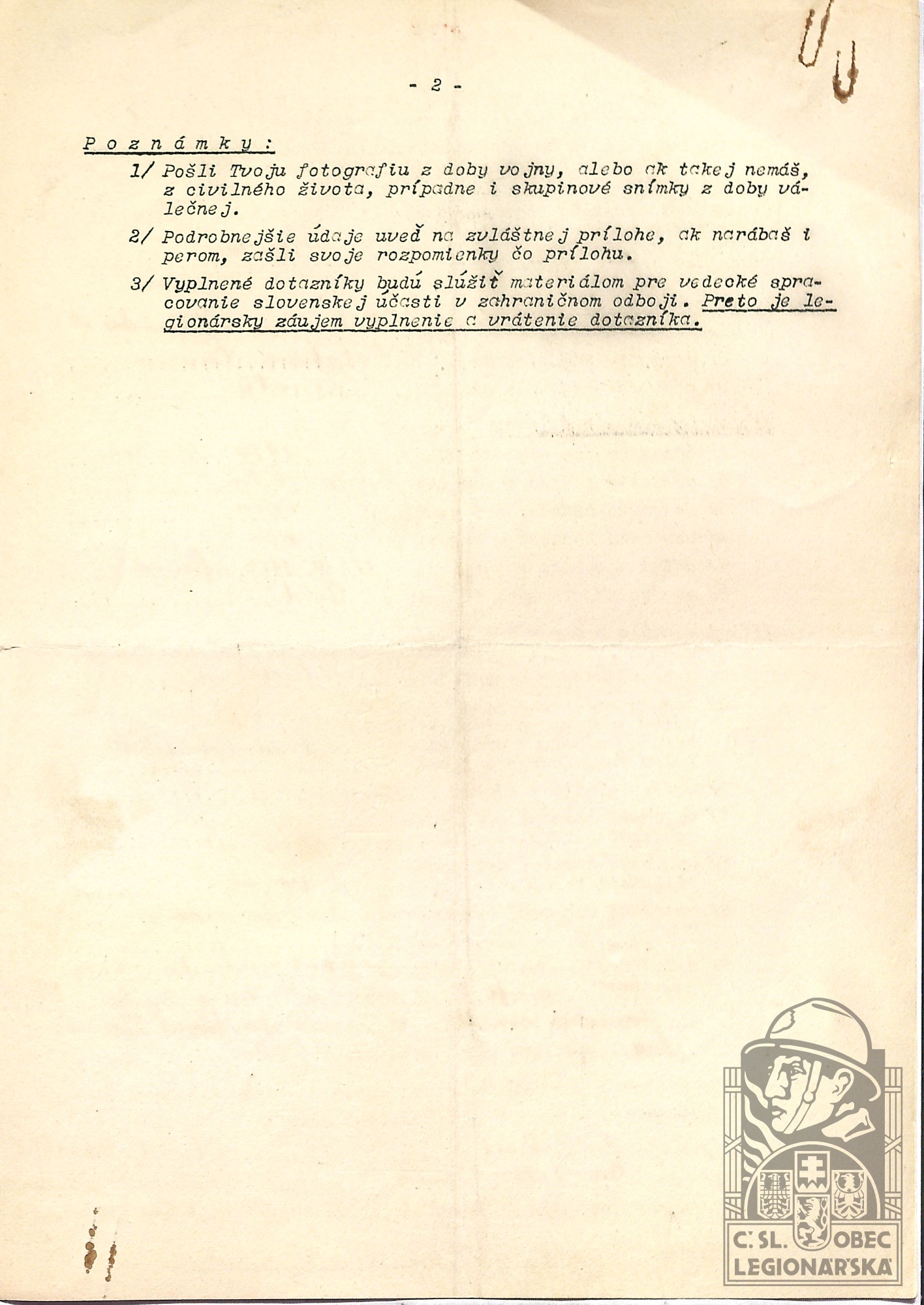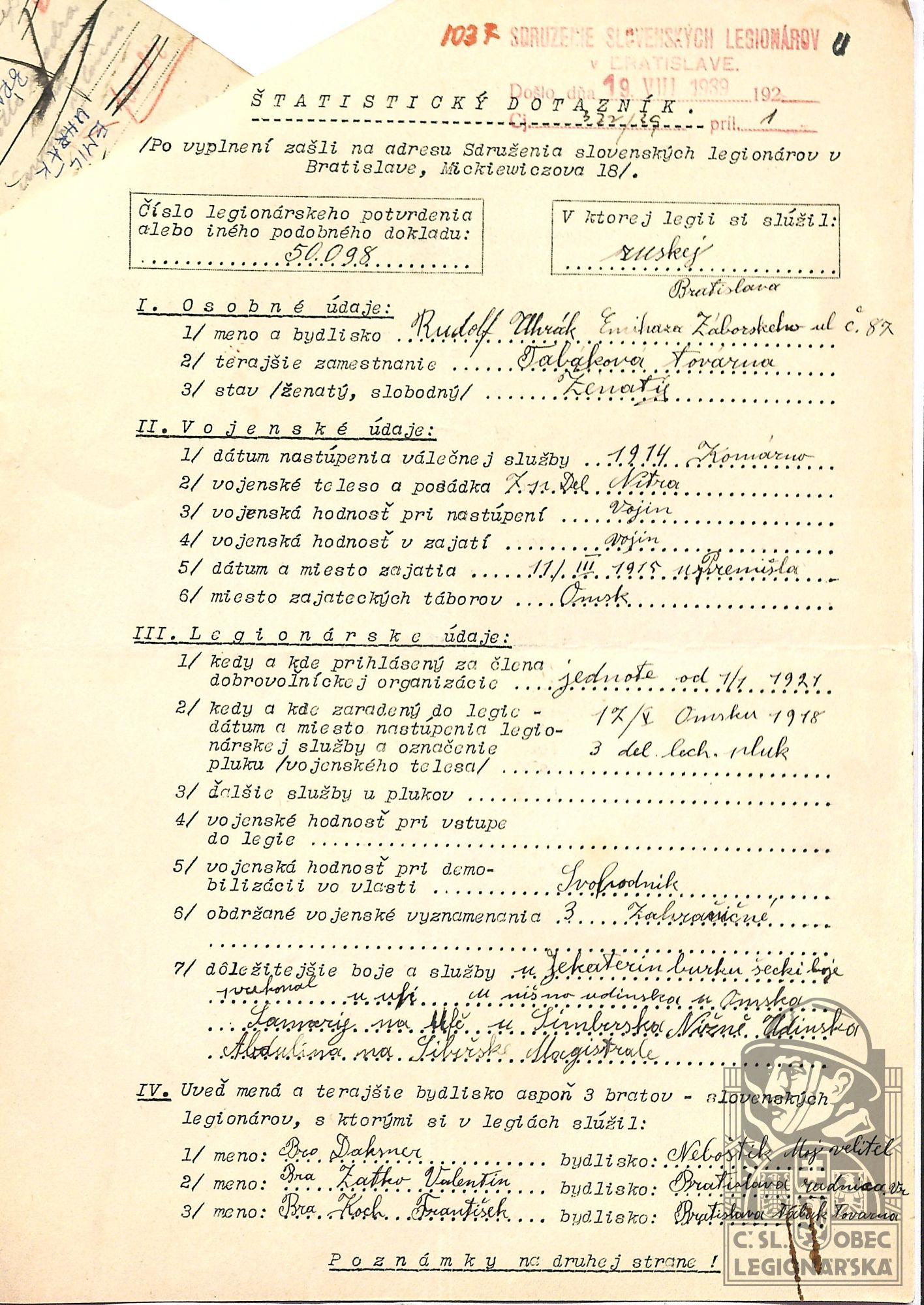 Zdroj informací: legionářský poslužný spis osobní karta legionáře