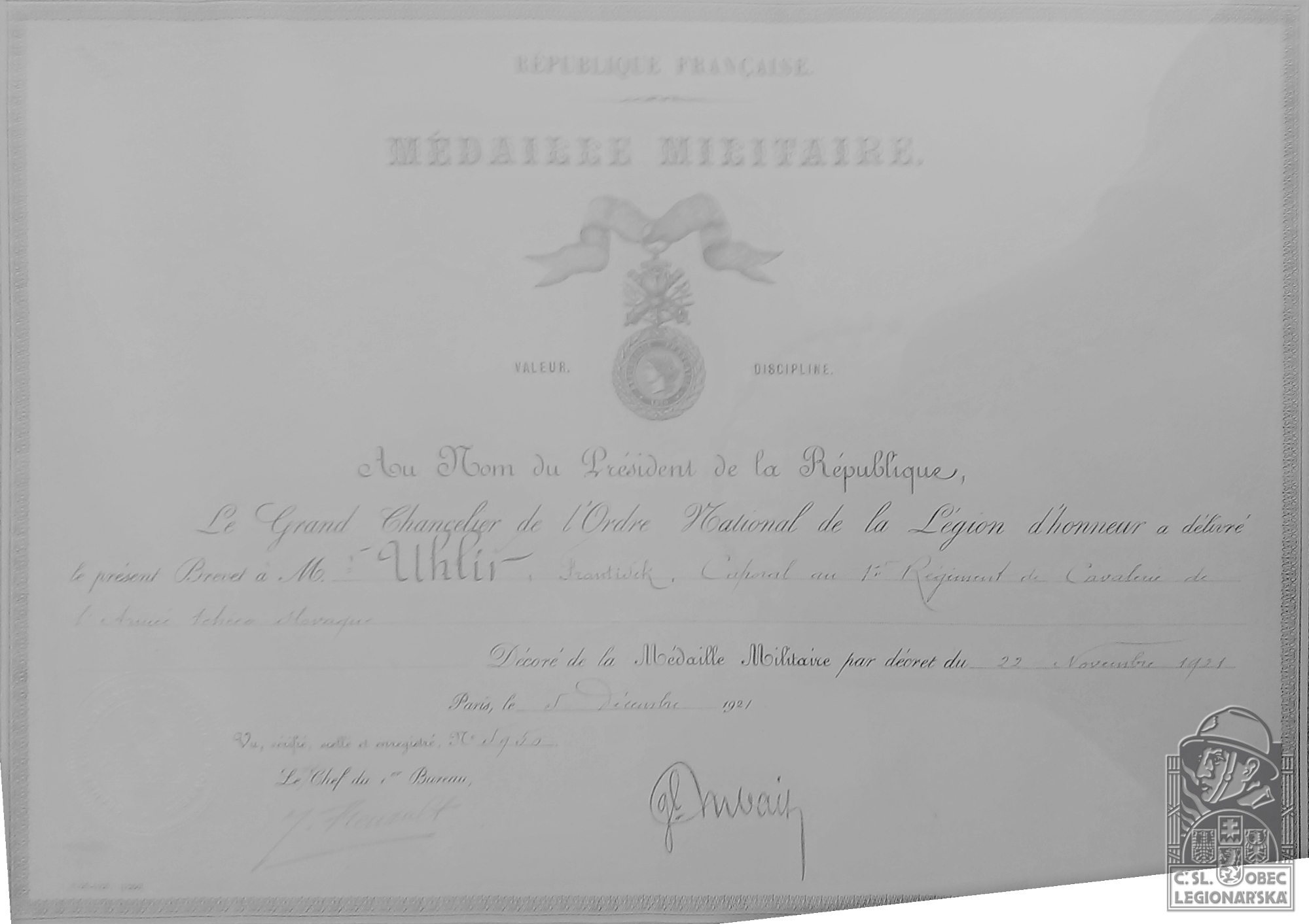 Životopis:František Uhlíř se narodil 8.9.1895 ve Stříbrnicích u Buchlovic u Uherského Hradiště. Vyrůstal se dvěma bratry a maminkou. Vyučil se zedníkem. V únoru 1915 nastoupil vojenskou službu ve Vídni k 6. dragounskému pluku rakousko-uherské armády a po 6 týdnech výcviku odjel na frontu, kde byl do srpna 1917. Do ruského zajetí se František Uhlíř dostal 5.8.1917 v Karpatech u Kimpolungu v severorumunské Bukovině a následně byl umístěn v zajateckém táboře Dárnice u Kyjeva. Při ústupu čs. legionářů z Ukrajiny se 25.3.1818 přihlásil do vojska a byl zařazen k 3. pěšímu pluku „Jana Žižky z Trocnova“ a 29.8.1918 byl přeložen k 1. jízdnímu pluku „Jana Jiskry z Brandýsa“, kde pracoval u zdravotní služby. Od 1.1. do 17.2.1919 absolvoval ošetřovatelský kurs v nemocnici v Čeljabinsku a 17.1.1920 byl převeden do štábu pluku na plukovní ošetřovnu.