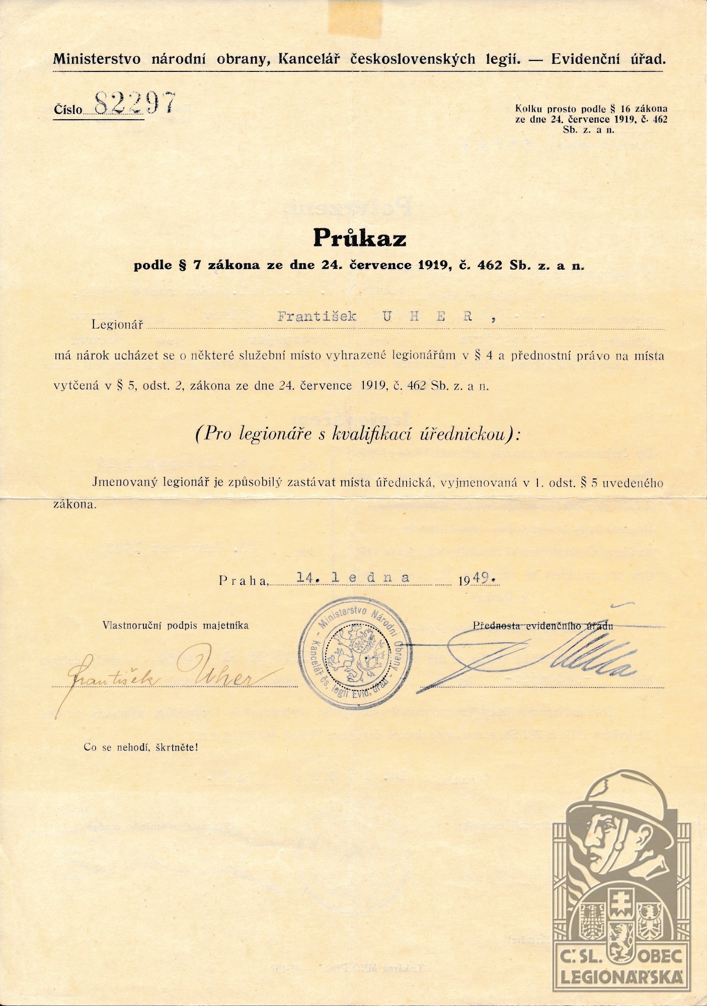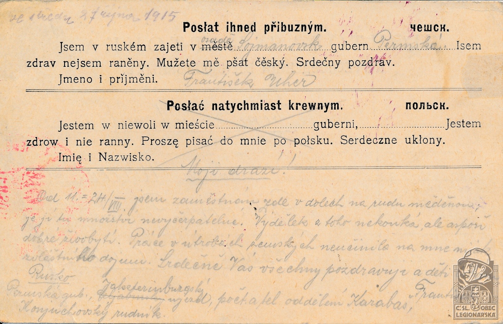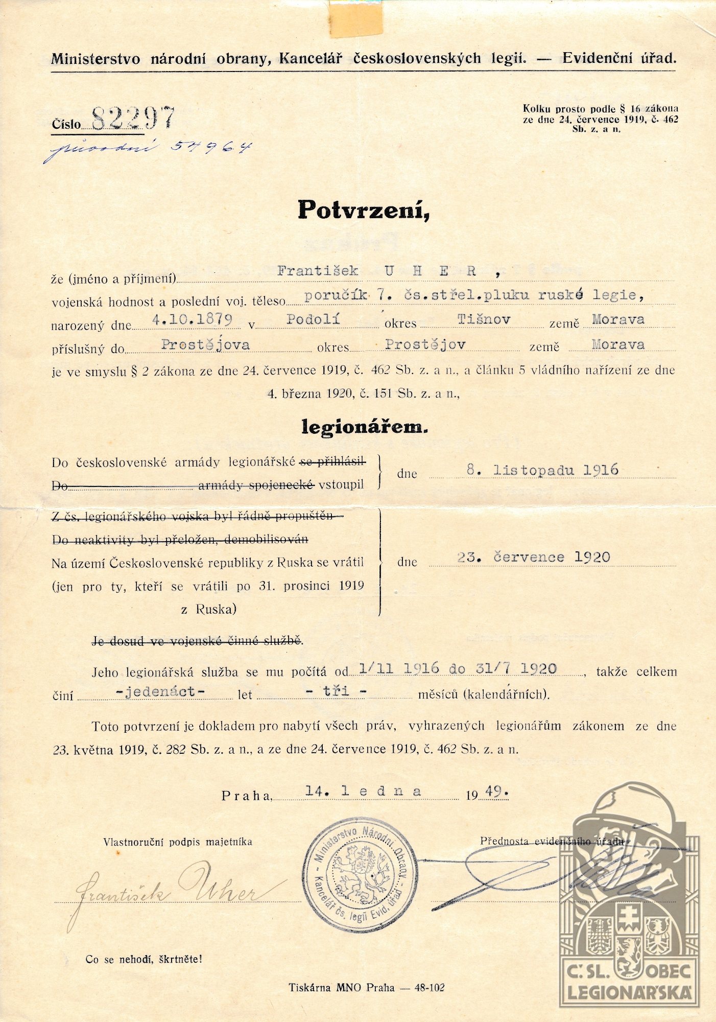 Zdroj informací: legionářský poslužný spis osobní karta legionáře Archiv ČsOL 585/2019