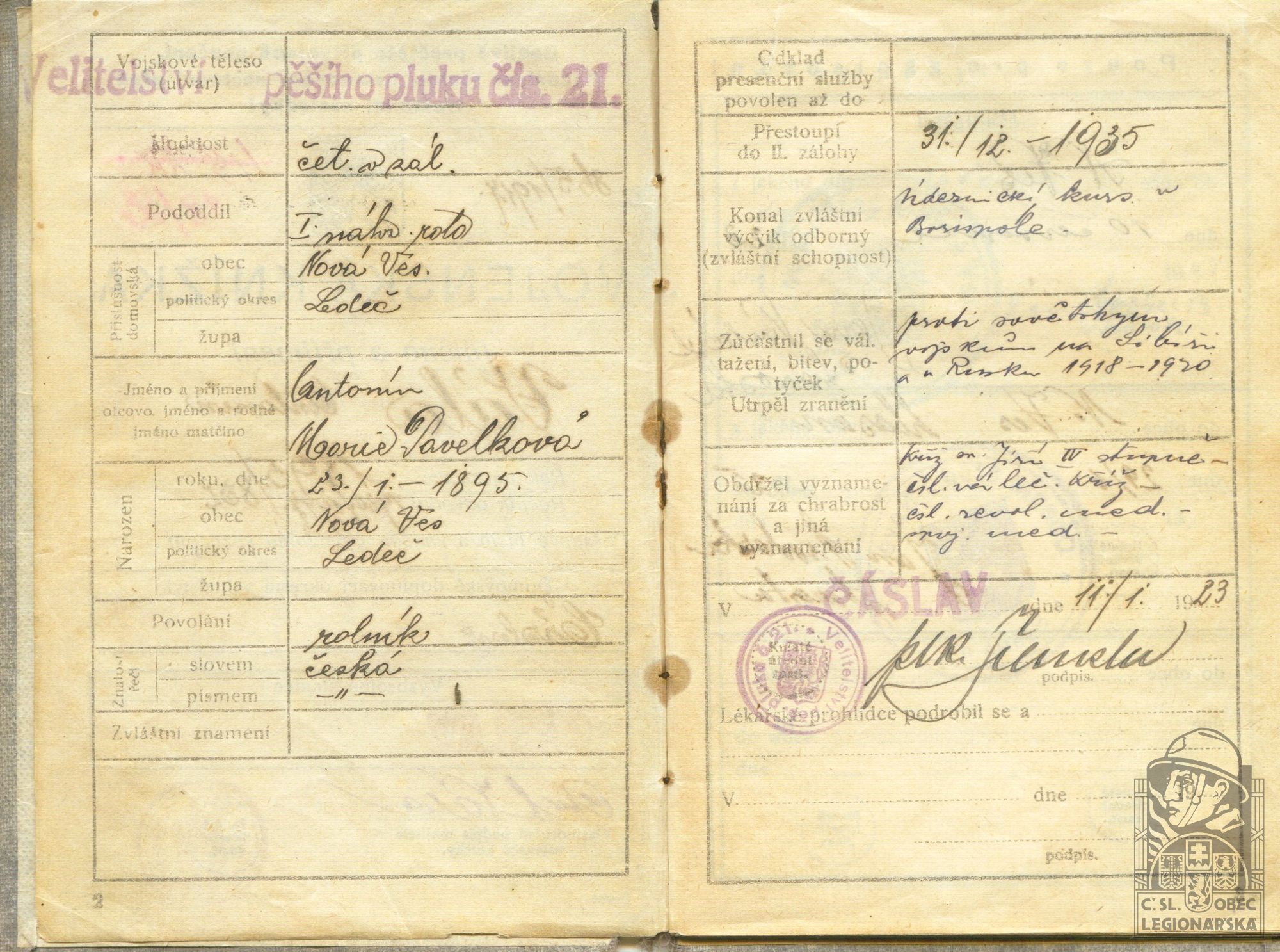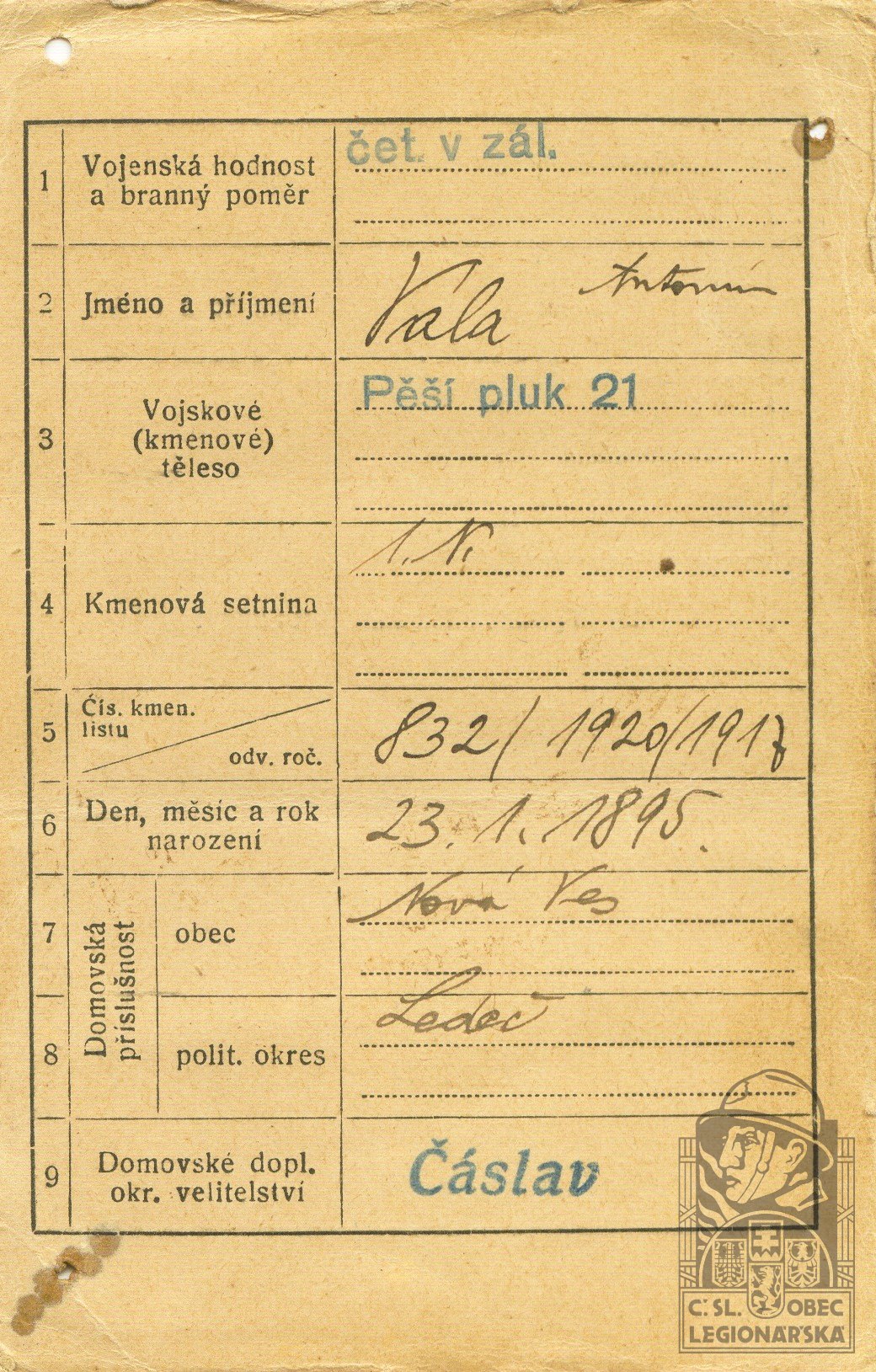 Zdroj informací: legionářský poslužný spis osobní karta legionáře