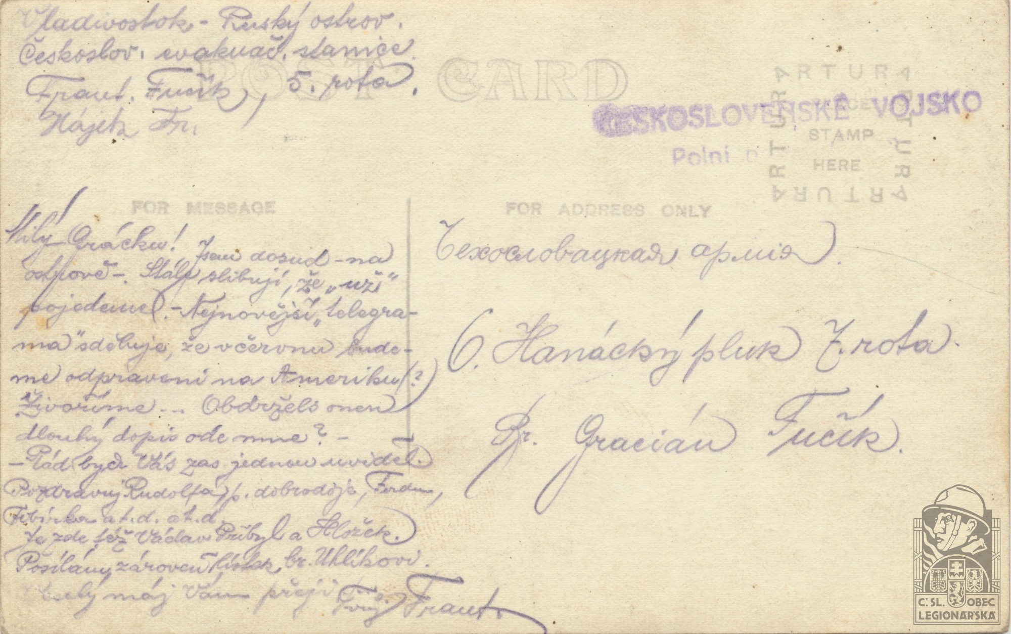 Jednotka v době zařazení:6.stř.pl. ( Čs. legie v Rusku )