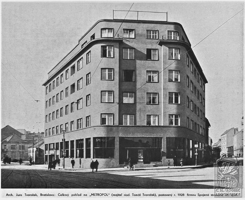Životopis:Juraj Tvarožek bol významný slovenský architekt a staviteľ medzivojnového obdobia. Patrí medzi priekopníkov funkcionalizmu na Slovensku a jeho tvorba výrazne prispela k rozvoju modernej architektúry na Slovensku. Narodil sa 30. novembra 1887 v Brezovej pod Bradlom v národne uvedomelej evanjelickej rodine. Pôvodne túžil byť maliarom, no pre sociálne podmienky sa namiesto vysokej školy zameral na murárske remeslo. Študoval na stavebnej priemyslovke v Budapešti (1905 – 1909). Po štúdiách pôsobil v Prahe u architekta A. Dryáka, kde spolupracoval na významných projektoch ako pomník sv. Václava. Navštevoval aj večerné kurzy kreslenia. Neskôr pracoval v budapeštianskom ateliéri M. M. Harminca a Roberta Flesha. Počas prvej svetovej vojny narukoval na ruský front, kde padol do zajatia. V zajatí dokonca projektoval banské mestečko Kemerovo, ktoré bolo postavené na základe jeho architektonického návrhu. V roku 1918 ho presunuli do ruského Vladivostoku. Spolu so svojim bratom Jánom Tvarožkom vstúpil do československých légií. O dva roky neskôr sa ako legionár vrátil do svojej rodnej vlasti, pričom absolvoval cestu okolo sveta cez Kóreu, Japonsko a USA. Neskôr prišiel do Bratislavy, kde sa natrvalo usadil a začal svoju samostatnú tvorivú činnosť. Zákazky na projektovanie víl a rodinných domov sa mu hrnuly. Neskôr jeho brat Tomáš Tvarožek, známy slovenský finančník, prišiel s obrovskou výzvou. Išlo o projekt a výstavbu obytného domu s kinom a kaviarňou, nazývaný Metropol. Pozemok kúpil a výstavbu financoval Tomáš Tvarožek. Juraj Tvarožek vytvoril dielo, ktoré bolo obdivované aj na zahraničnej scéne. Metropol bol vybudovaný v štýle Art Deco a nechýbali prvky funkcionalizmu či urbanizmu. O tejto stavbe sa hovorí ako o prelomovej v Tvarožkovej tvorbe. V roku 1928 popri výstavbe Metropolky vytvoril víťazný návrh pre budovu bývalej Mestskej sporiteľne, dnes Slovenskej sporiteľne v Bratislave. Táto patrí medzi vrcholné diela československej funkcionalistickej tvorby. Ako jeden z prvých u nás použil železobetónový skelet s ľahkou sklenenou zavesenou fasádou. Stavba sa svojím konštrukčným, dispozičným riešením, architektonickým výrazom, výberom stavebných materiálov a technickými detailmi zaradila do prúdu svetového vývoja a v našom kontexte výrazne predbehla svoju dobu. Funkcionalistický prístup je viditeľný aj na realizácii budovy bývalej Slovenskej obilnej spoločnosti, dnes Ministerstva zahraničných vecí SR v Bratislave. K jeho dôležitým prácam patria aj viaceré urbanistické riešenia. Veľmi pozoruhodné, pokrokové myšlienky prinášal napríklad jeho súťažný návrh na regulačný plán a železničné riešenie územia v Bratislave, ktorý vypracoval spolu s pražskými architektmi (1929). V roku 1944 bol aktívnym účastníkom Slovenského národného povstania. V 50 – tych rokoch bol zatknutý, z väzenia sa vrátil s podlomeným zdravím. Zomrel v rodnej dedine v Brezovej pod Bradlom 12. januára 1966, kde je aj pochovaný.