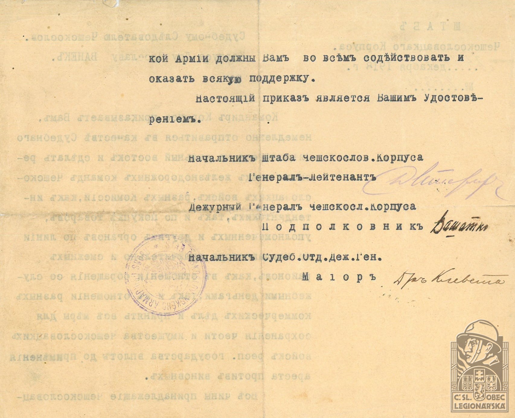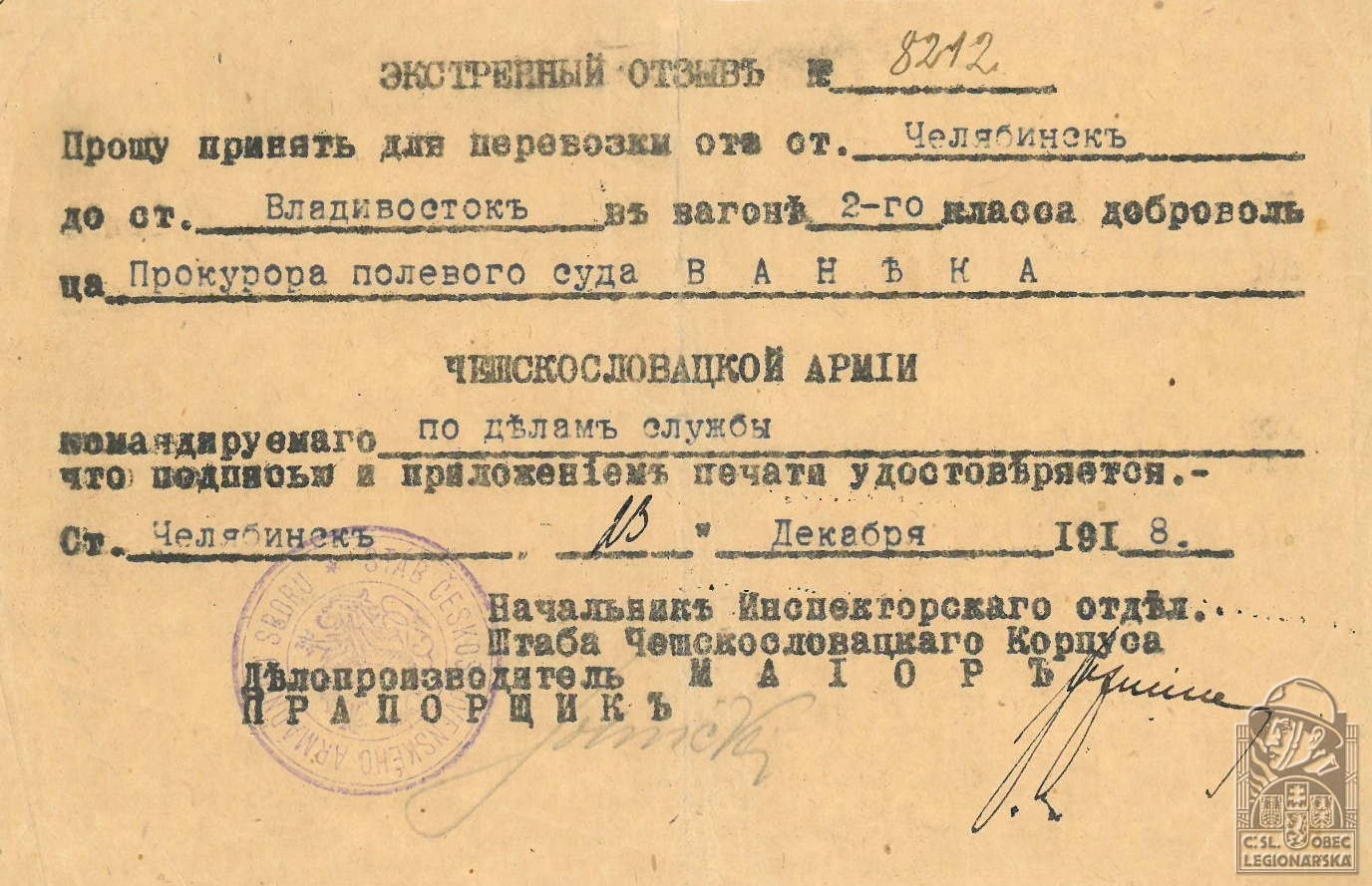 Jednotka v době zařazení:žel.rota ( Čs. legie v Rusku )