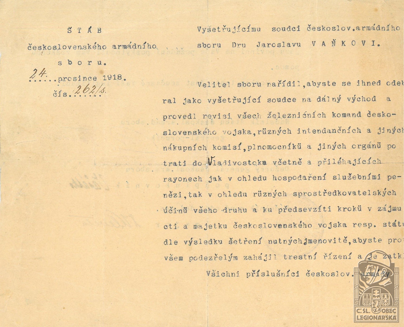 Poznámka:Vyšetřující soudce čs. sboru, člen Likvidačního úřadu zahraničních vojsk; 15.12.1920 převeden do zálohy
