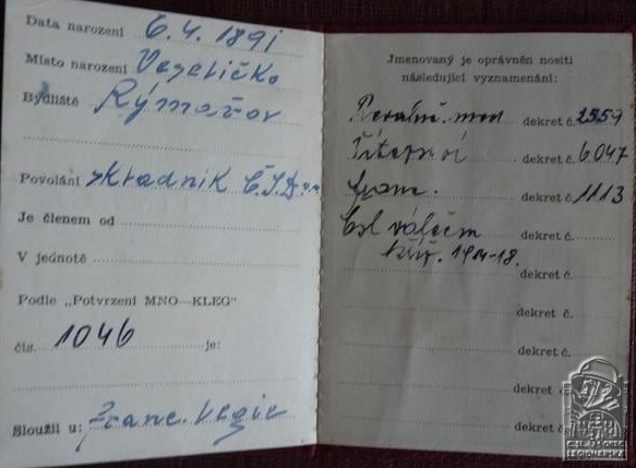 Zdroj informací: legionářský poslužný spis osobní karta legionáře
