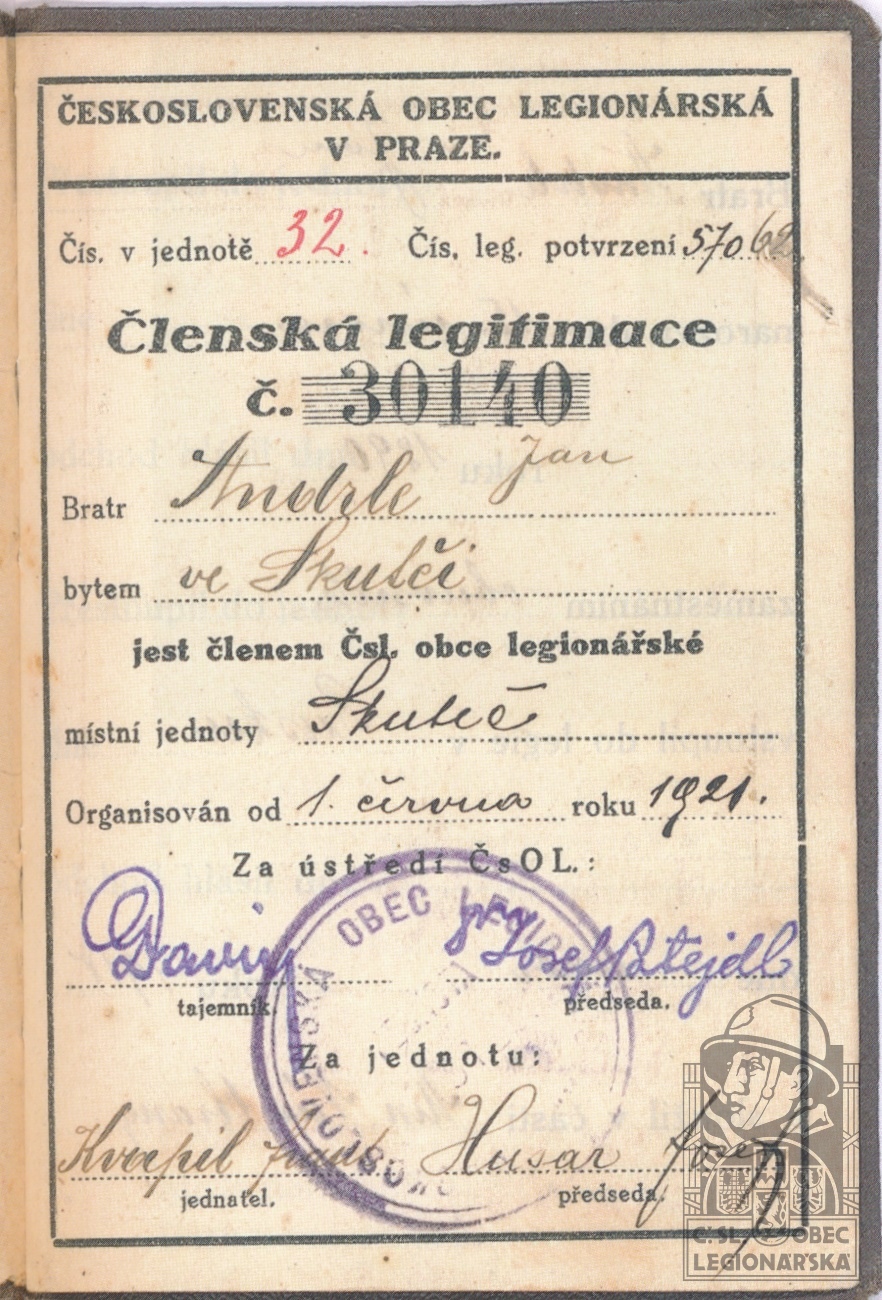 Zdroj informací: legionářský poslužný spis osobní karta legionáře JUNEK, Jiří, AKSLER, Libor. Vojáci Skutečska 1914-1920: Borek, Hněvětice, Lažany, Lešany, Lhota u Skutče, Přibylov, Radčice, Skuteč, Skutíčko, Štěpánov, Zbožnov, Zhoř, Žďárec u Skutče. Skuteč: Město Skuteč, 2019.