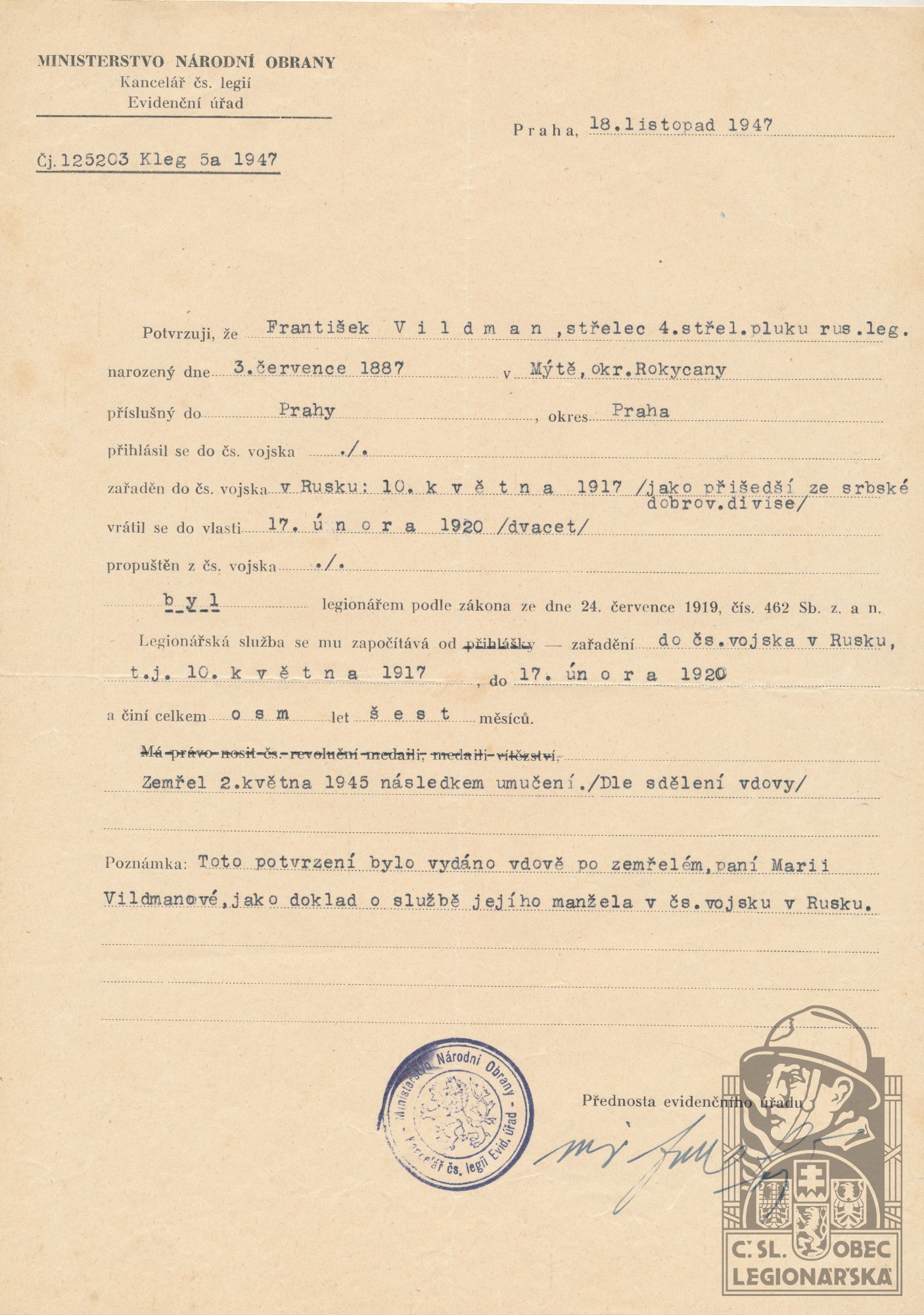 Převelen k útvaru: ( Čs. legie v Rusku )