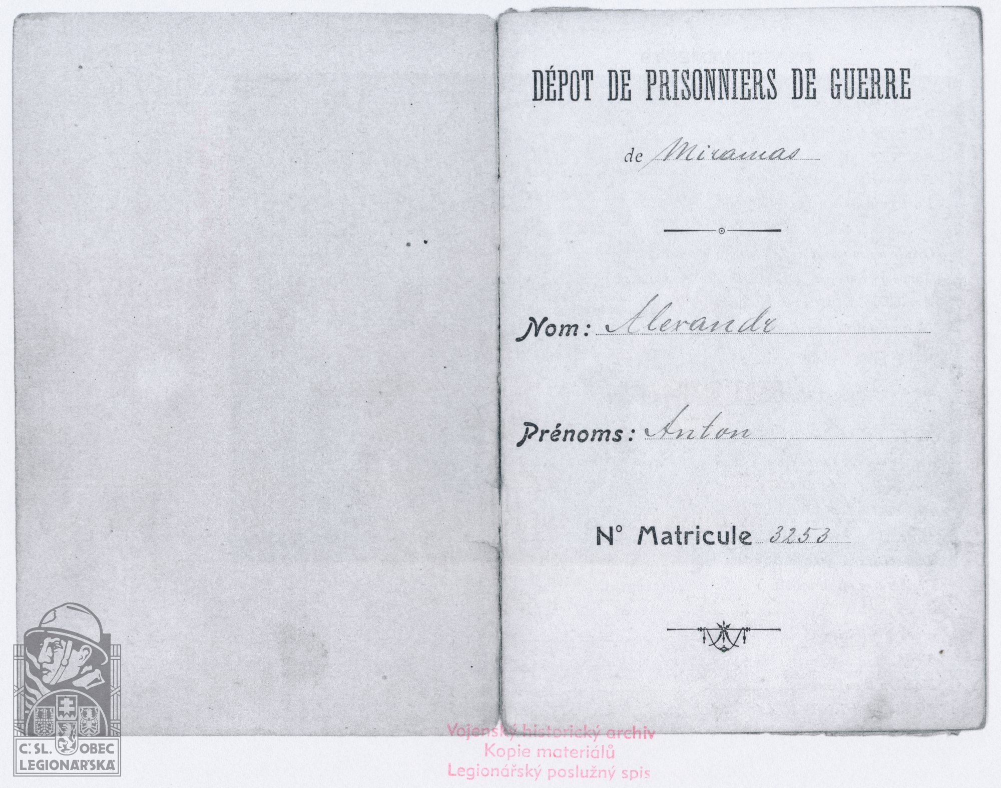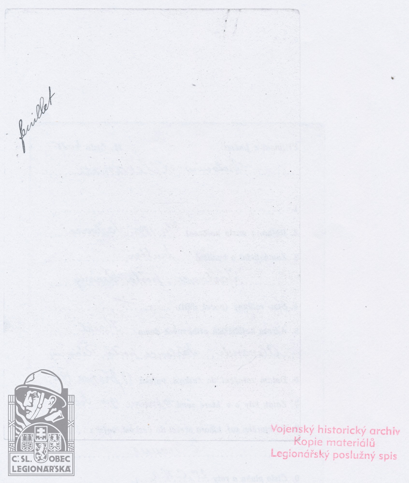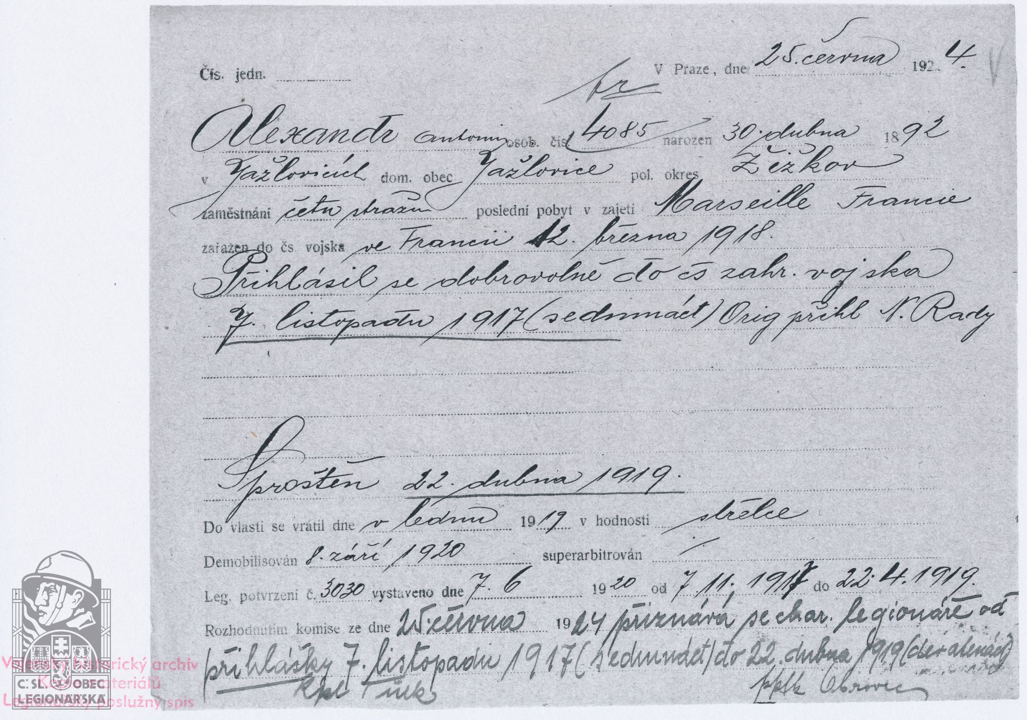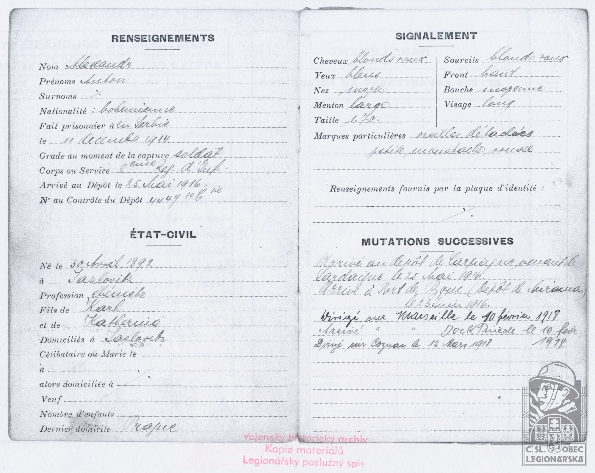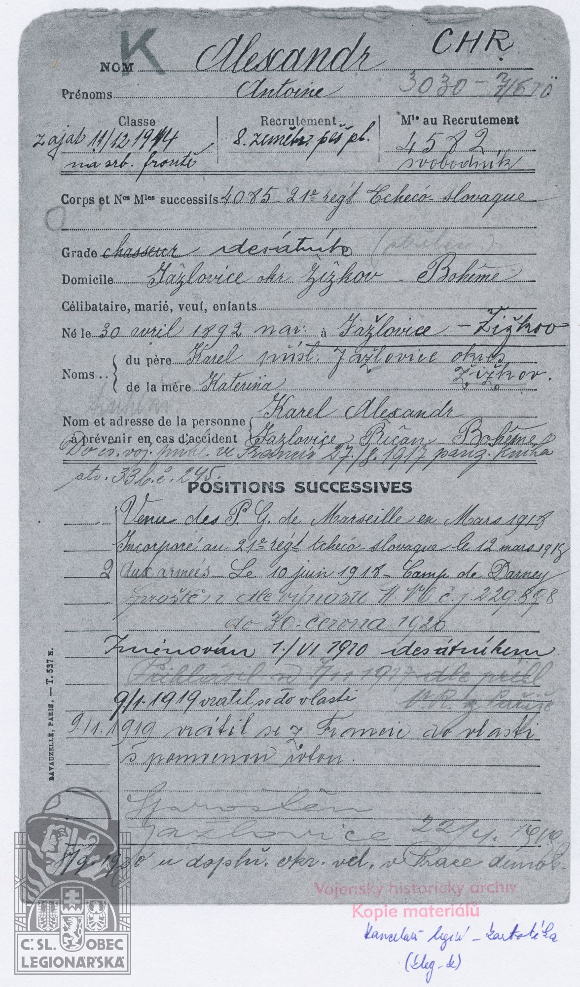 Jednotka v době zařazení:21.p.pl. ( Čs. legie v Francii )