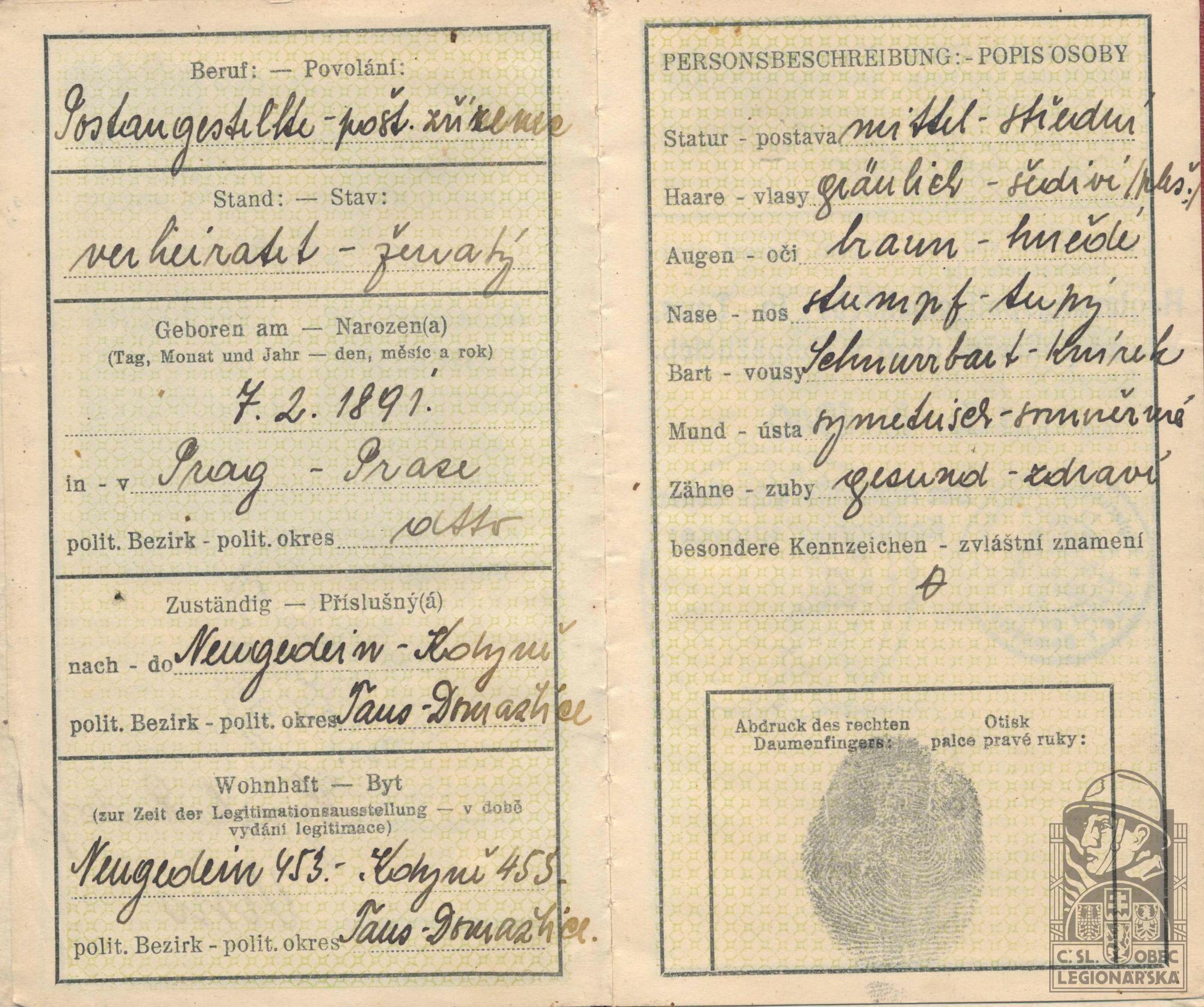 Zdroj informací: legionářský poslužný spis osobní karta legionáře
