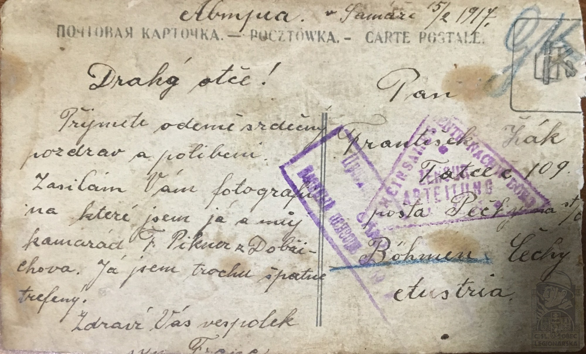 Jednotka v době zařazení:9.stř.pl. ( Čs. legie v Rusku )