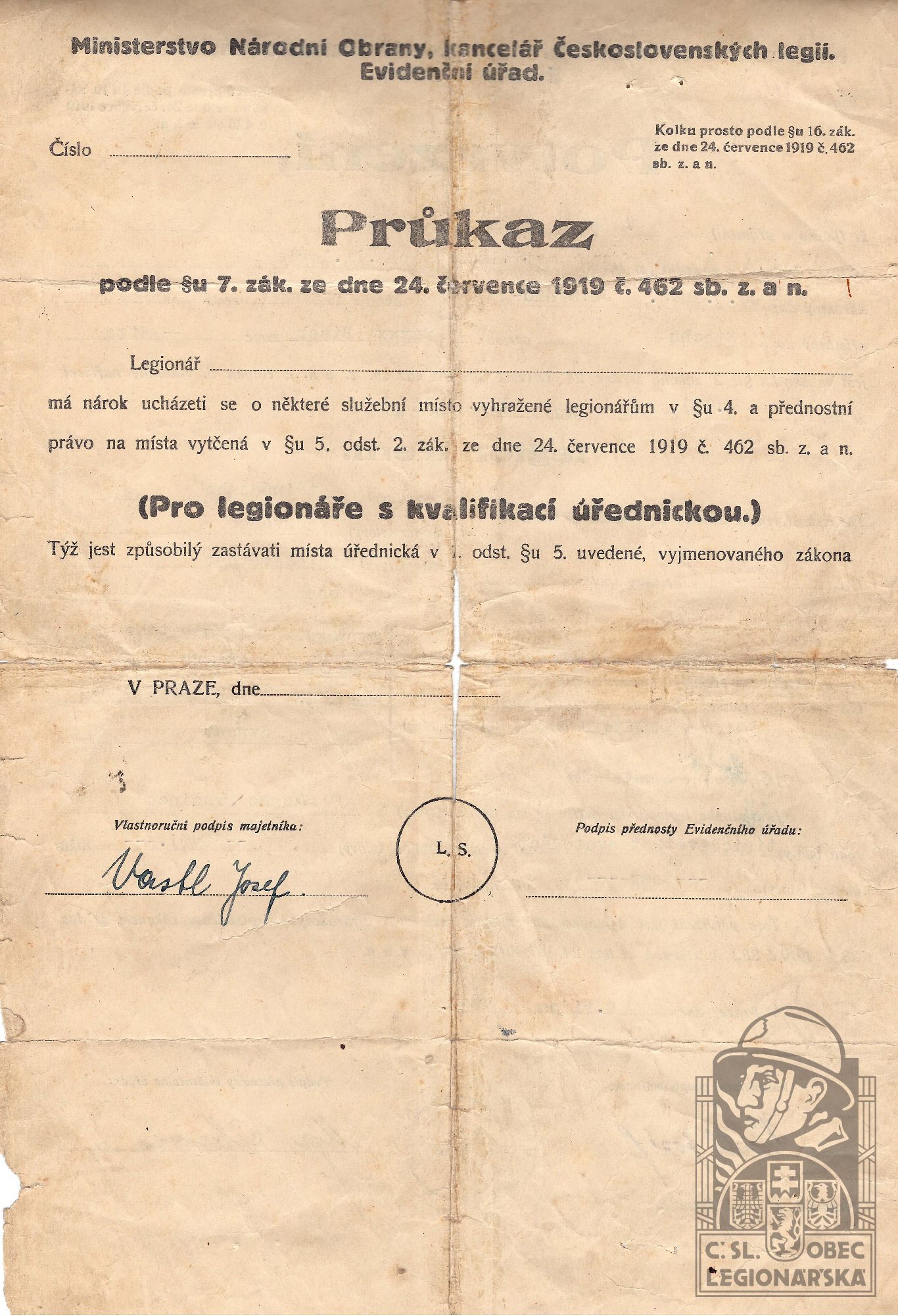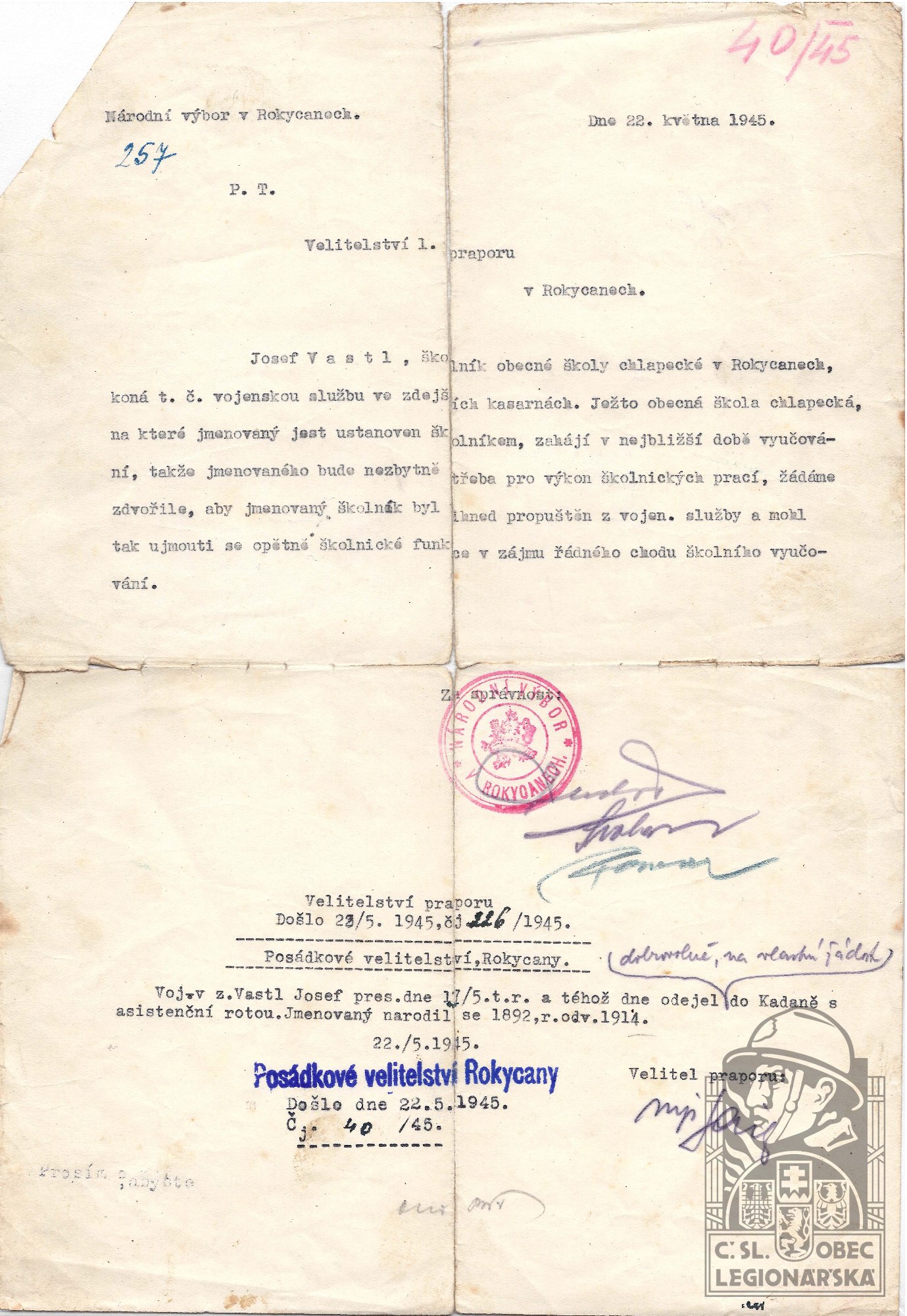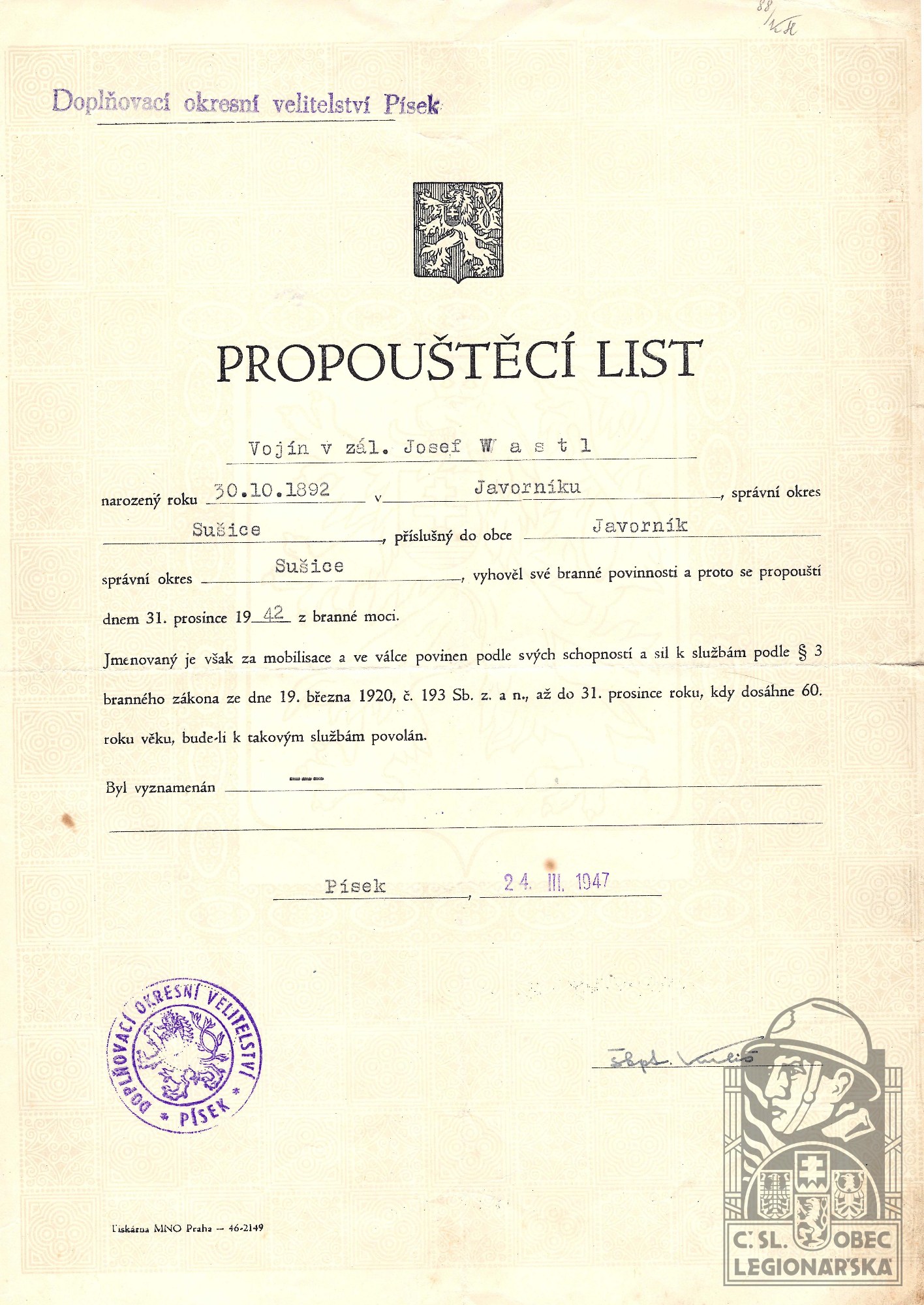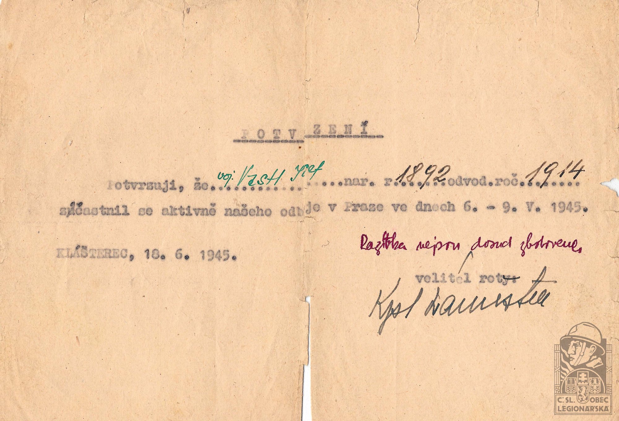 dokumenty spojené s osobou legionáře