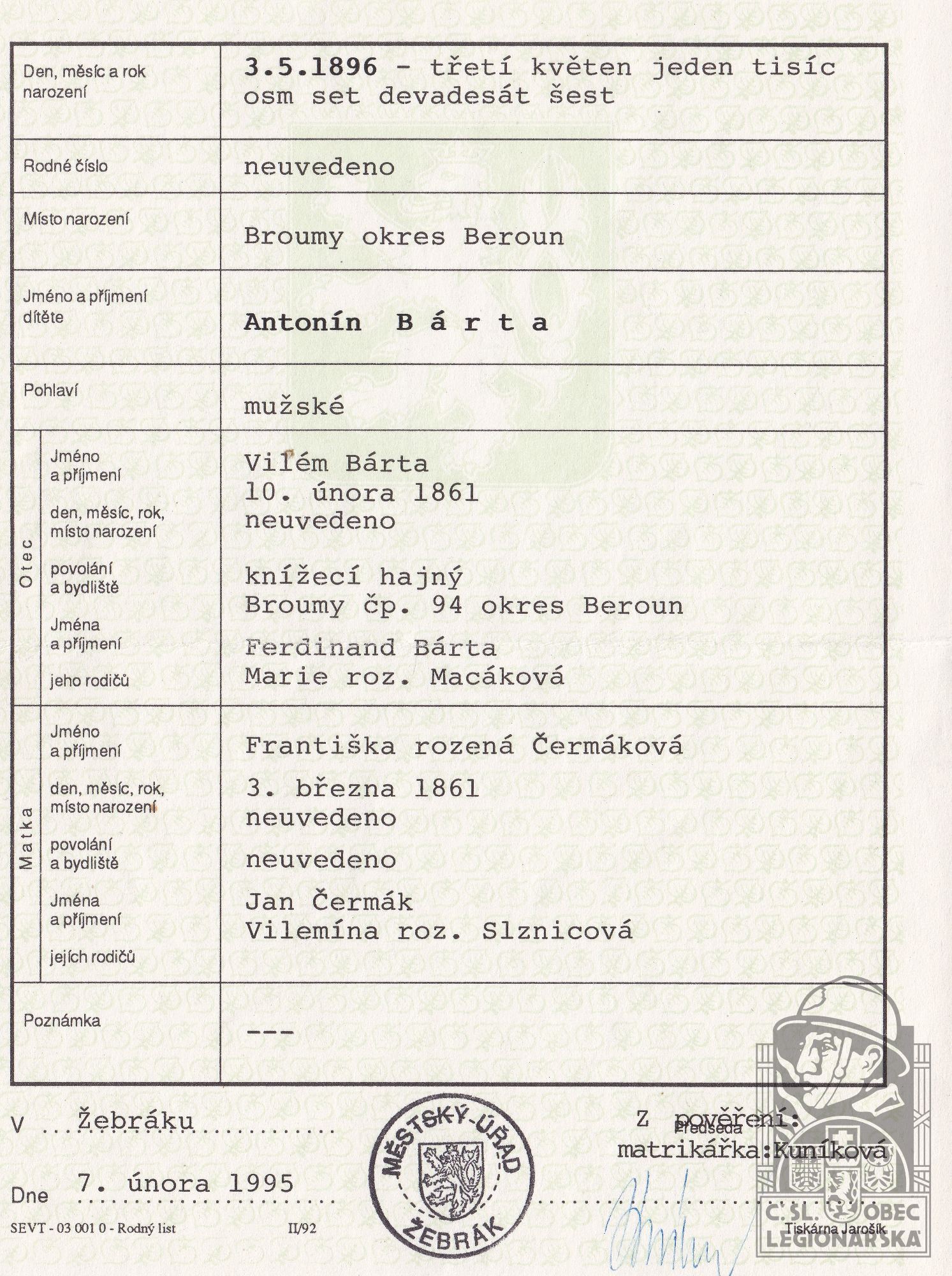 Zdroj informací: legionářský poslužný spis osobní karta legionáře
