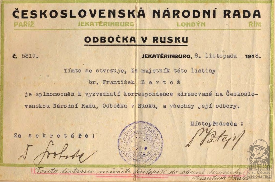 Jednotka v době zařazení:1.stř.pl. ( Čs. legie v Rusku )