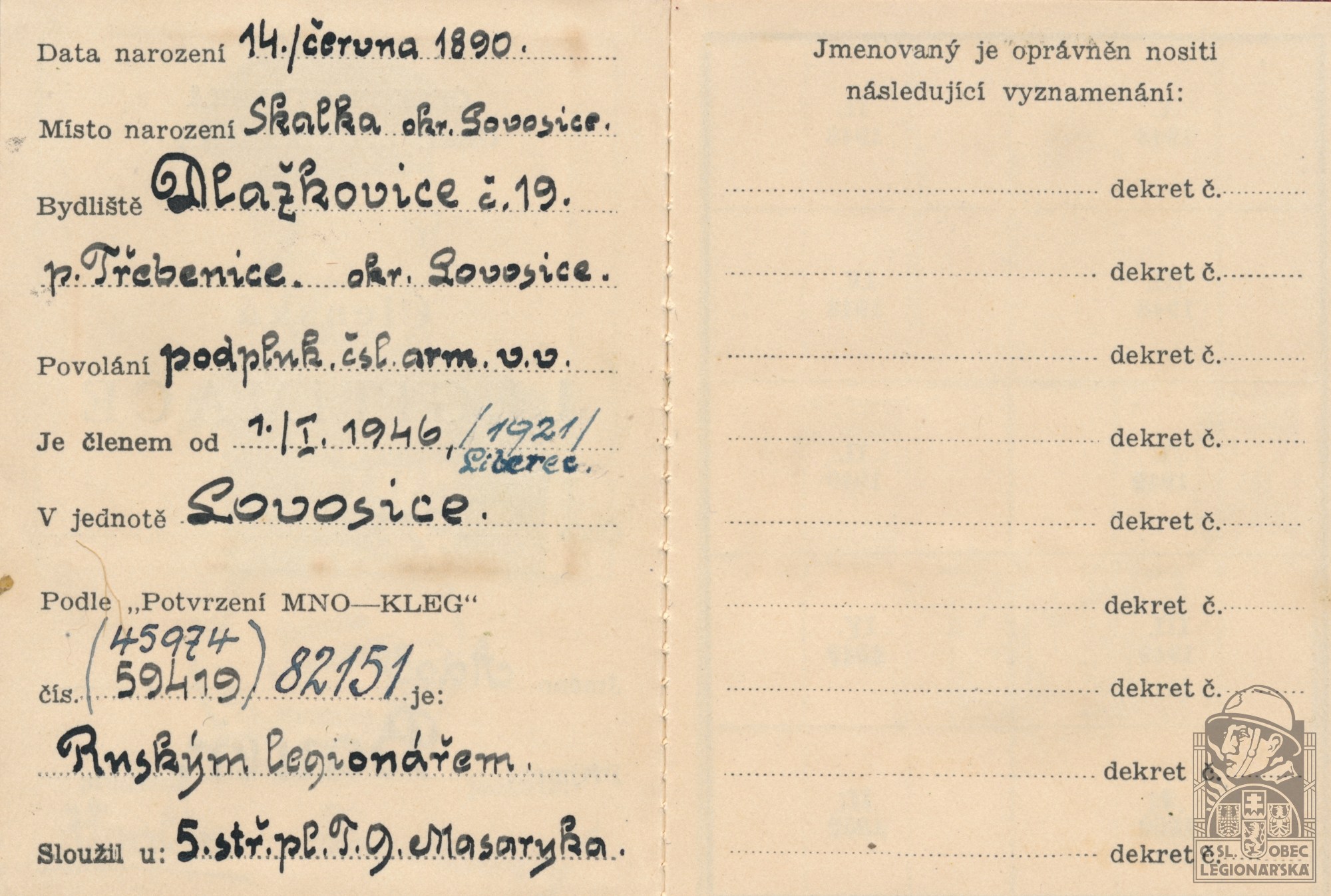 Zdroj informací: legionářský poslužný spis osobní karta legionáře