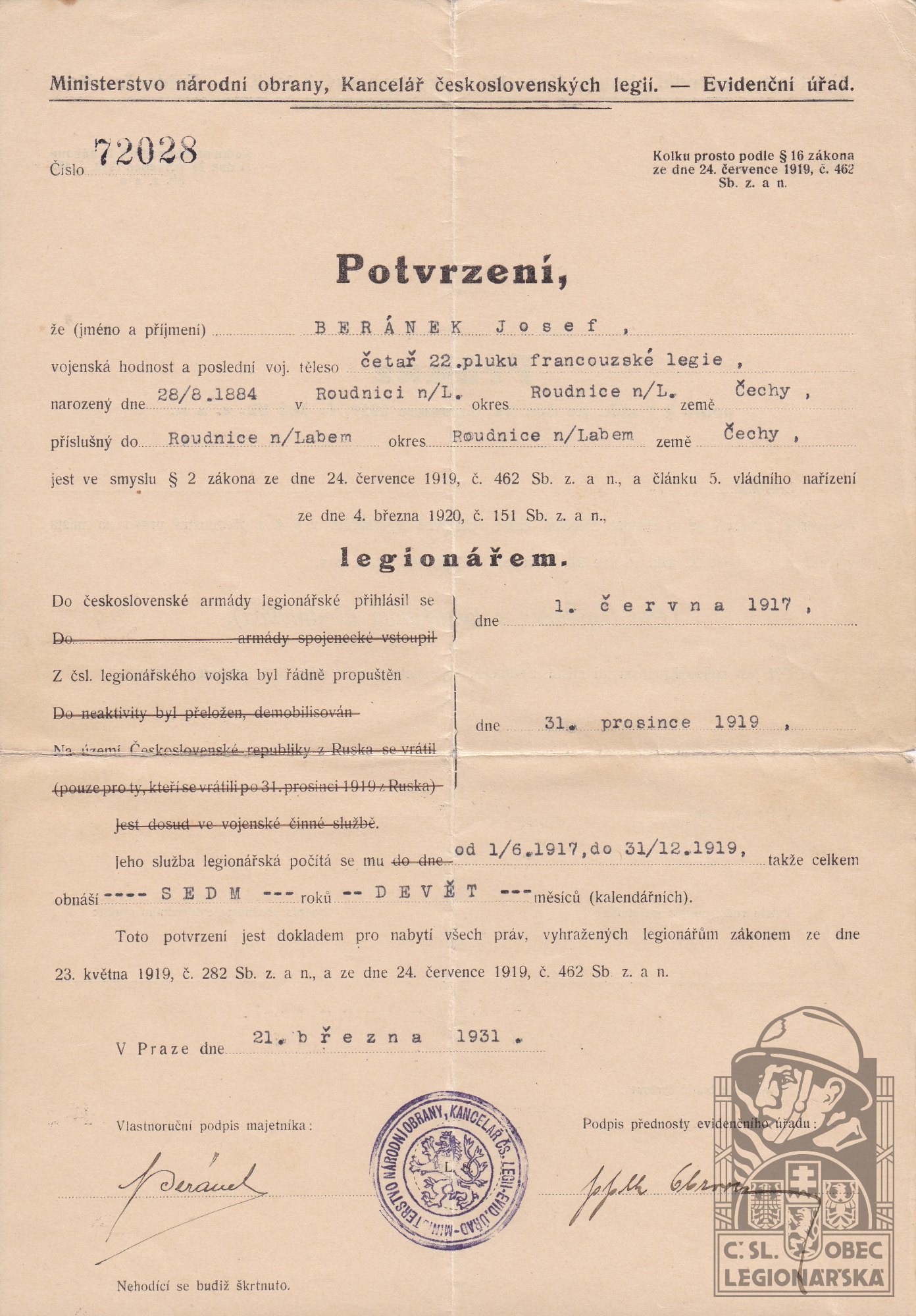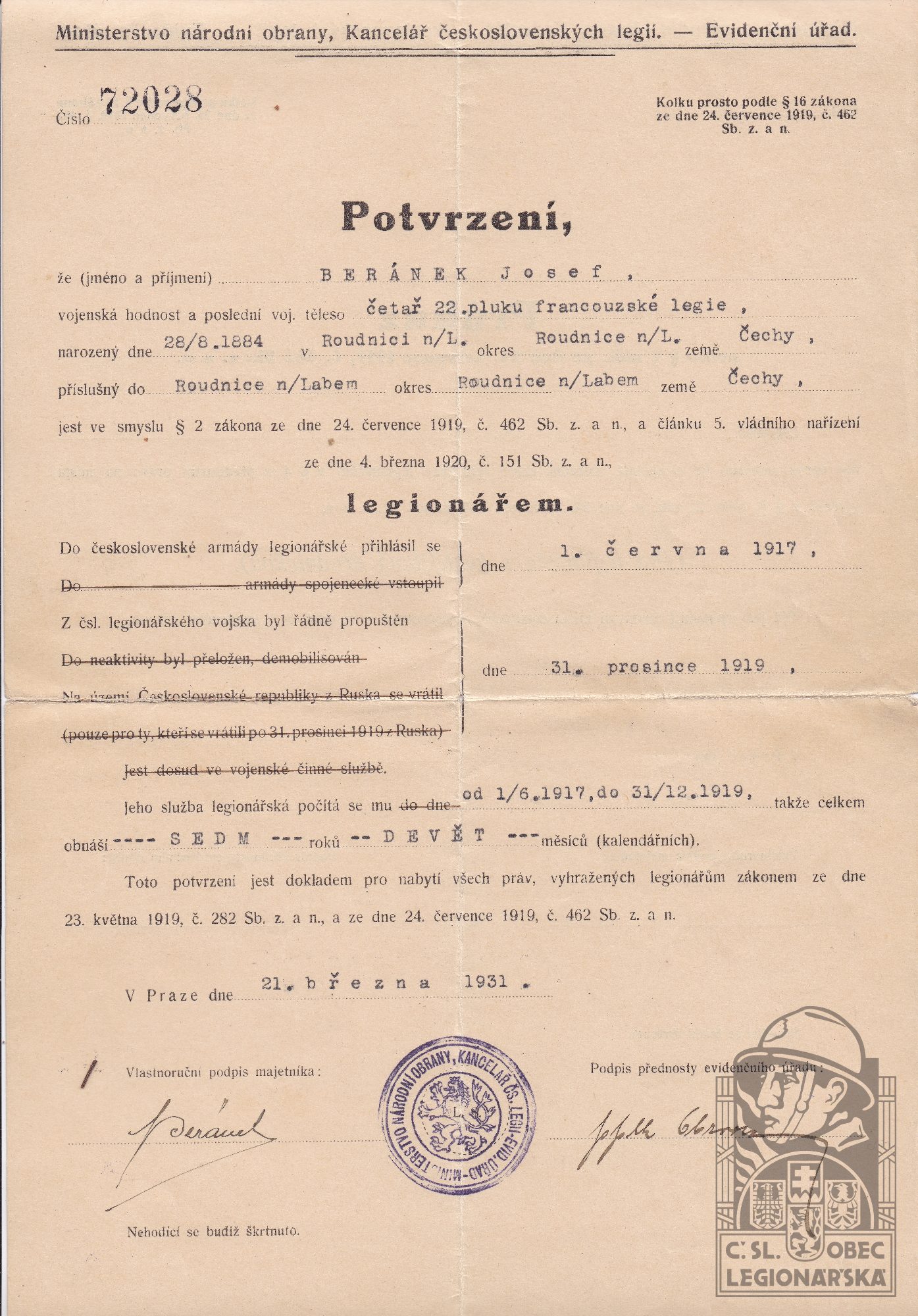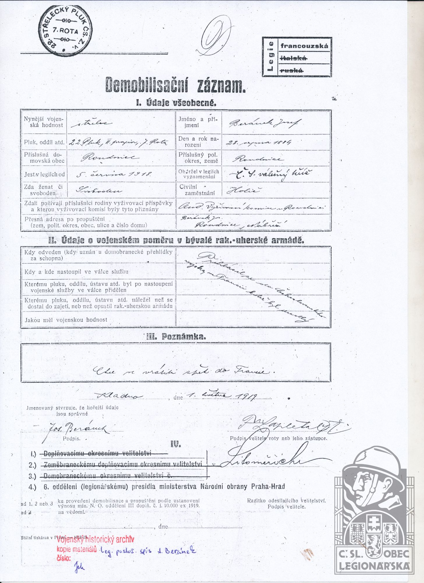 Konec v legiích:17.11.1920 ( Demobilizován )