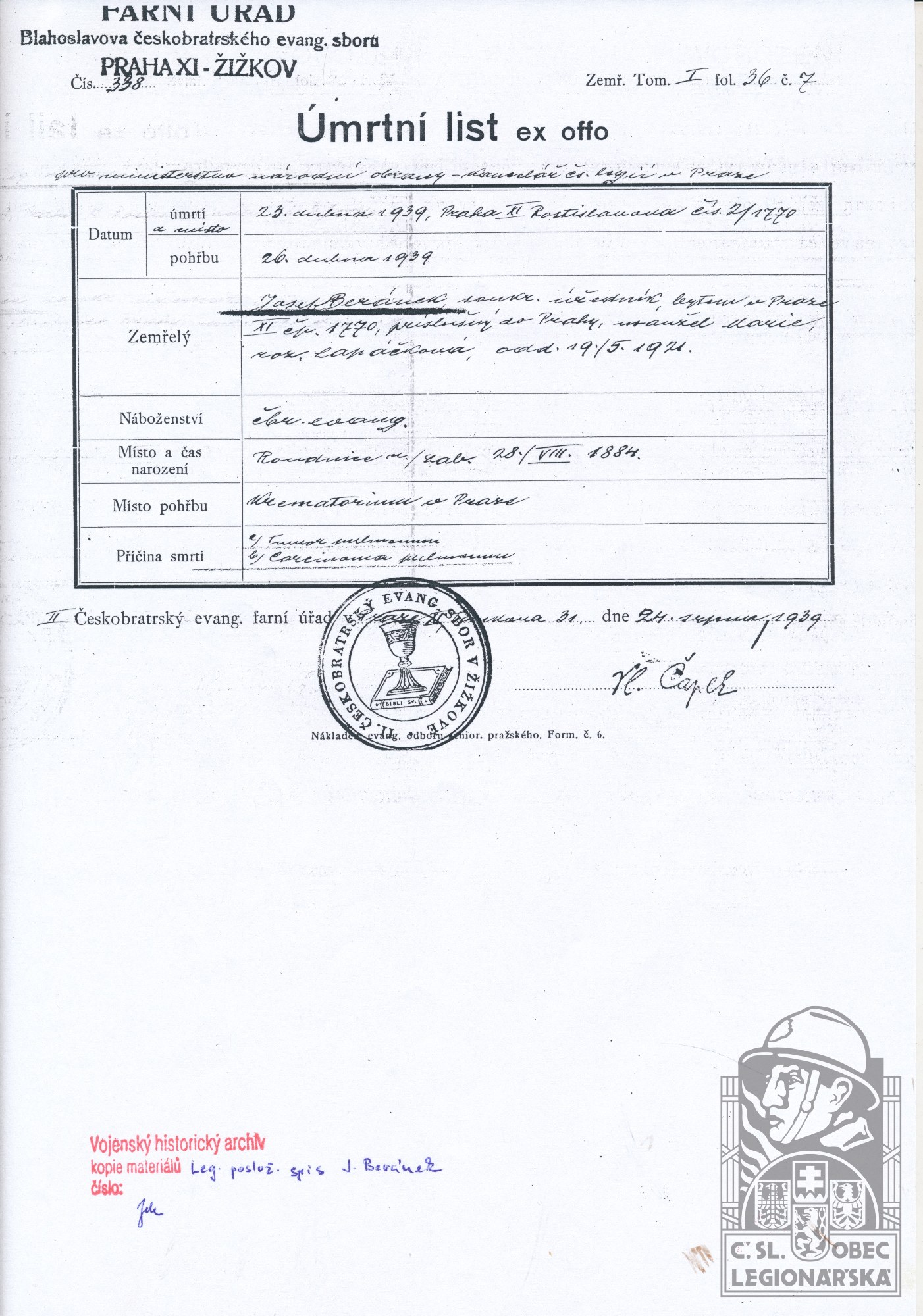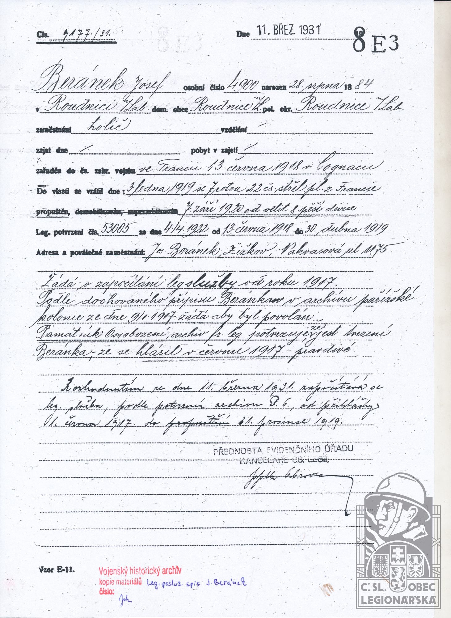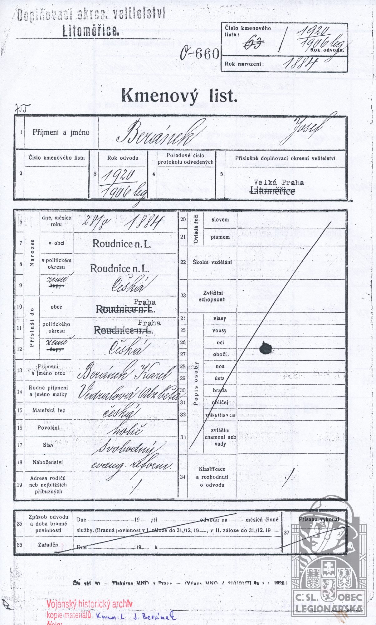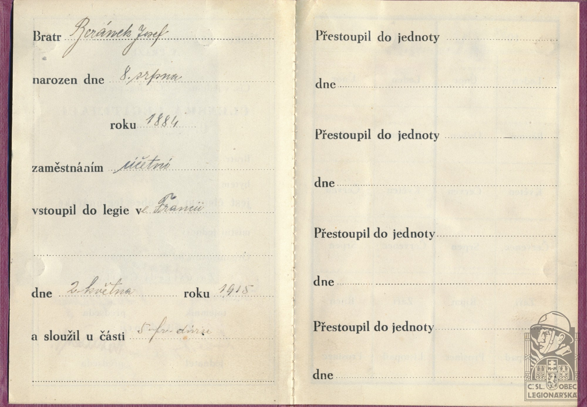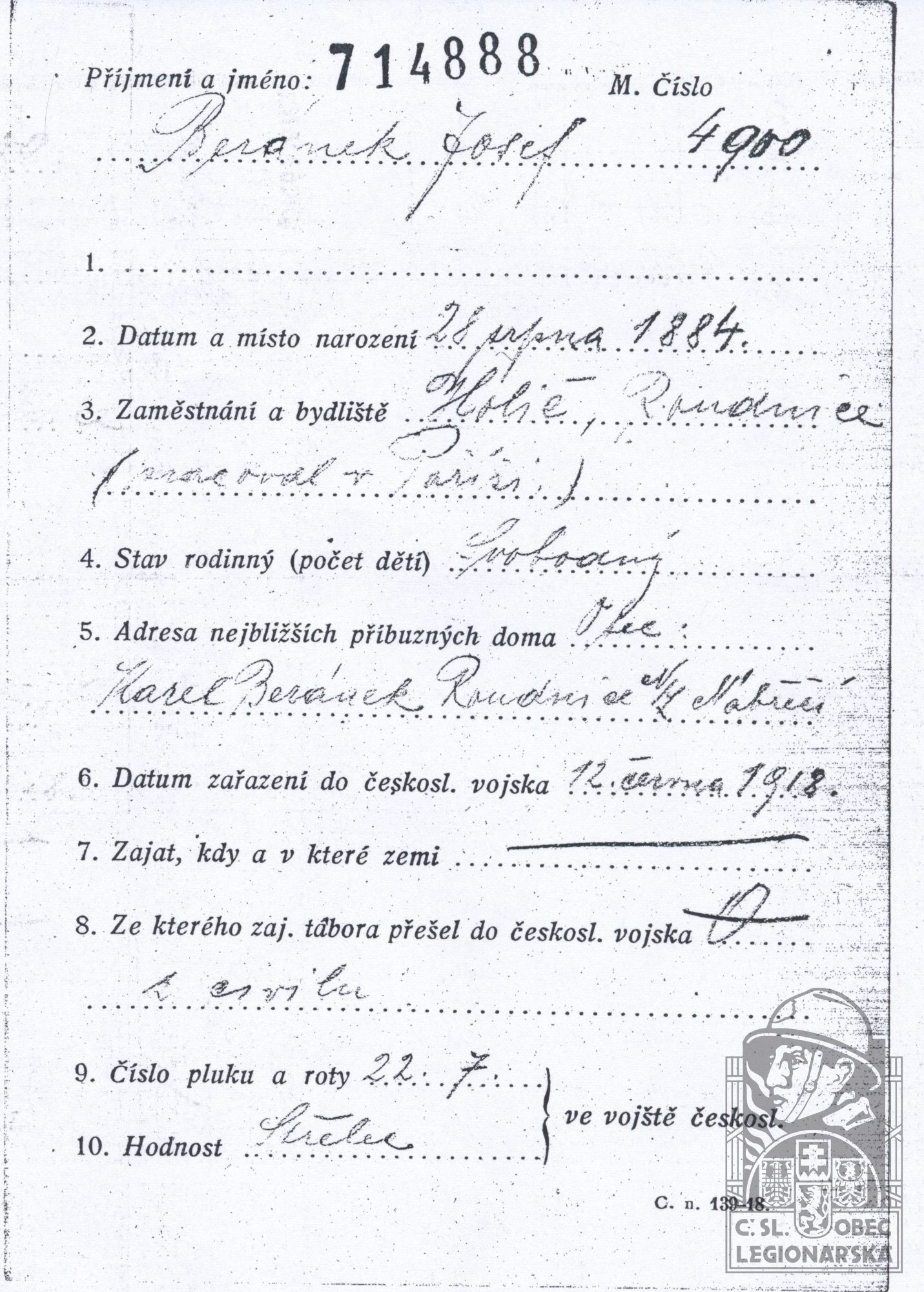 Zdroj informací: legionářský poslužný spis osobní karta legionáře